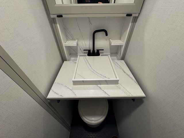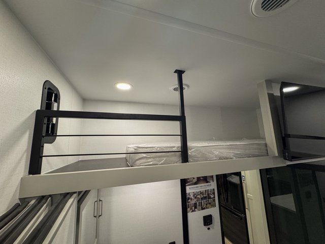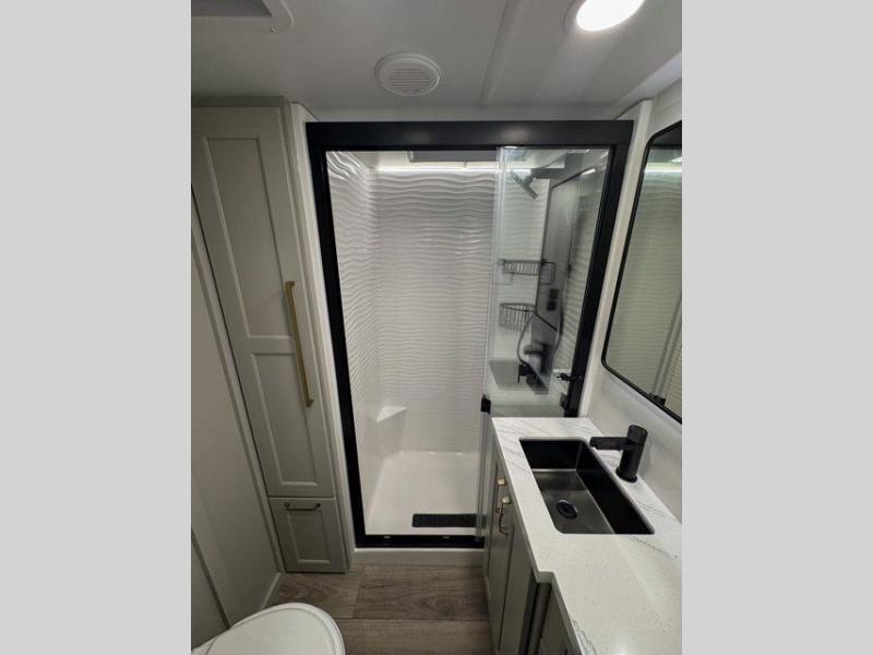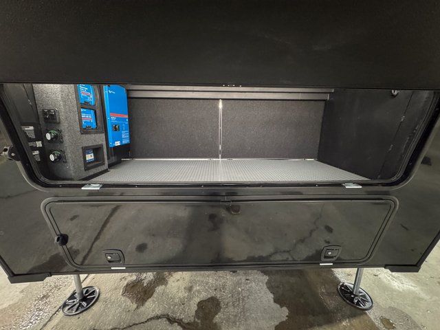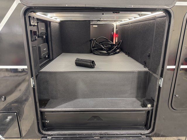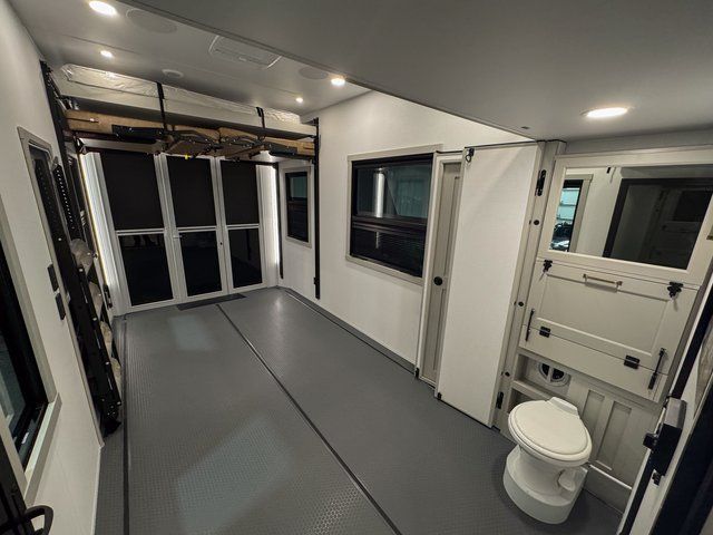 The massive 17-foot garage easily hauls motorcycles, ATVs, or side-by-sides. After unloading, it transforms into flexible living space with: