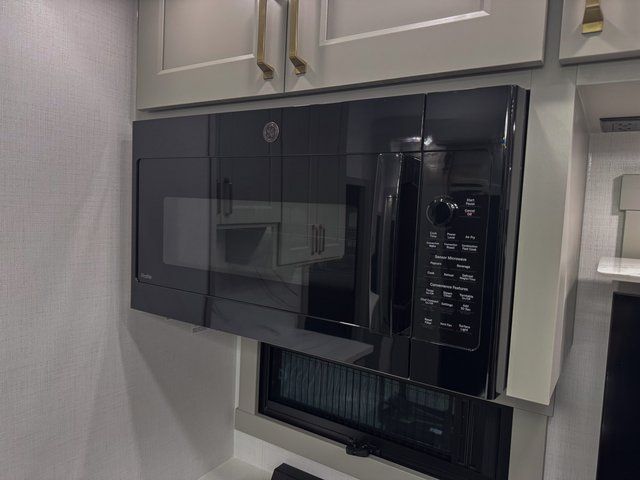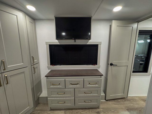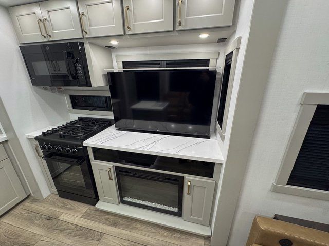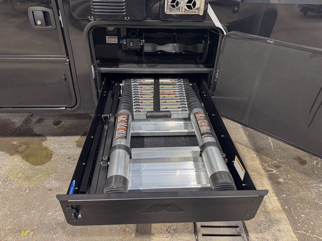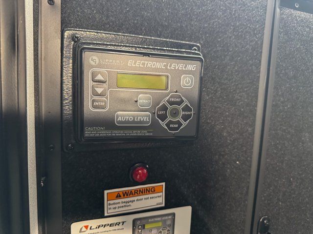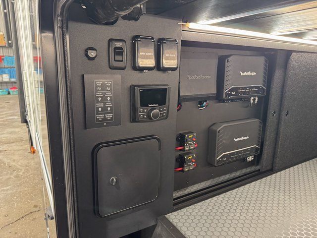 Enjoy dual opposing slides that open up the main living space. Relax in dual 2x recliners with heat and massage, positioned across from a televator TV and fireplace for ultimate comfort.