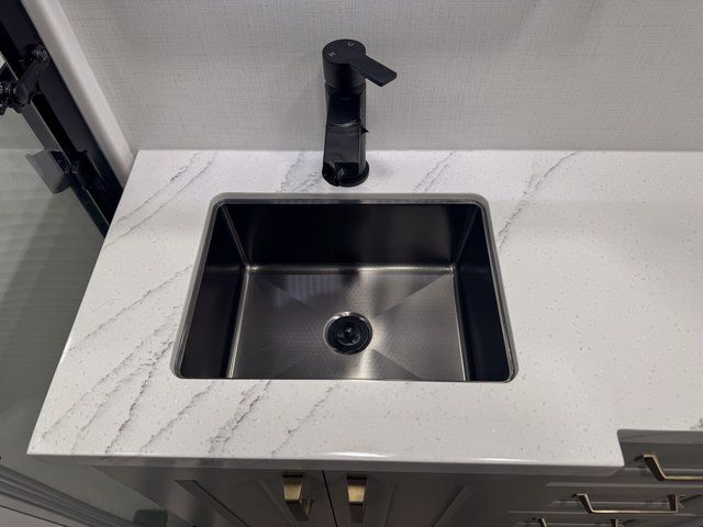 The spacious bath features a residential-style shower, solid surface countertops, recessed medicine cabinets, and modern finishes for everyday comfort.