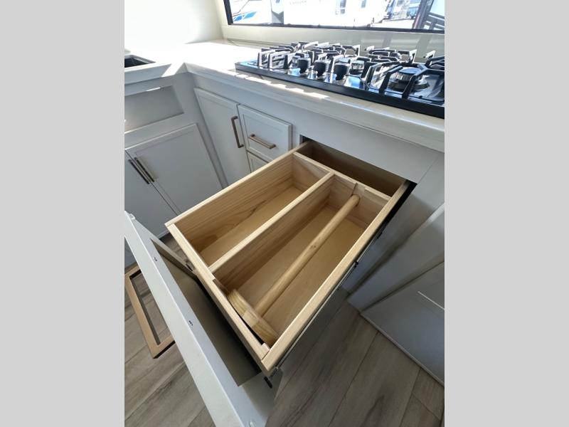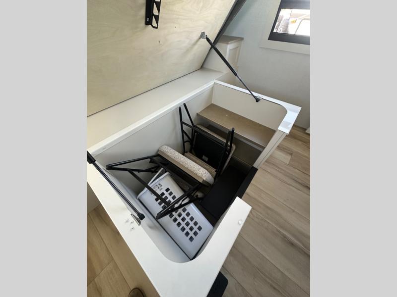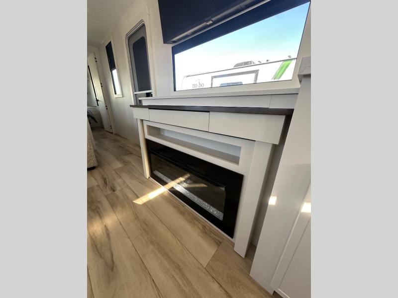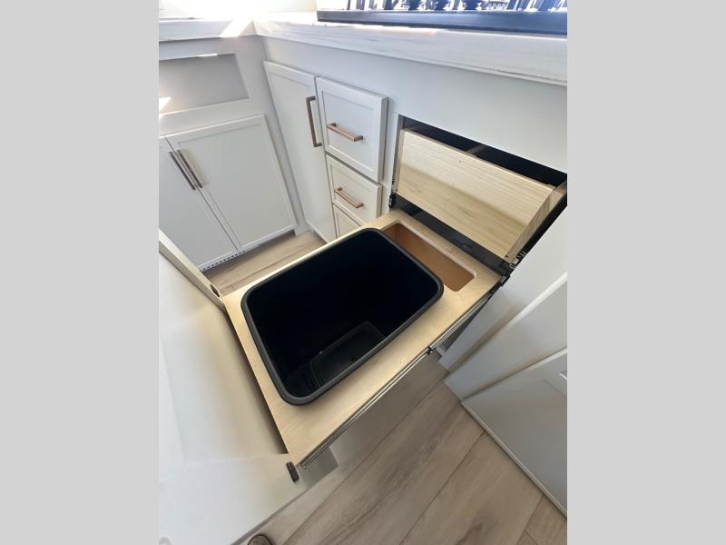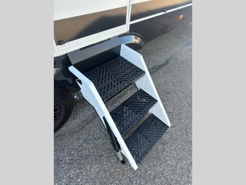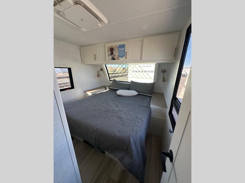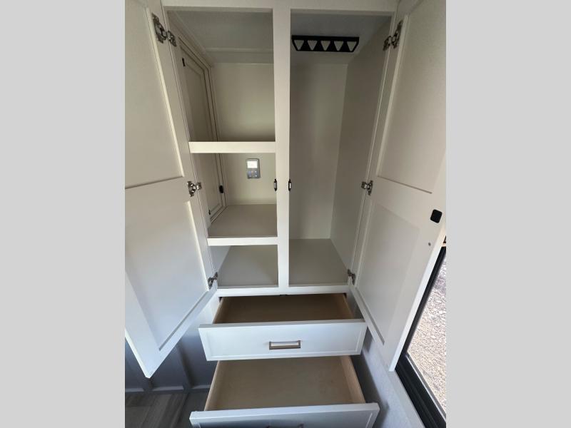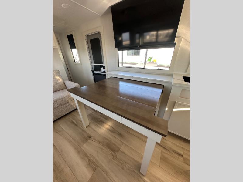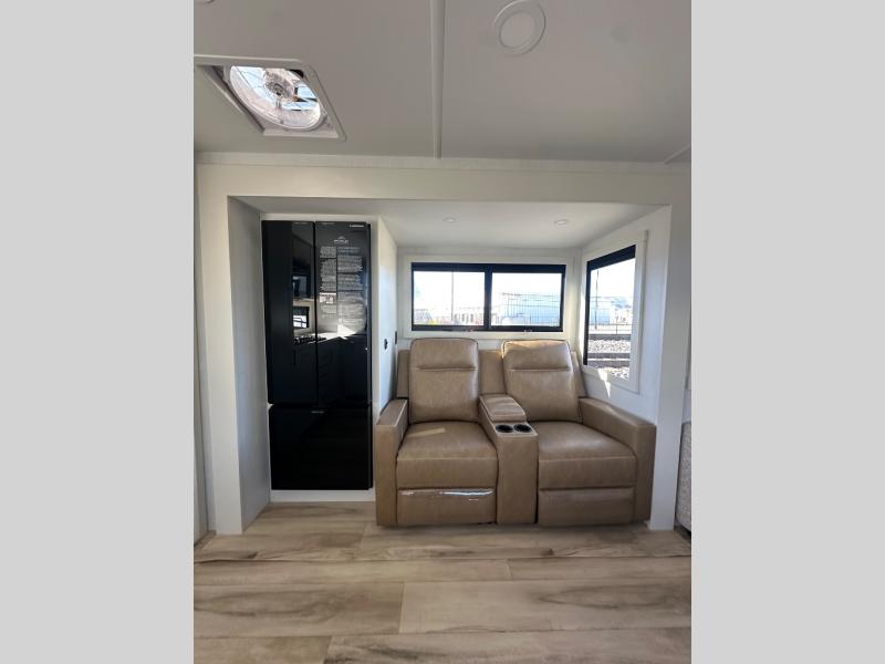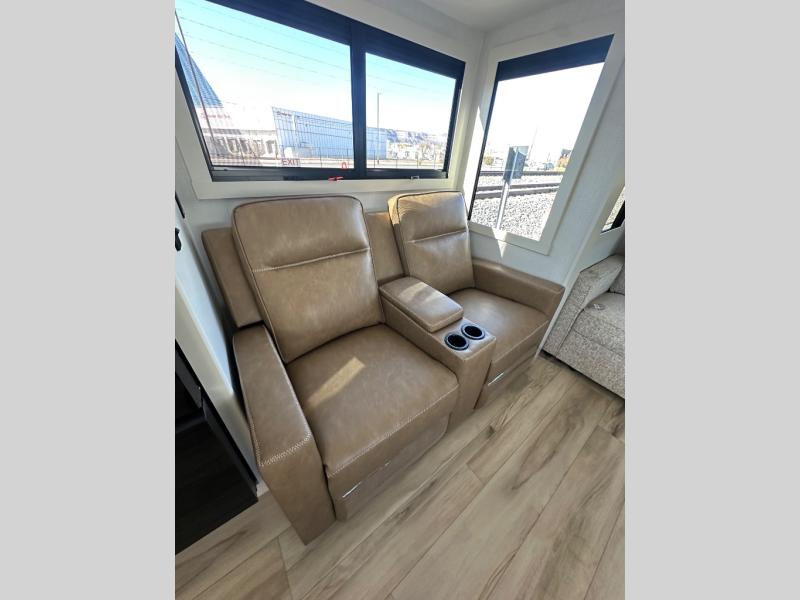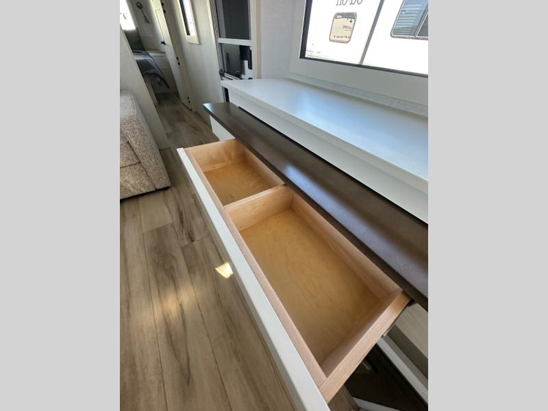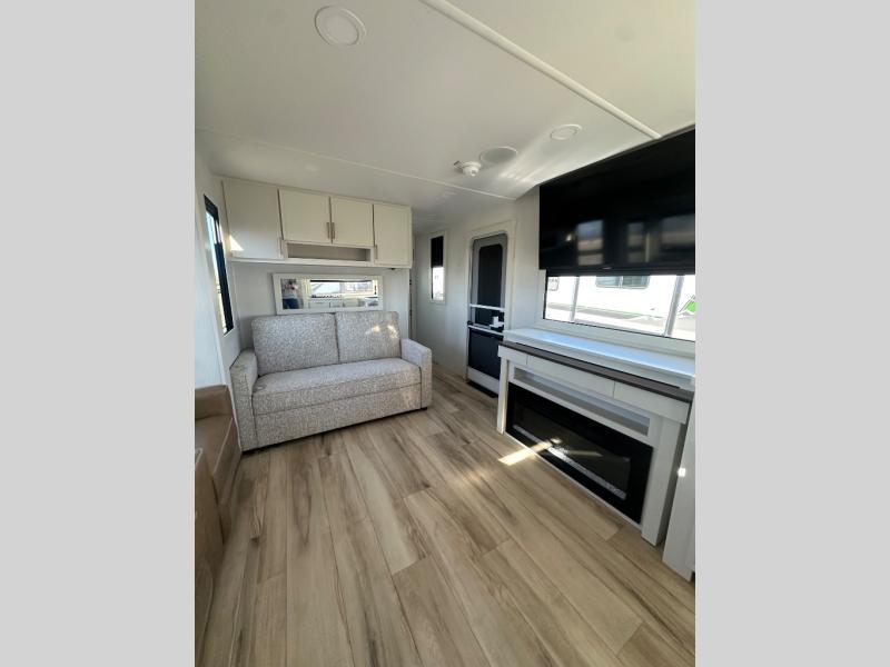 This travel trailer can comfortably sleep four with the king bed in the private bedroom and the tri-fold sofa in the main living area! The full bath features a spacious 42" x 30" shower with a built-in seat and Maxxair fan to name a few comforts. The front private bedroom features a 66" x 80" king bed with a MaxSpace Split-Level Wardrobe underneath to store shoes, clothes, and more! A slide out in the combined living area and rear kitchen makes your space more open, and you'll enjoy relaxing on the theater seating here in the evenings. The full kitchen includes a three burner stovetop, residential 30" convection microwave, 12 cu. ft. 12V refrigerator, plus a trash bin and Stow N' Go paper towel holder for added convenience. You can choose to eat outdoors under the 19' electric awning with LED lights or stay inside to dine at the pull-out dining table with a drawer for added storage!
