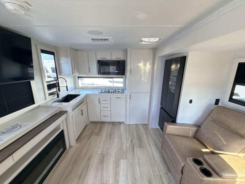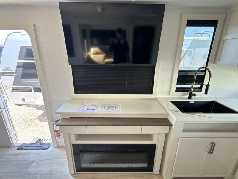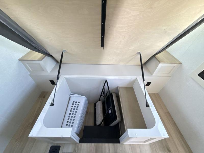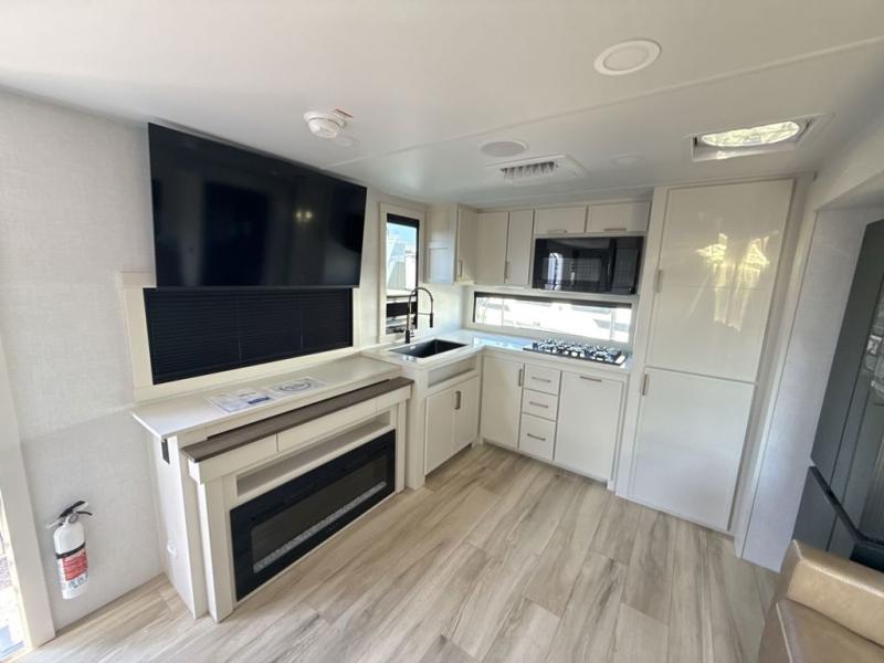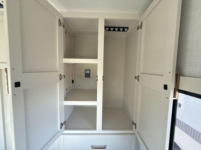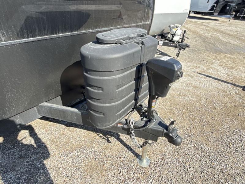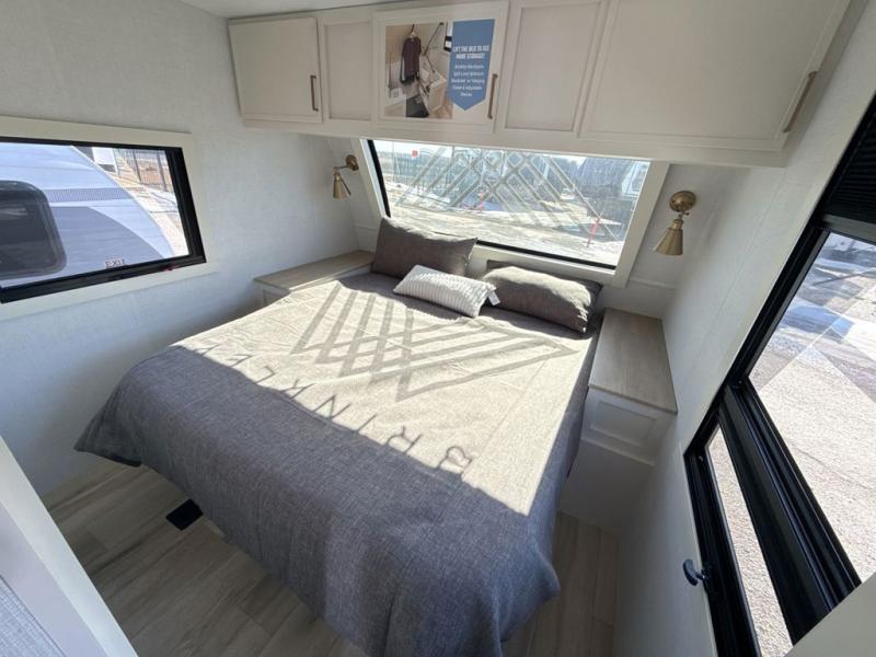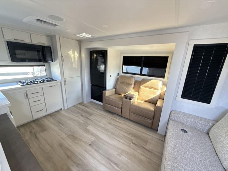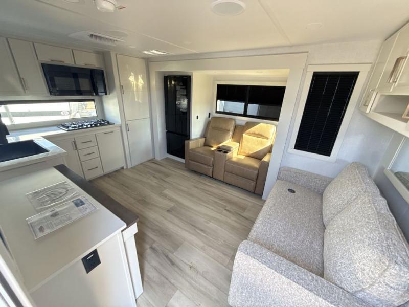 This travel trailer can comfortably sleep four with the king bed in the private bedroom and the tri-fold sofa in the main living area! The full bath features a spacious 42" x 30" shower with a built-in seat and Maxxair fan to name a few comforts. The front private bedroom features a 66" x 80" king bed with a MaxSpace Split-Level Wardrobe underneath to store shoes, clothes, and more! A slide out in the combined living area and rear kitchen makes your space more open, and you'll enjoy relaxing on the theater seating here in the evenings. The full kitchen includes a three burner stovetop, residential 30" convection microwave, 12 cu. ft. 12V refrigerator, plus a trash bin and Stow N' Go paper towel holder for added convenience. You can choose to eat outdoors under the 18' electric awning with LED lights or stay inside to dine at the pull-out dining table with a drawer for added storage!