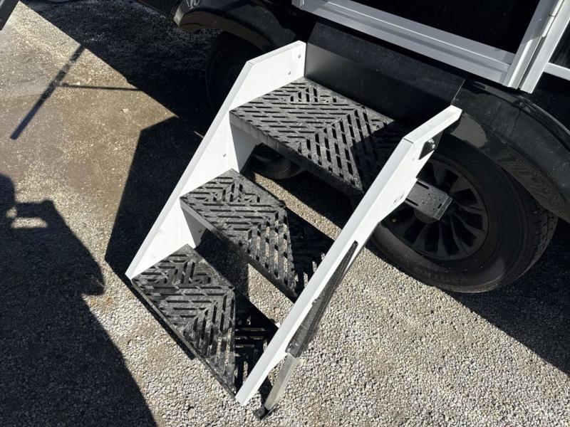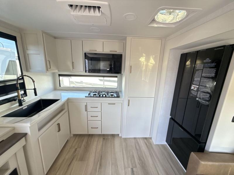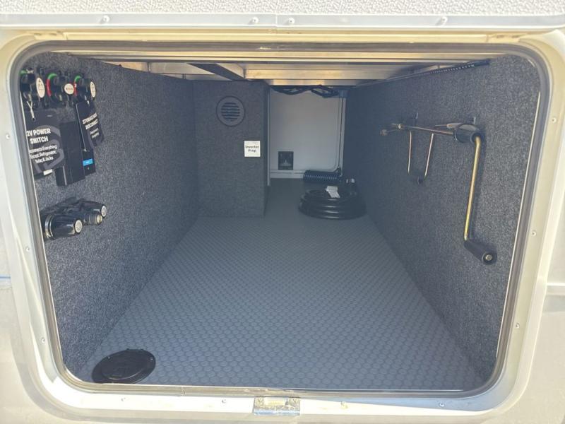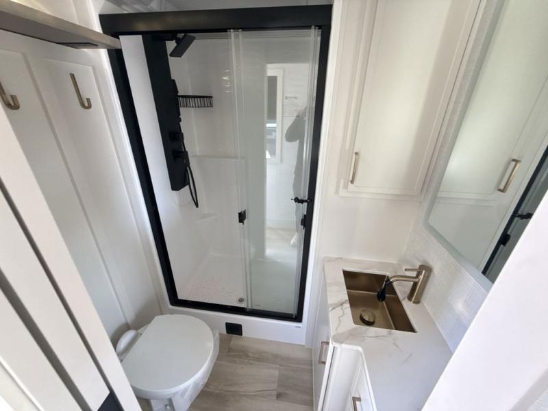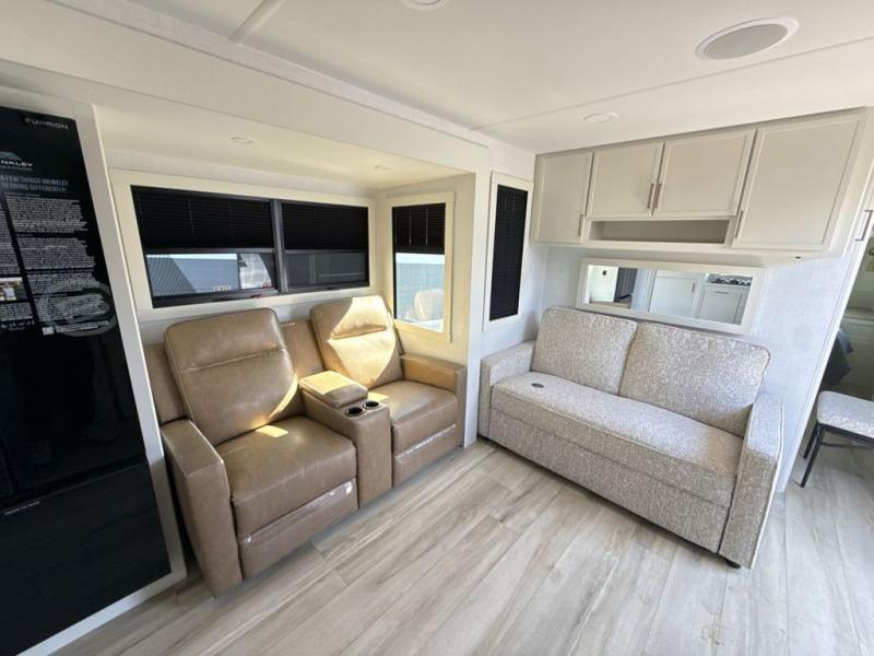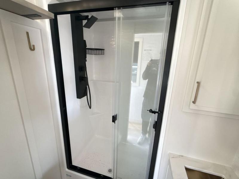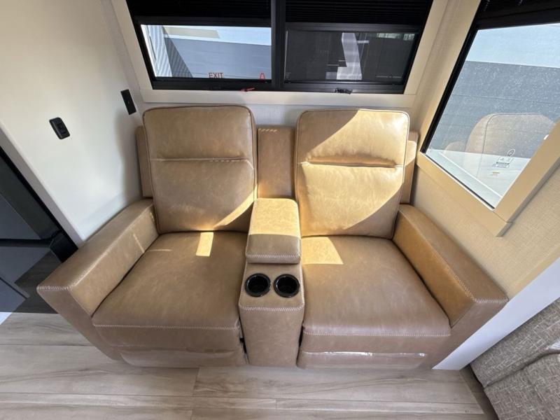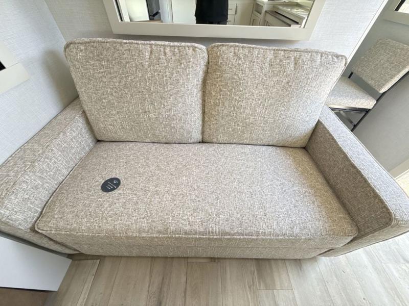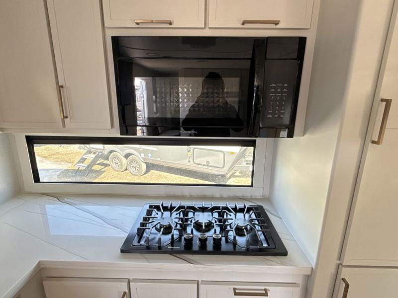 This travel trailer can comfortably sleep four with the king bed in the private bedroom and the tri-fold sofa in the main living area! The full bath features a spacious 42" x 30" shower with a built-in seat and Maxxair fan to name a few comforts. The front private bedroom features a 66" x 80" king bed with a MaxSpace Split-Level Wardrobe underneath to store shoes, clothes, and more! A slide out in the combined living area and rear kitchen makes your space more open, and you'll enjoy relaxing on the theater seating here in the evenings. The full kitchen includes a three burner stovetop, residential 30" convection microwave, 12 cu. ft. 12V refrigerator, plus a trash bin and Stow N' Go paper towel holder for added convenience. You can choose to eat outdoors under the 18' electric awning with LED lights or stay inside to dine at the pull-out dining table with a drawer for added storage!