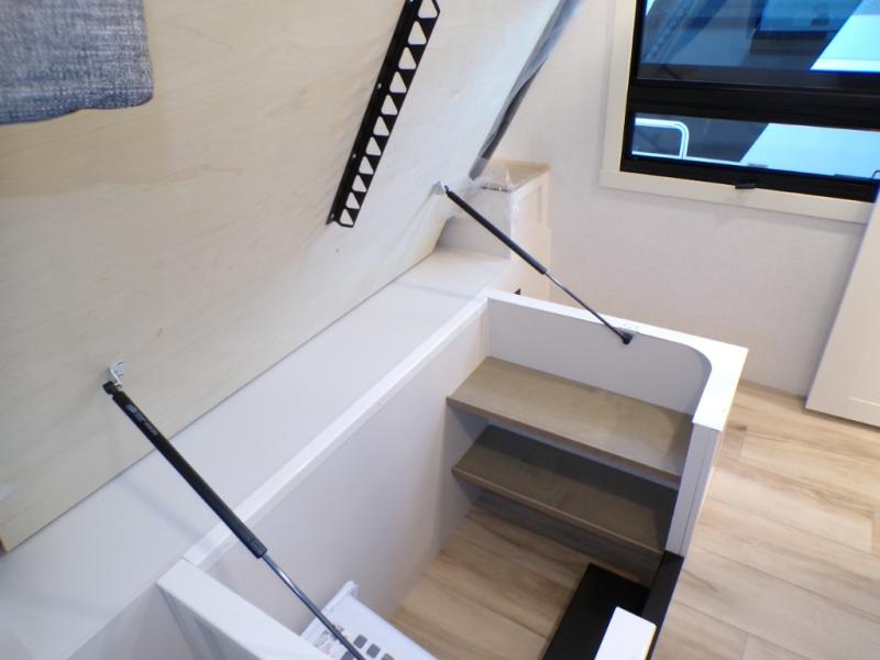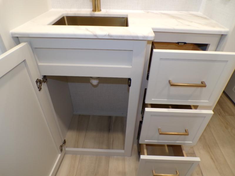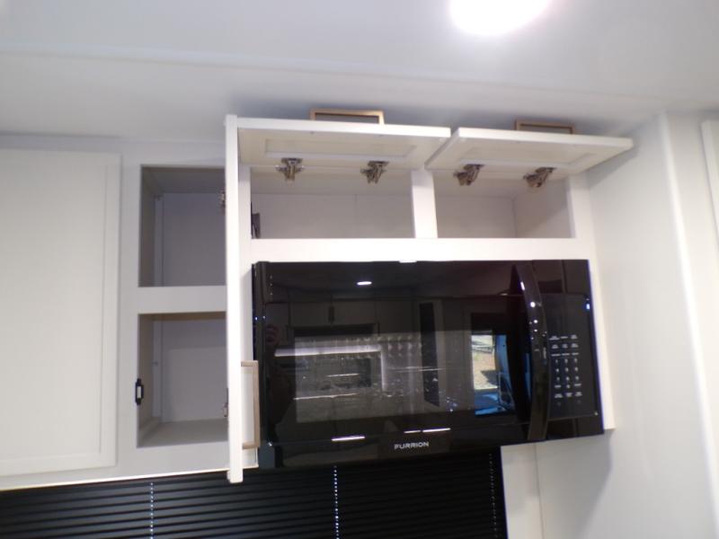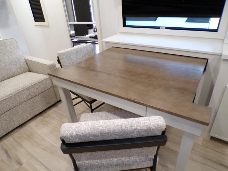 This travel trailer can comfortably sleep four with the king bed in the private bedroom and the tri-fold sofa in the main living area! The full bath features a spacious 42" x 30" shower with a built-in seat and Maxxair fan to name a few comforts. The front private bedroom features a 66" x 80" king bed with a MaxSpace Split-Level Wardrobe underneath to store shoes, clothes, and more! A slide out in the combined living area and rear kitchen makes your space more open, and you'll enjoy relaxing on the theater seating here in the evenings. The full kitchen includes a three burner stovetop, residential 30" convection microwave, 12 cu. ft. 12V refrigerator, plus a trash bin and Stow N' Go paper towel holder for added convenience. You can choose to eat outdoors under the 18' electric awning with LED lights or stay inside to dine at the pull-out dining table with a drawer for added storage!