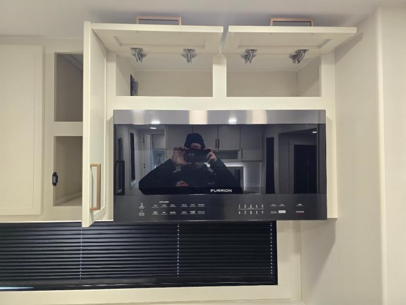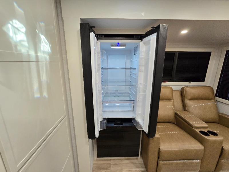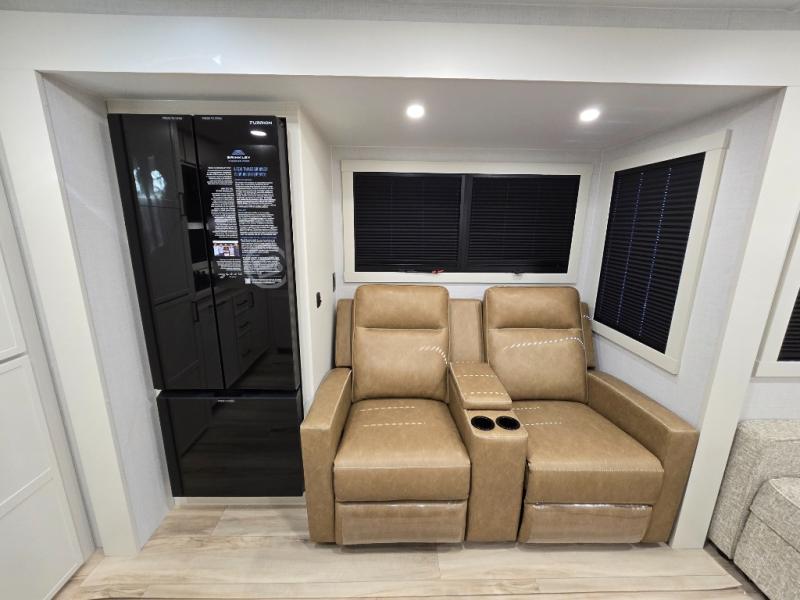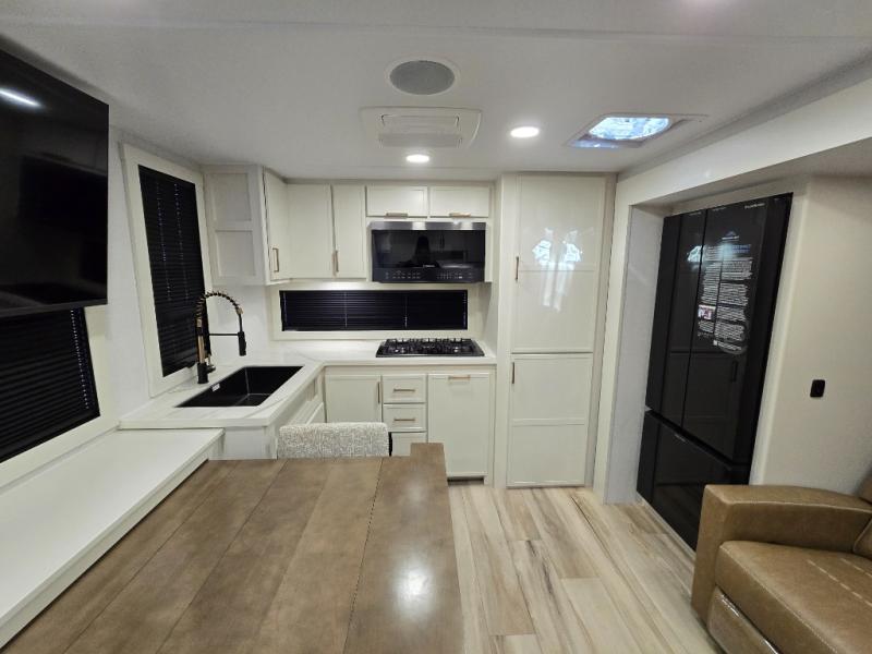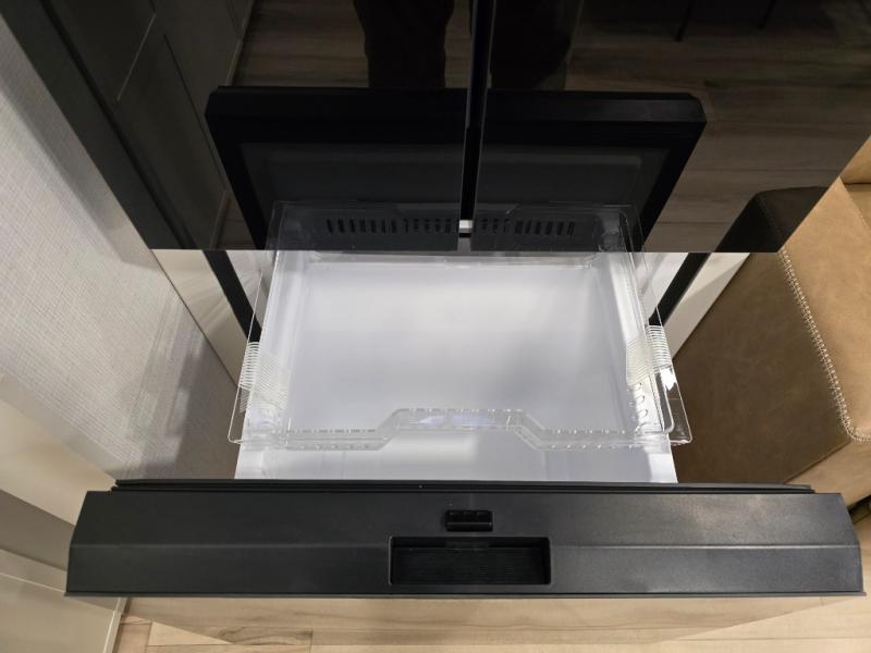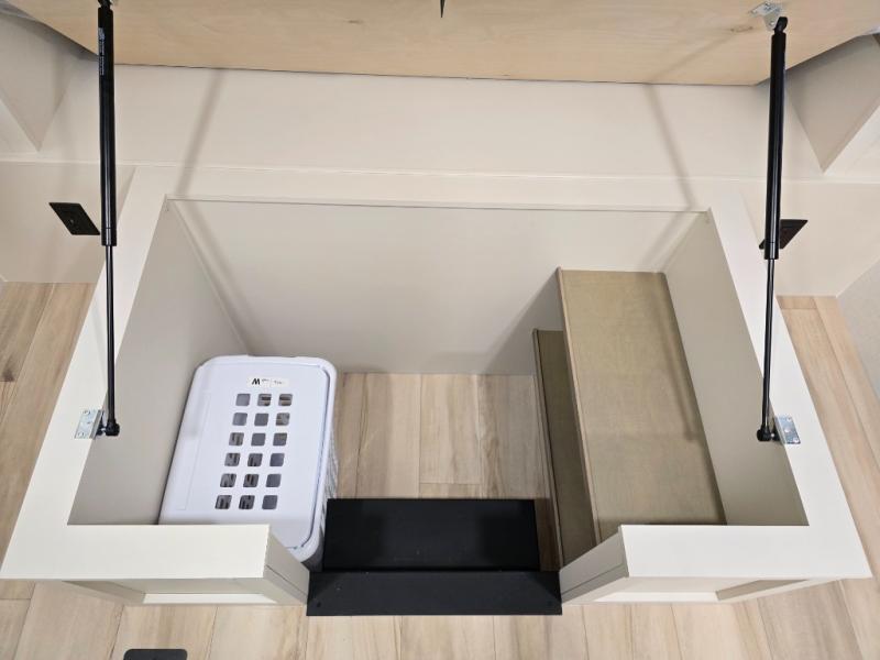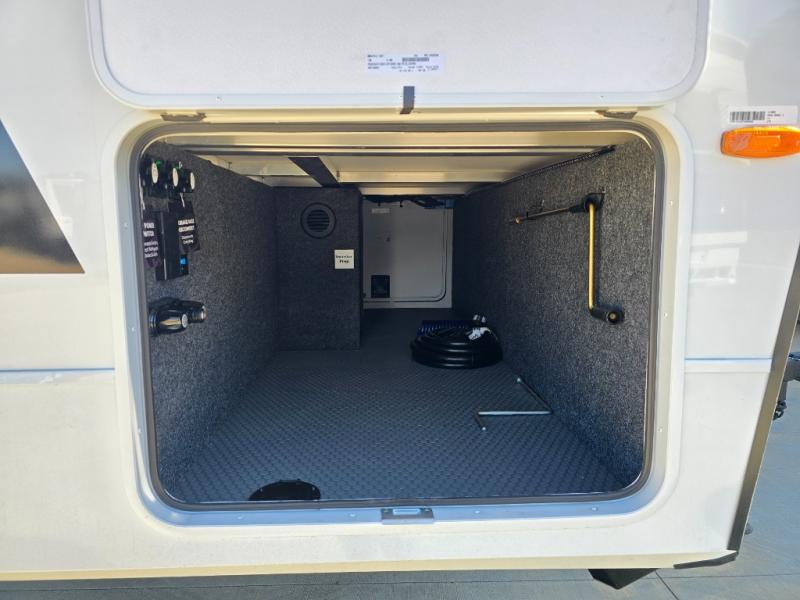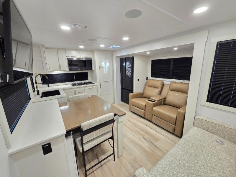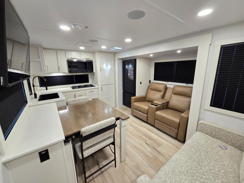 This travel trailer can comfortably sleep four with the king bed in the private bedroom and the tri-fold sofa in the main living area! The full bath features a spacious 42" x 30" shower with a built-in seat and Maxxair fan to name a few comforts. The front private bedroom features a 66" x 80" king bed with a MaxSpace Split-Level Wardrobe underneath to store shoes, clothes, and more! A slide out in the combined living area and rear kitchen makes your space more open, and you'll enjoy relaxing on the theater seating here in the evenings. The full kitchen includes a three burner stovetop, residential 30" convection microwave, 12 cu. ft. 12V refrigerator, plus a trash bin and Stow N' Go paper towel holder for added convenience. You can choose to eat outdoors under the 18' electric awning with LED lights or stay inside to dine at the pull-out dining table with a drawer for added storage!