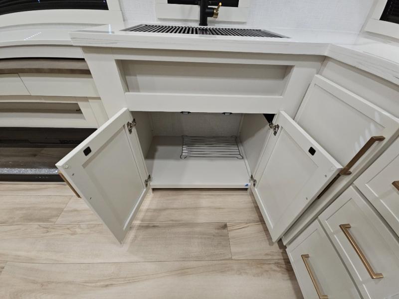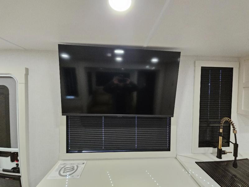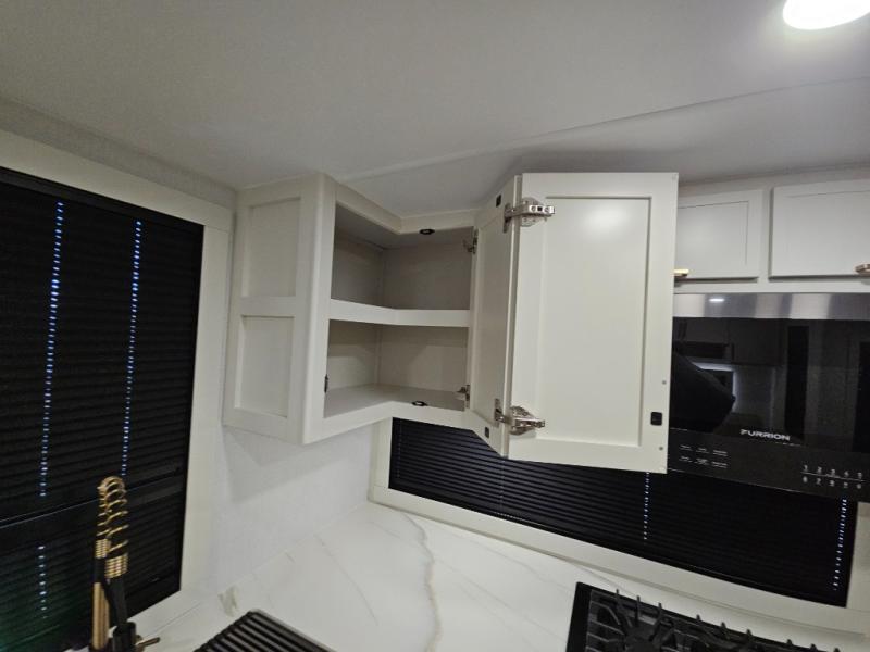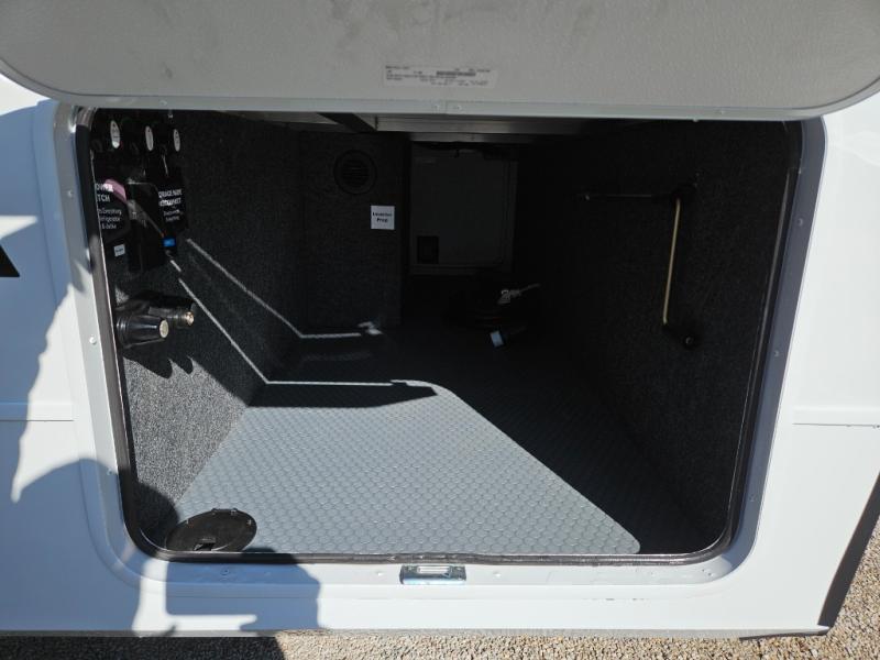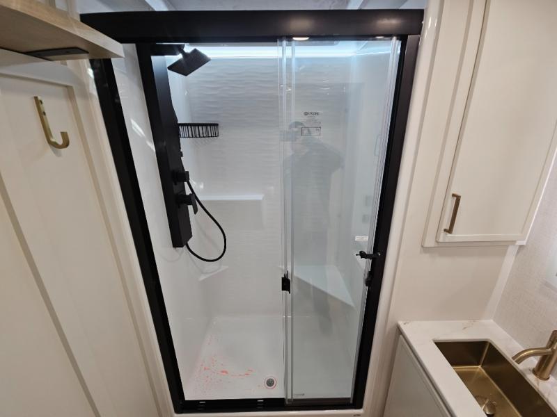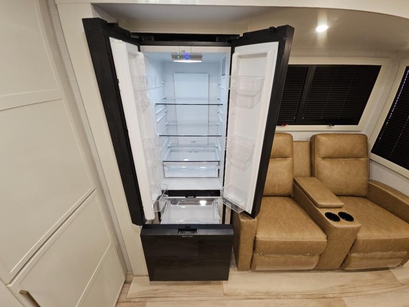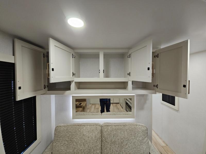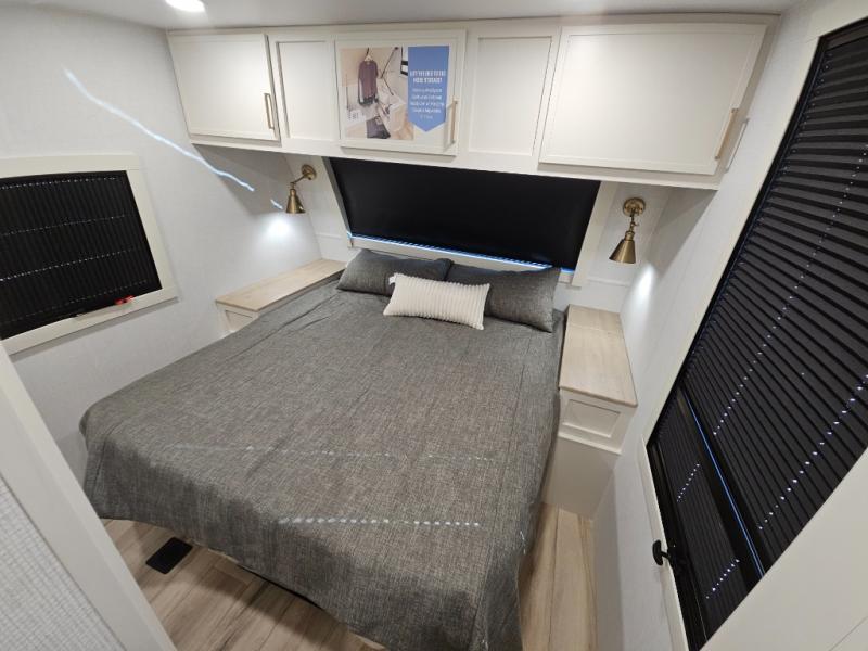 This travel trailer can comfortably sleep four with the king bed in the private bedroom and the tri-fold sofa in the main living area! The full bath features a spacious 42" x 30" shower with a built-in seat and Maxxair fan to name a few comforts. The front private bedroom features a 66" x 80" king bed with a MaxSpace Split-Level Wardrobe underneath to store shoes, clothes, and more! A slide out in the combined living area and rear kitchen makes your space more open, and you'll enjoy relaxing on the theater seating here in the evenings. The full kitchen includes a three burner stovetop, residential 30" convection microwave, 12 cu. ft. 12V refrigerator, plus a trash bin and Stow N' Go paper towel holder for added convenience. You can choose to eat outdoors under the 18' electric awning with LED lights or stay inside to dine at the pull-out dining table with a drawer for added storage!