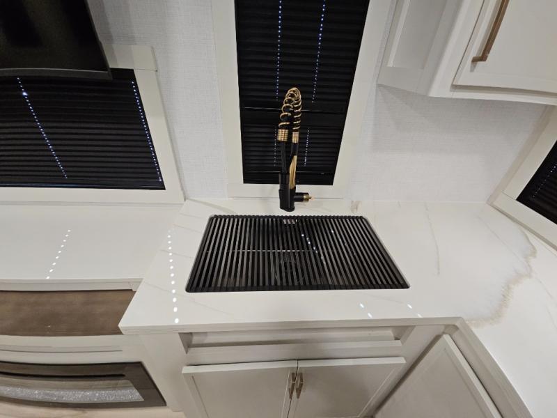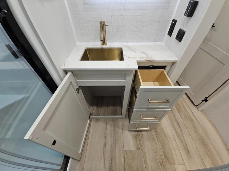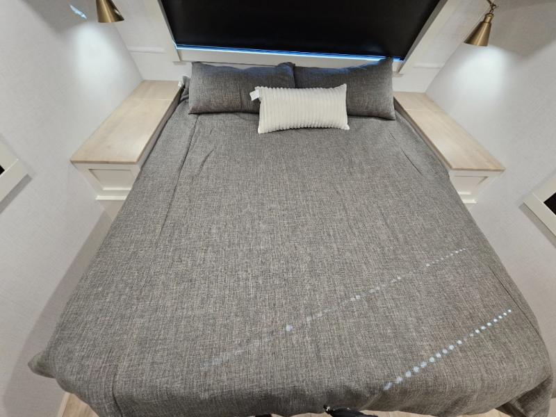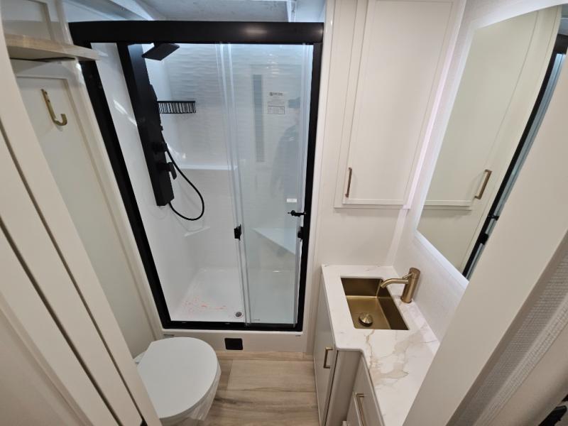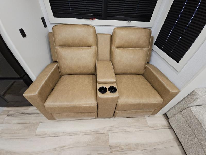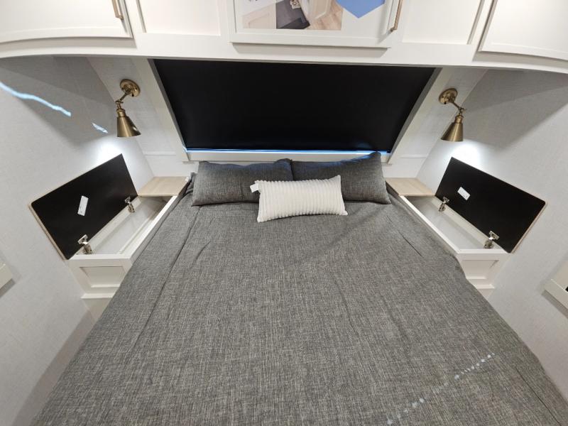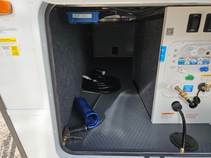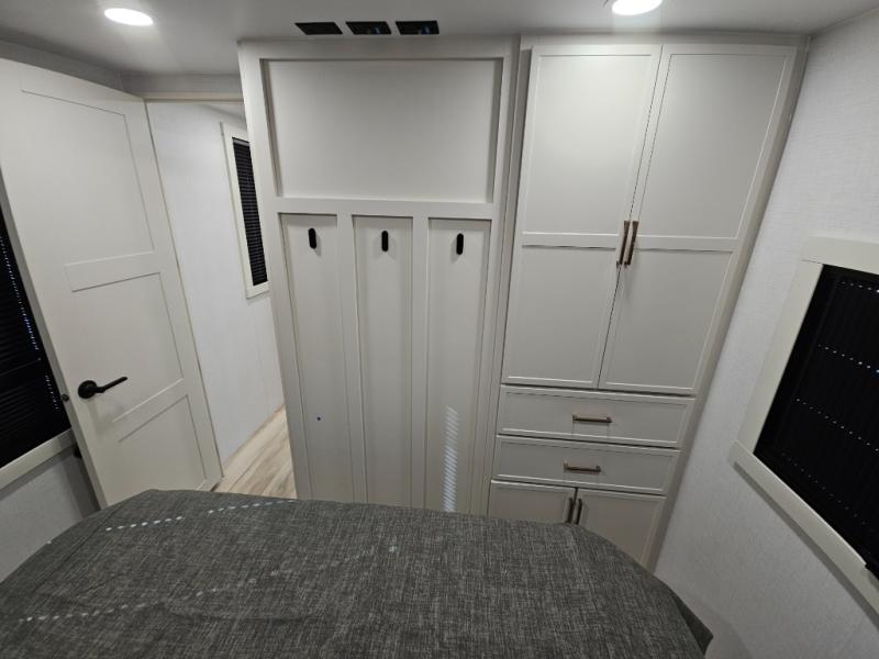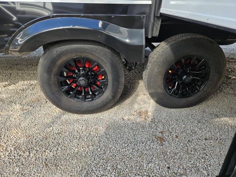This travel trailer can comfortably sleep four with the king bed in the private bedroom and the tri-fold sofa in the main living area! The full bath features a spacious 42" x 30" shower with a built-in seat and Maxxair fan to name a few comforts. The front private bedroom features a 66" x 80" king bed with a MaxSpace Split-Level Wardrobe underneath to store shoes, clothes, and more! A slide out in the combined living area and rear kitchen makes your space more open, and you'll enjoy relaxing on the theater seating here in the evenings. The full kitchen includes a three burner stovetop, residential 30" convection microwave, 12 cu. ft. 12V refrigerator, plus a trash bin and Stow N' Go paper towel holder for added convenience. You can choose to eat outdoors under the 18' electric awning with LED lights or stay inside to dine at the pull-out dining table with a drawer for added storage!