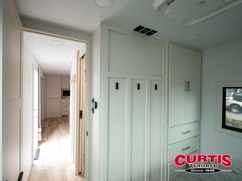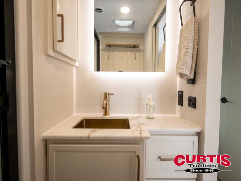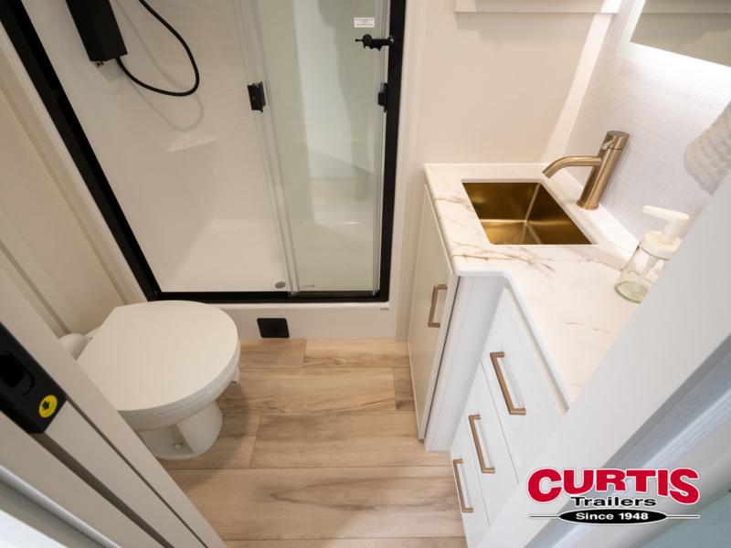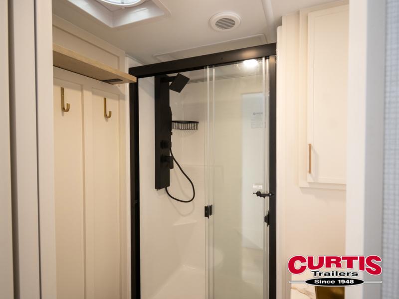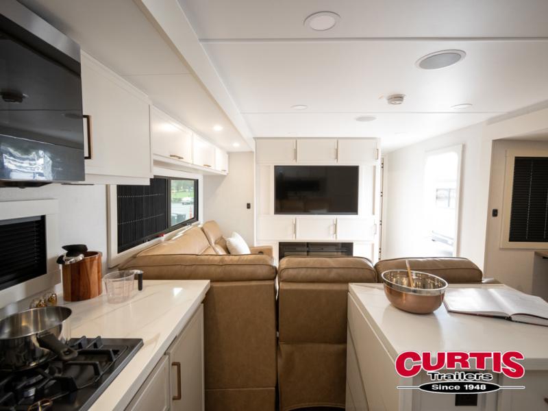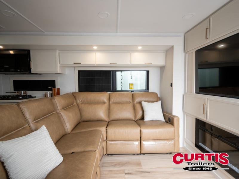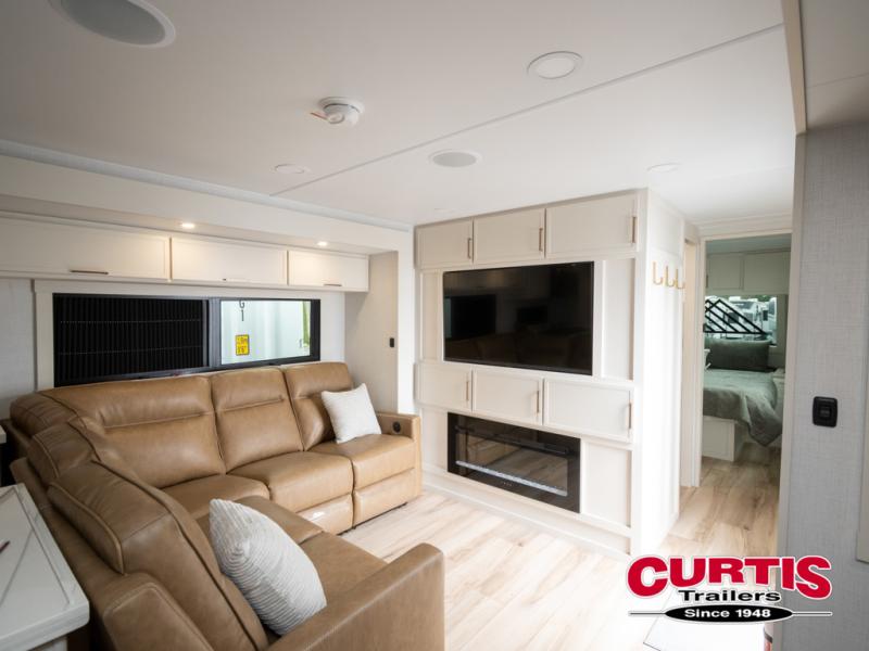Savor the joy of cooking and sharing meals with loved ones in this beautifully appointed kitchen! This rear kitchen features a spacious pantry with drawers and outlets, a 30" convection microwave, a flip-up counter, and a 12V refrigerator. The convertible dining table and L-desk create a refined space for meals, work, and relaxation. The adjacent L-sofa forms a cozy sanctuary for reading, socializing, or enjoying the entertainment center and fireplace. There is a full bathroom with everything you need to keep your personal hygiene on the road. Plus, the front bedroom’s peaceful haven features a plush king bed, nightstands with storage, and a MaxSpace split-level wardrobe. Additionally, the two exterior awnings create a spacious outdoor living area, ideal for relaxing, entertaining, or enjoying the great outdoors.