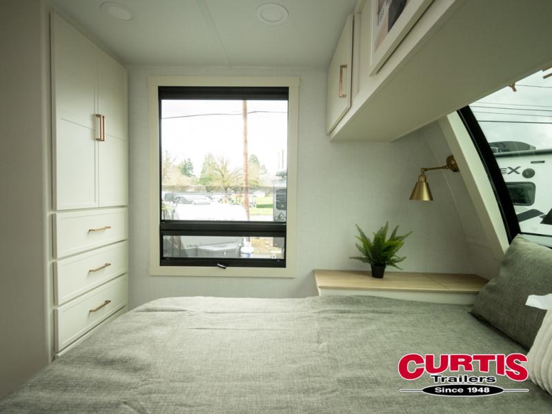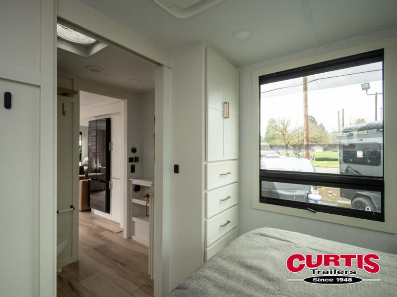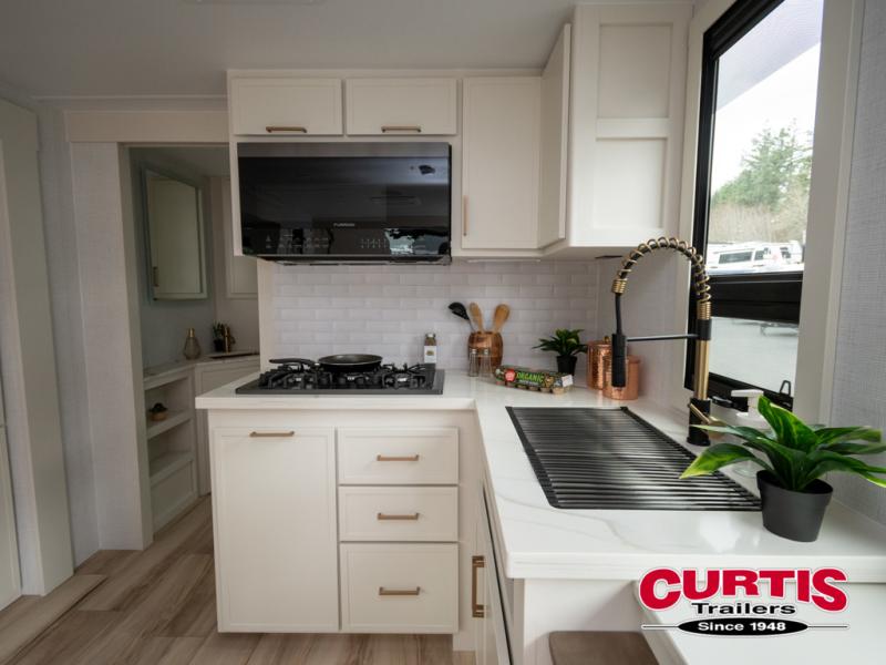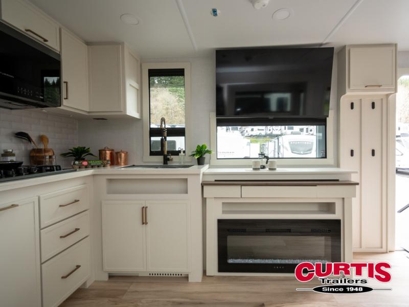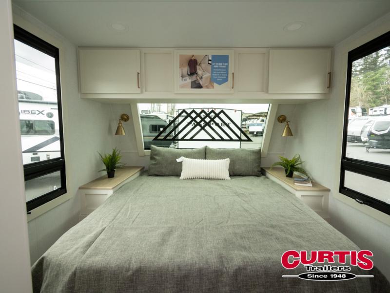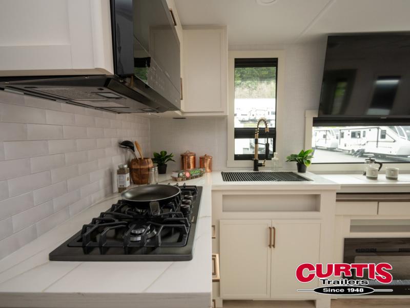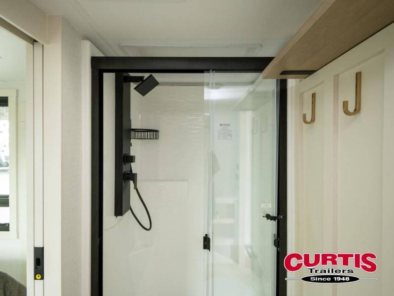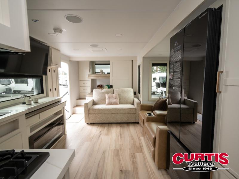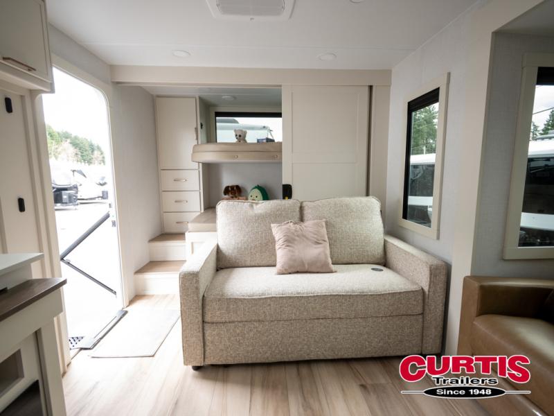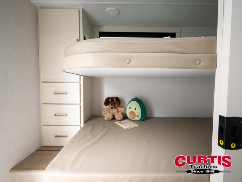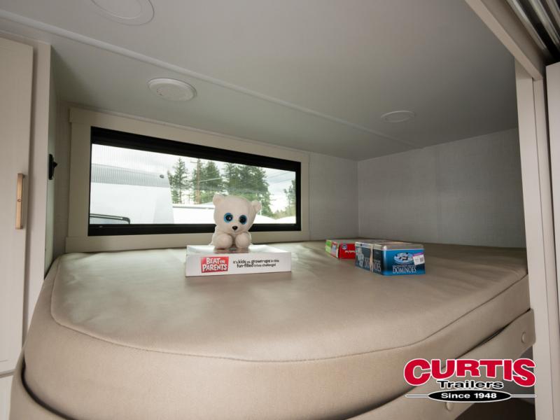 Grab the whole gang and head to the campground in this bunkhouse travel trailer! The 48" x 74" bunks can sleep two to four, and there is a floor to ceiling storage cabinet with drawers, a top bunk window, outlets and USB ports, plus double space-saving pocket doors. Up front you'll find the master bedroom with a 66" x 80" king bed and a MaxSpace Split-Level Wardrobe, TV prep, your own exterior entry door, plus quick access to the walk-thru bath. Everyone can meet in the combined kitchen and living room to relax on the theater seating or tri-fold sofa, and there is pull-out dining table with a drawer and a window above for great outdoor views. The outside is just as accommodating as the inside with its exterior speakers, LED chassis lighting, rear storage compartment with dual access doors, and exterior 12V refrigerator for cold drinks!