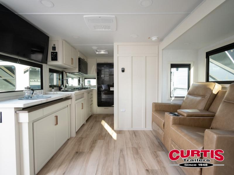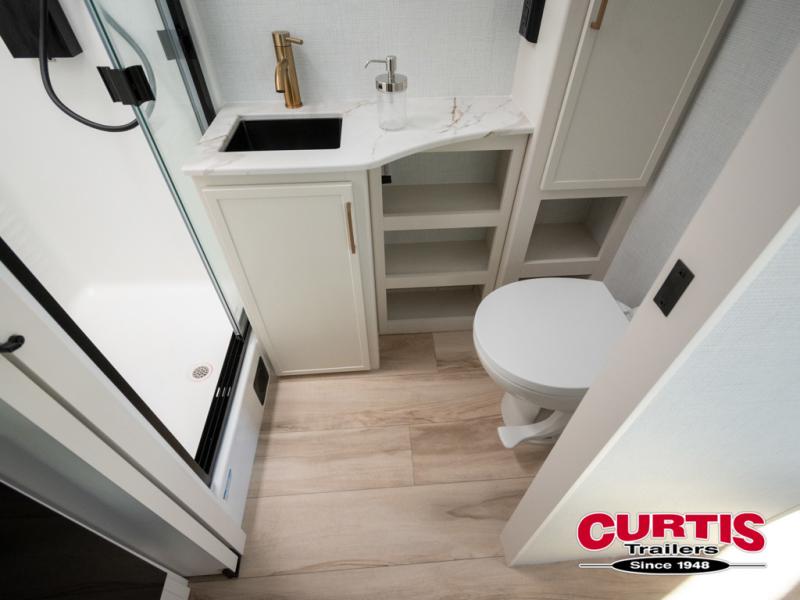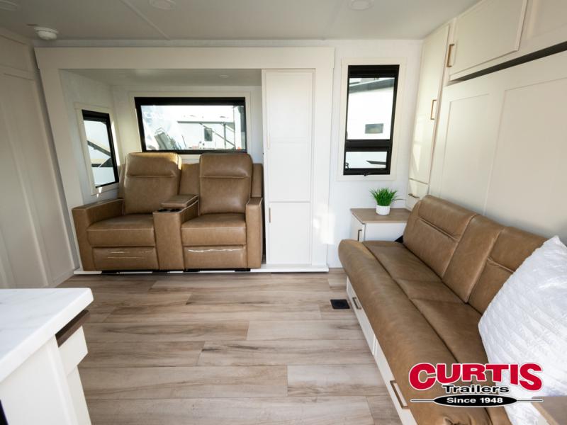 This is the perfect travel trailer for the couple looking for comfort at the campground! Once you've unloaded the pass-thru storage, you can put out the 16' patio awning and relax in your camp chairs. Head inside to make lunch in the fully equipped kitchen that includes a three-burner range, 30" convection microwave, and dishwasher prep. There is a pantry with outlets within the large slide out, along with a 10-cu. ft. refrigerator, plus theater seating across from the TV. And if you need sleeping space for guests, just choose the optional tri-fold sofa in place of the theater seating! You'll appreciate the front sofa plus a Feather-Lift bed system, providing seating space during the day and sleeping space at night! A pull-out table with a drawer provides a place to dine together, and a full bath on board will let you freshen up each day.