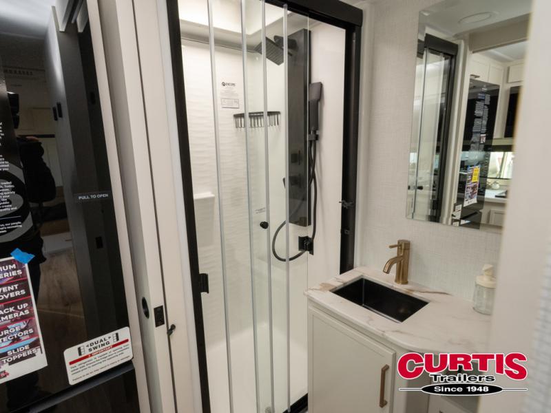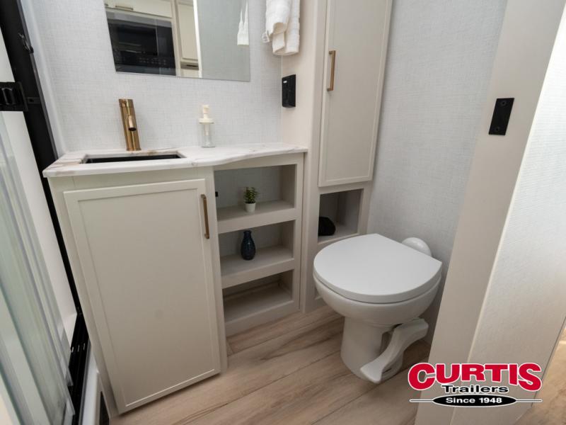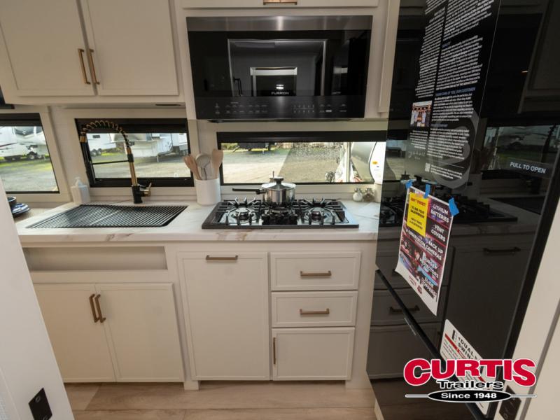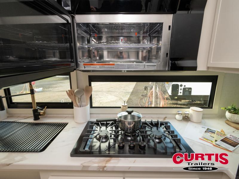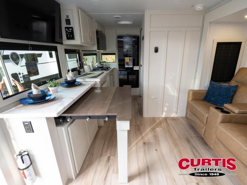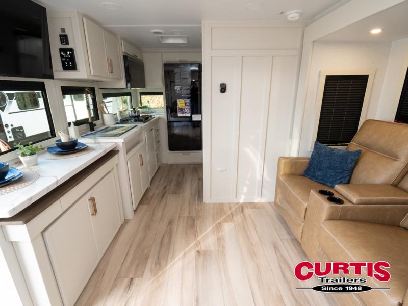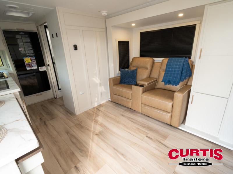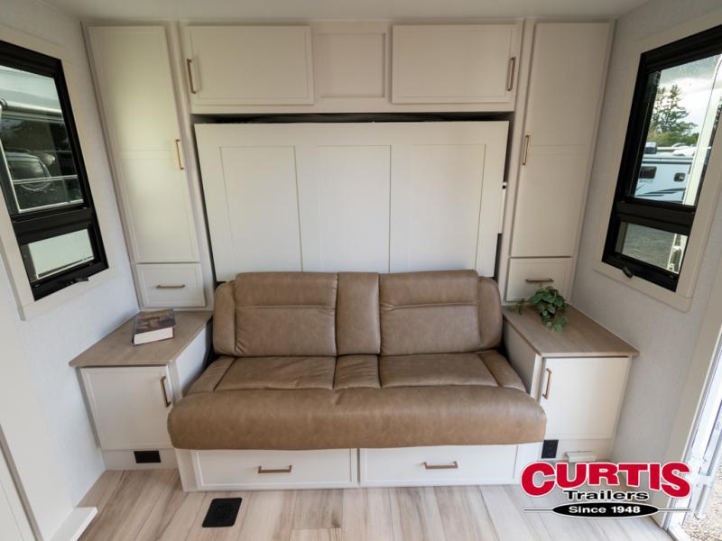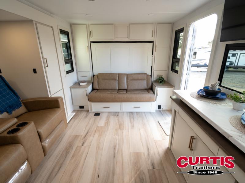 This is the perfect travel trailer for the couple looking for comfort at the campground! Once you've unloaded the pass-thru storage, you can put out the 16' patio awning and relax in your camp chairs. Head inside to make lunch in the fully equipped kitchen that includes a three-burner range, 30" convection microwave, and dishwasher prep. There is a pantry with outlets within the large slide out, along with a 10-cu. ft. refrigerator, plus theater seating across from the TV. And if you need sleeping space for guests, just choose the optional tri-fold sofa in place of the theater seating! You'll appreciate the front sofa plus a Feather-Lift bed system, providing seating space during the day and sleeping space at night! A pull-out table with a drawer provides a place to dine together, and a full bath on board will let you freshen up each day.