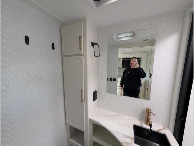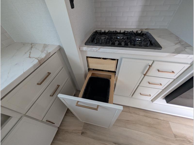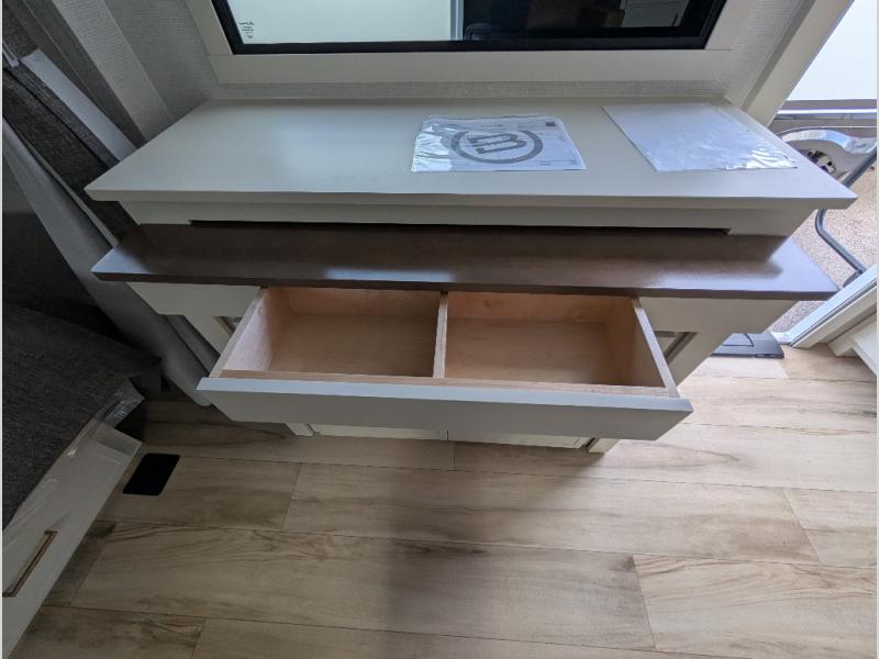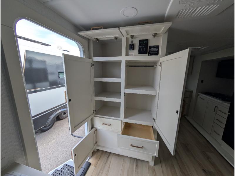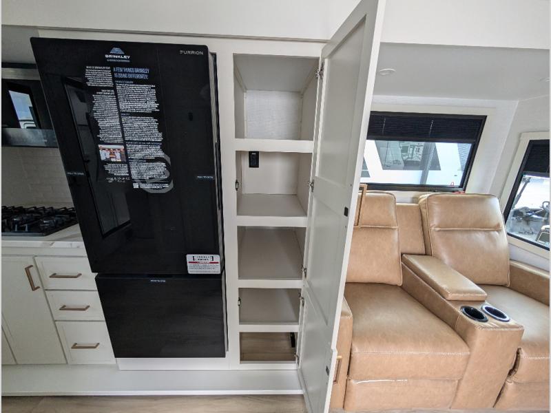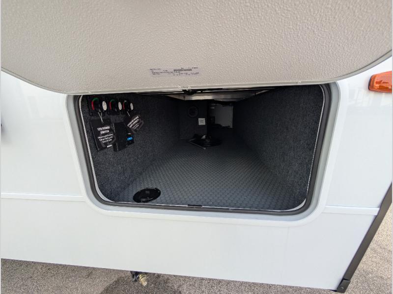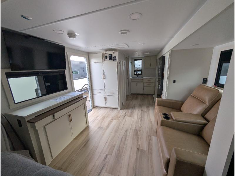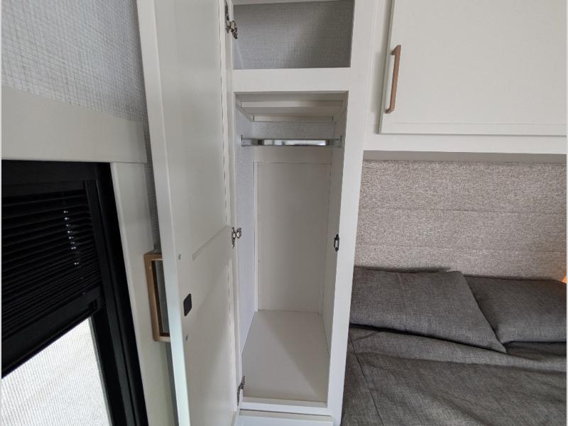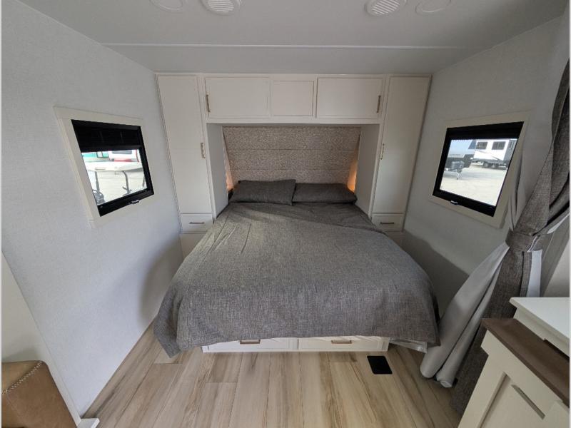 This is the perfect travel trailer for the couple looking for comfort at the campground! Once you've unloaded the pass-thru storage, you can put out the 17' patio awning and relax in your camp chairs. Head inside to make lunch in the fully equipped kitchen that includes a three-burner range, 30" convection microwave, and dishwasher prep. There is a pantry with outlets within the large slide out, along with a 10-cu. ft. refrigerator that you can access with the slide in, plus theater seating across from the TV. And if you need sleeping space for guests, just choose the optional tri-fold sofa in place of the theater seating! A pull-out table with a drawer provides a place to dine together, and the entryway closet will be perfect to keep jackets and shoes tidy. You'll get a great night's rest on the front queen bed with four drawers, nightstand cubbies, and a room divider for a little more privacy.