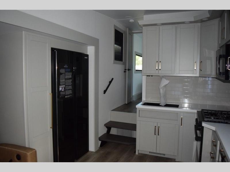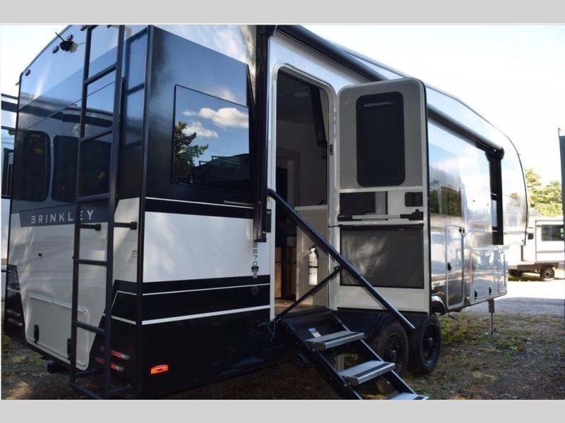 The Brinkley mid-profile Model Z fifth wheels bring you clean lines and an upscale look with plenty of style and exciting new features like the industry first brass plumbing connections. These units also feature an automotive grade front cap, plenty of exterior storage, dual exterior hot and cold showers, and wide stance leveling jacks for easy set up. Residential frameless windows provide a clean look and beautiful views, and ample electrical outlets and USB/USB-C outlets allow all of your electronics and appliances to easily be used and charged.