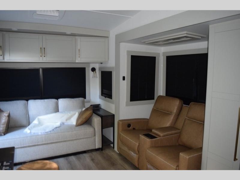 You'll love every minute spent in this luxury fifth wheel! Your crew can get comfortable in the rear living room on the 72" tri-fold sofa that converts to a 62" x 70" bed, or on the theater seating within the slide out. There is also a sliding dining table and a TV with swivel so everyone can have a good view of the movie. A full kitchen, complete with a cooktop, 30" residential microwave, and 16 cu. ft. refrigerator will let you cook and store food, and there is a handy trash bin with a Stow N' Go paper towel holder for easy clean up. The full bath will let you freshen up before heading to bed in the front private bedroom!