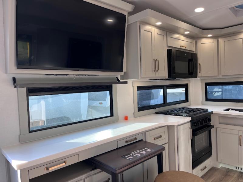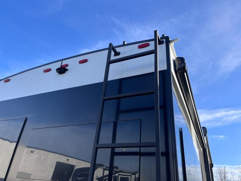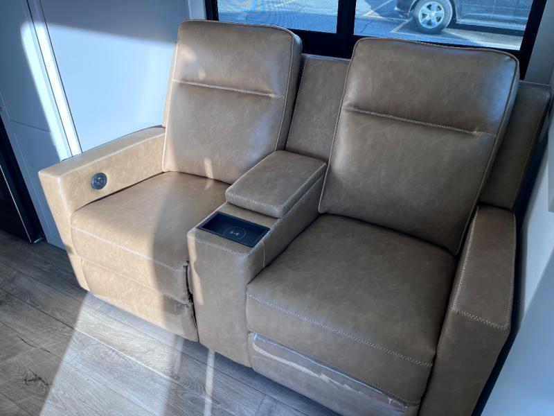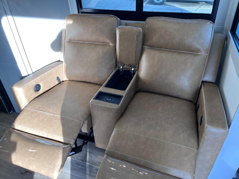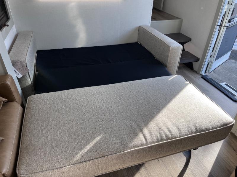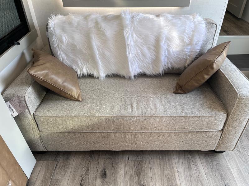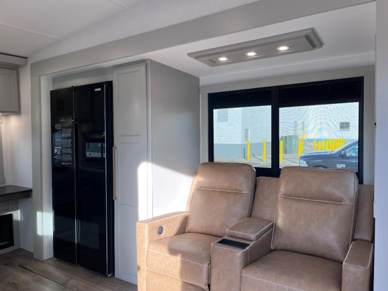 You'll love every minute spent in this spacious fifth wheel that can sleep four each night. There is a front private bedroom with a queen bed and 4x under-bed drawers to keep your space tidy. Your guests can sleep on the tri-fold sofa that extends to a 54" x 70" bed at night. The theater seating sits directly across from the 50" articulating TV for movie nights, and the pantry with drawers is right next to the theater seating for quick access to snacks! The chef of your group is sure to love the kitchen with its ample counter space, 30" residential microwave, and a sliding dining table with a drawer for even more storage. The desk in the back will allow you to get some work done if needed, or you can just spend your days outdoors under the two power awnings. There is also an exterior 12V refrigerator and storage, exterior speakers and controls, and a pass-thru storage for camp gear!