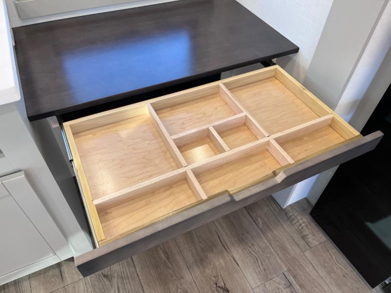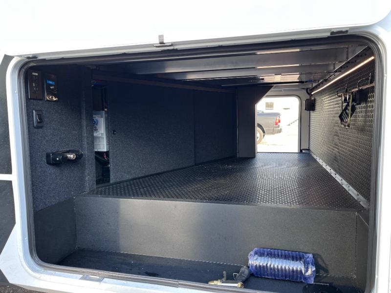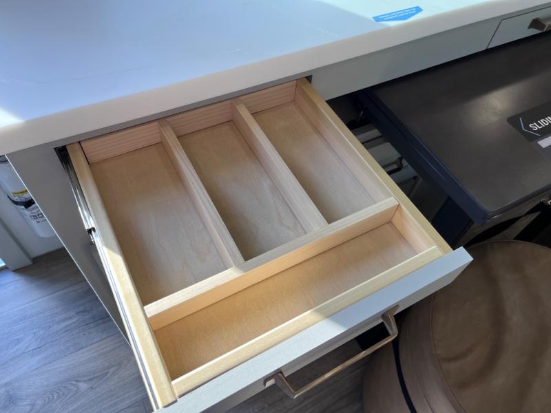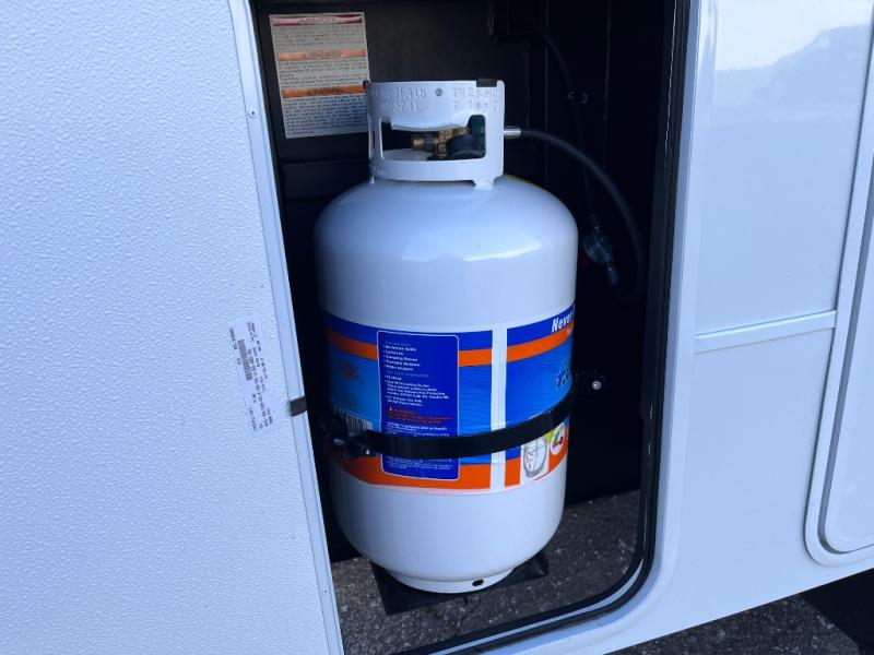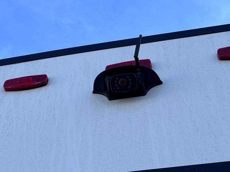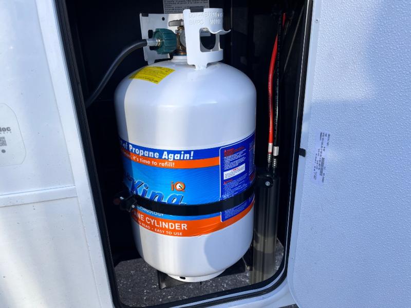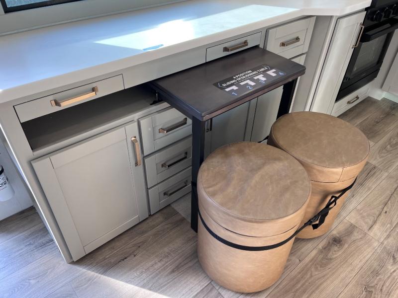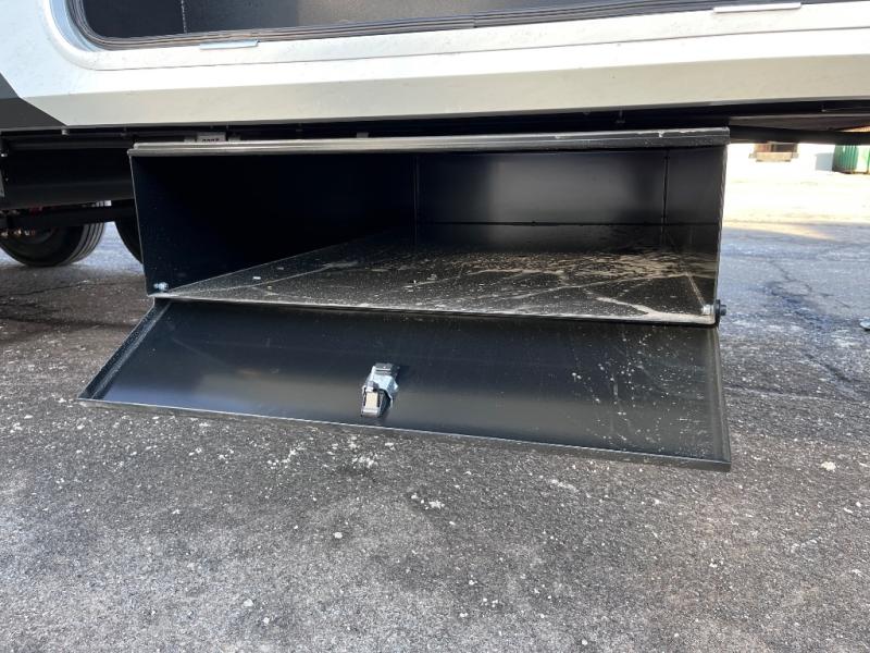 You'll love every minute spent in this spacious fifth wheel that can sleep four each night. There is a front private bedroom with a queen bed and 4x under-bed drawers to keep your space tidy. Your guests can sleep on the tri-fold sofa that extends to a 54" x 70" bed at night. The theater seating sits directly across from the 50" articulating TV for movie nights, and the pantry with drawers is right next to the theater seating for quick access to snacks! The chef of your group is sure to love the kitchen with its ample counter space, 30" residential microwave, and a sliding dining table with a drawer for even more storage. The desk in the back will allow you to get some work done if needed, or you can just spend your days outdoors under the two power awnings. There is also an exterior 12V refrigerator and storage, exterior speakers and controls, and a pass-thru storage for camp gear!