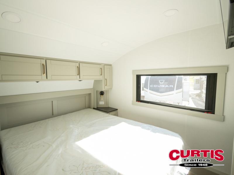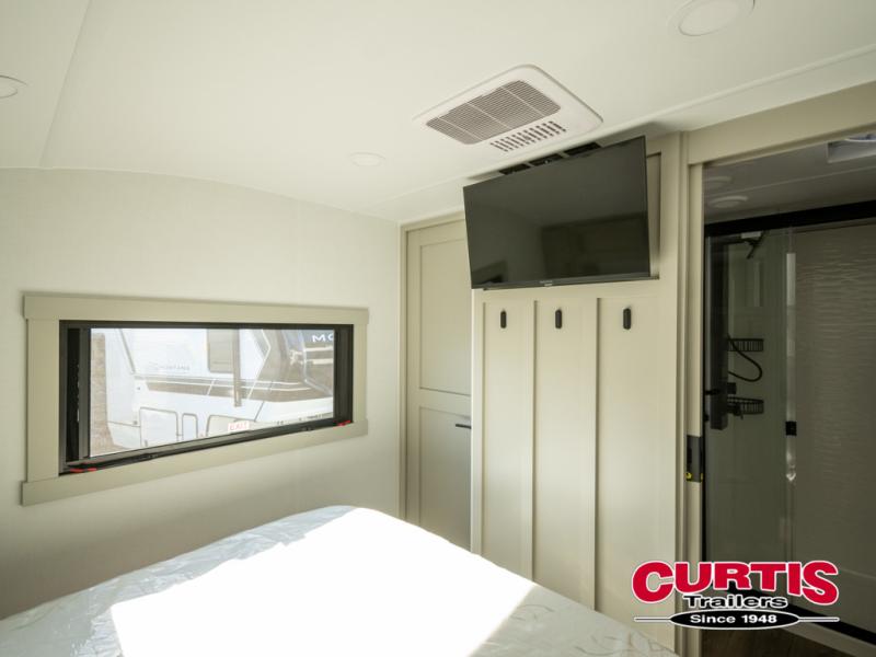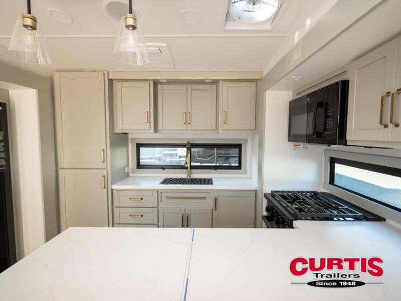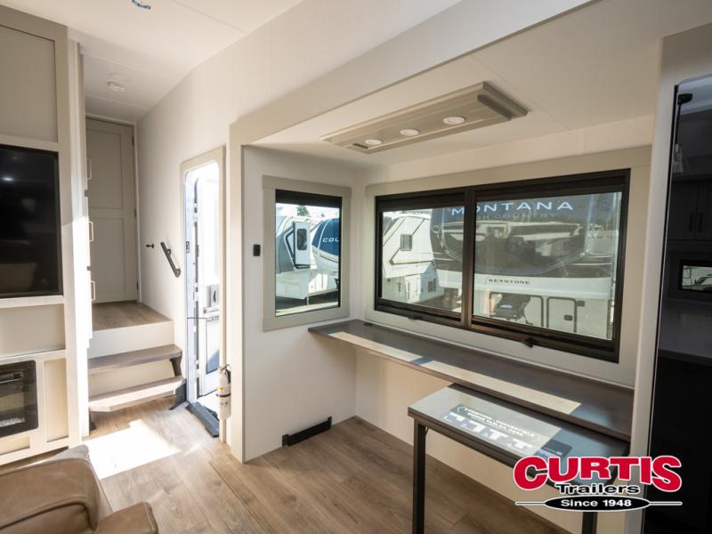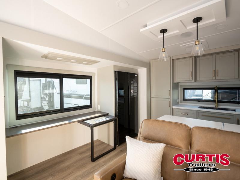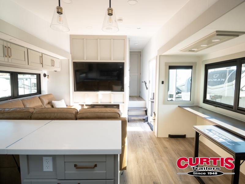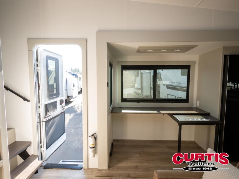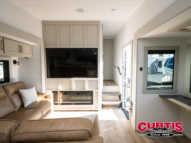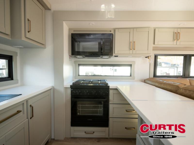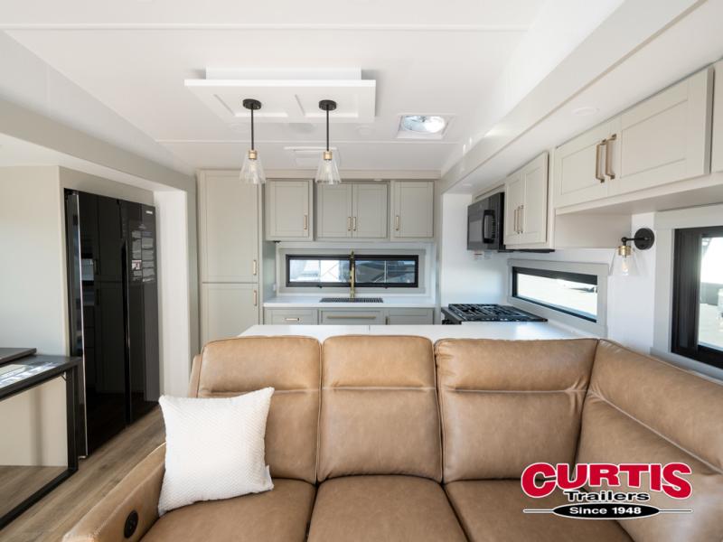 Featuring a spacious L-sofa with four recliners and a 65” articulating TV for endless entertainment, this fifth wheel is a great option to get on the road! The convertible dining table/L desk seats up to four people, making it perfect for meals, work, or play. You can cozy up by the fireplace and enjoy quality time with loved ones. Plus, ample shoe storage keeps your gear organized. The kitchen is equipped with solid surface countertops, dishwasher prep, a residential microwave, and a three-burner cooktop. Also, the large pantry with pull-out drawers provides ample storage for your favorite ingredients and cooking essentials. The one-piece fiberglass shower is a highlight of the bathroom, offering a convenient space to get ready, and additional storage is provided by the linen closet. And you will love the front main bedroom featuring a residential queen memory foam mattress with nightstands, outlets, and USB & USB-C ports for convenient charging.