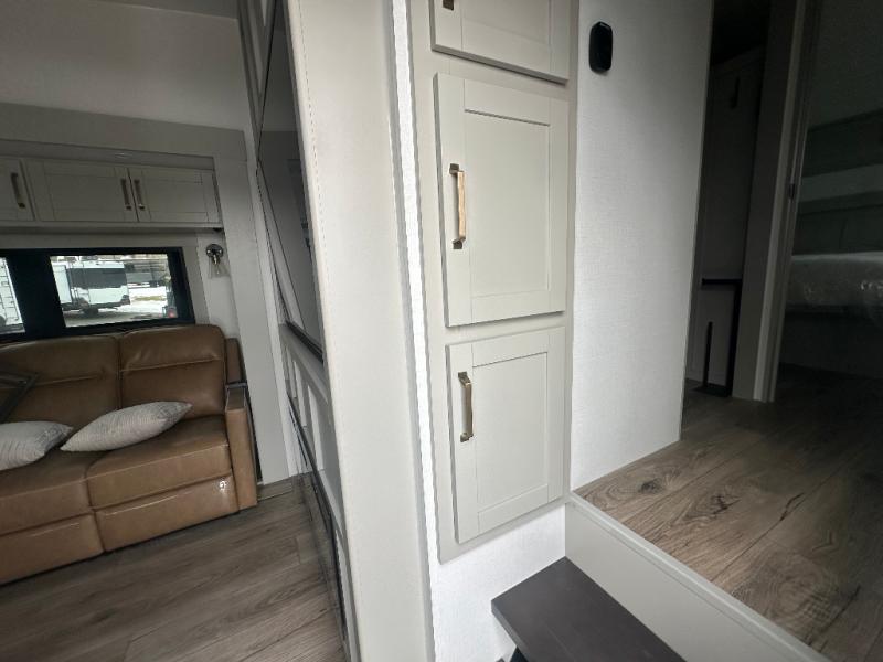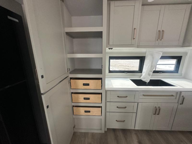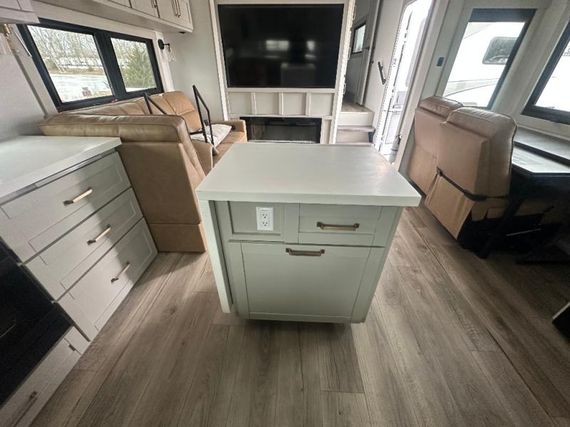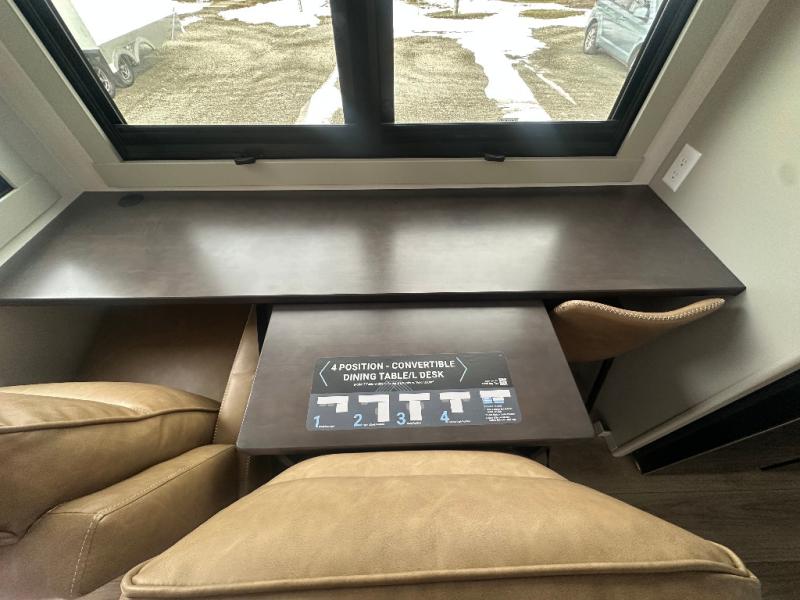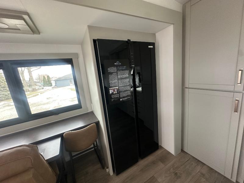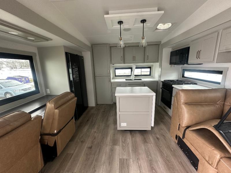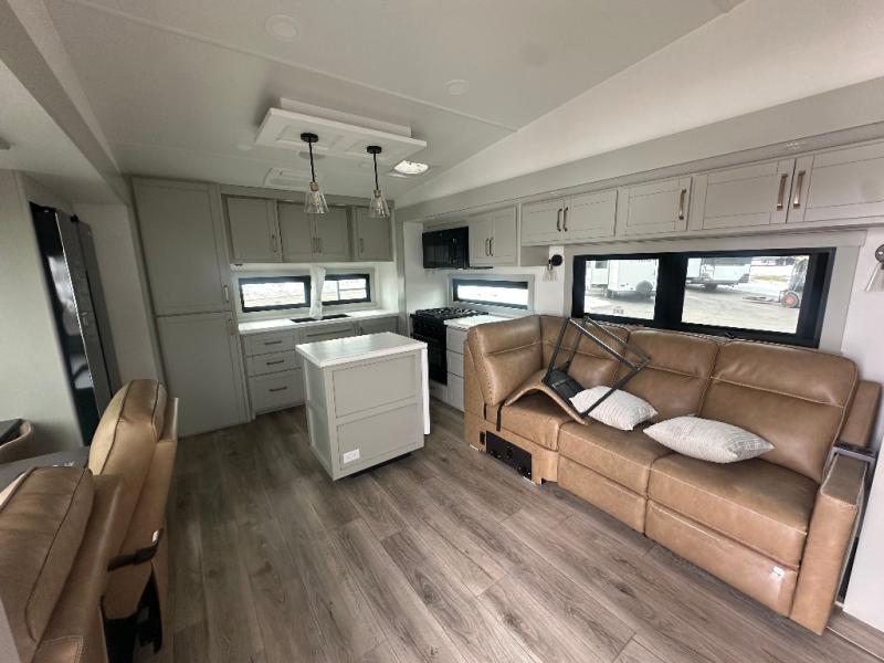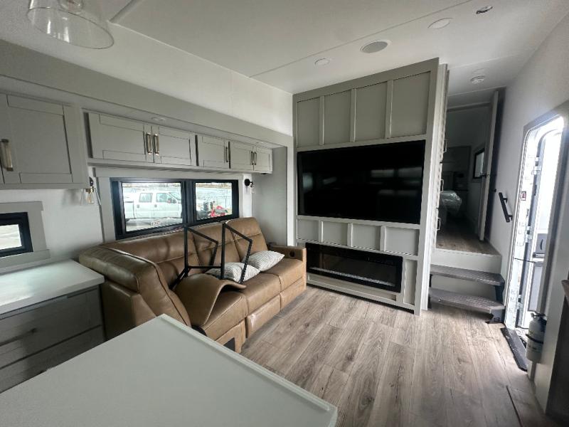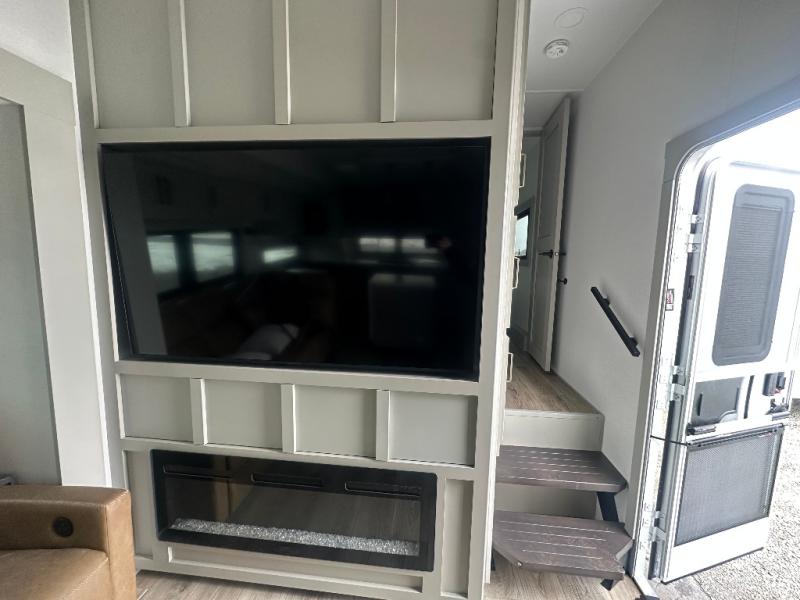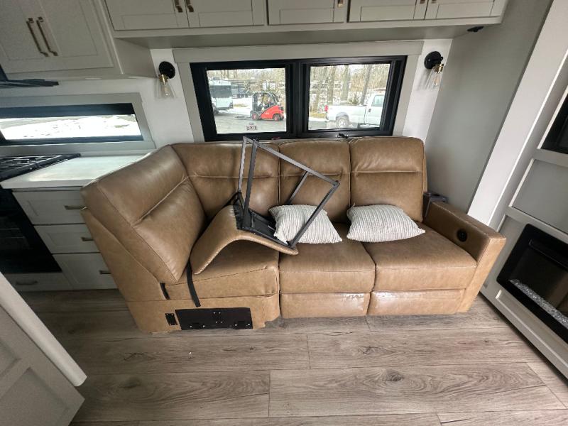 Featuring a spacious L-sofa with four recliners and a 65” articulating TV for endless entertainment, this fifth wheel is a great option to get on the road! The convertible dining table/L desk seats up to four people, making it perfect for meals, work, or play. You can cozy up by the fireplace and enjoy quality time with loved ones. Plus, ample shoe storage keeps your gear organized. The kitchen is equipped with solid surface countertops, dishwasher prep, a residential microwave, and a three-burner cooktop. Also, the large pantry with pull-out drawers provides ample storage for your favorite ingredients and cooking essentials. The one-piece fiberglass shower is a highlight of the bathroom, offering a convenient space to get ready, and additional storage is provided by the linen closet. And you will love the front main bedroom featuring a residential queen memory foam mattress with nightstands, outlets, and USB & USB-C ports for convenient charging.