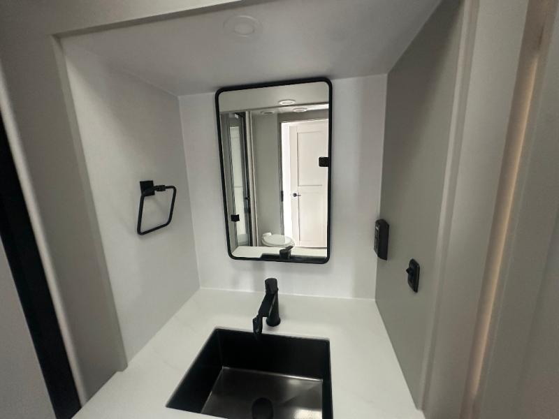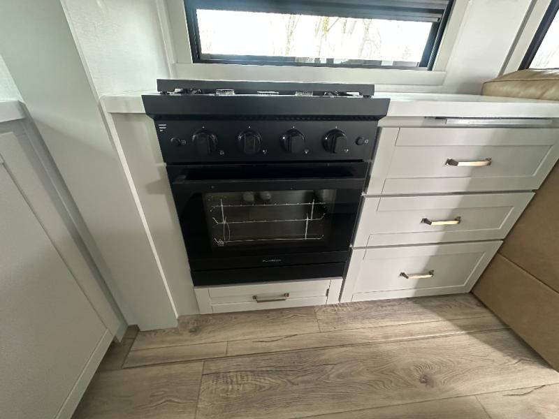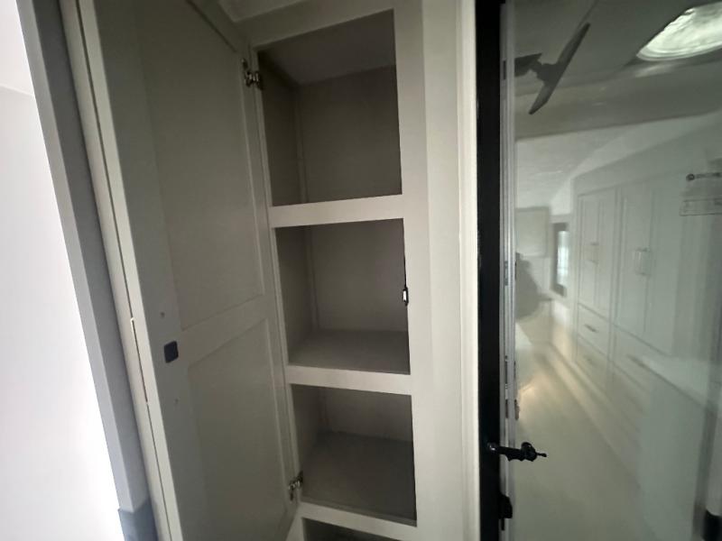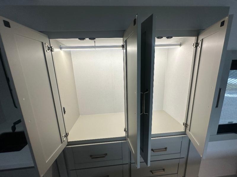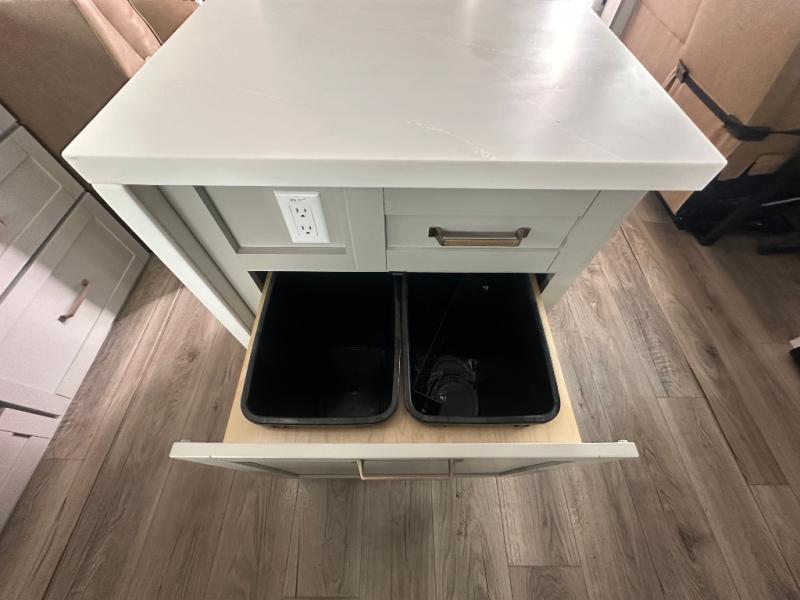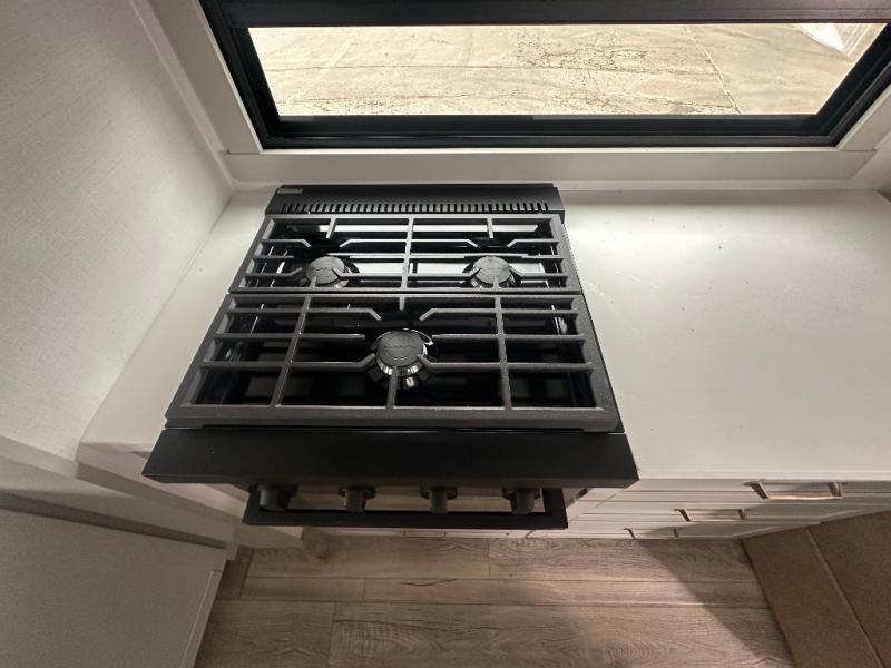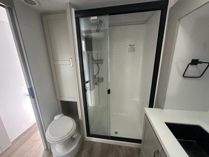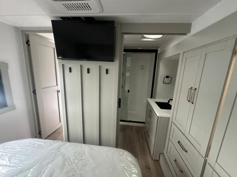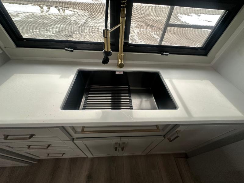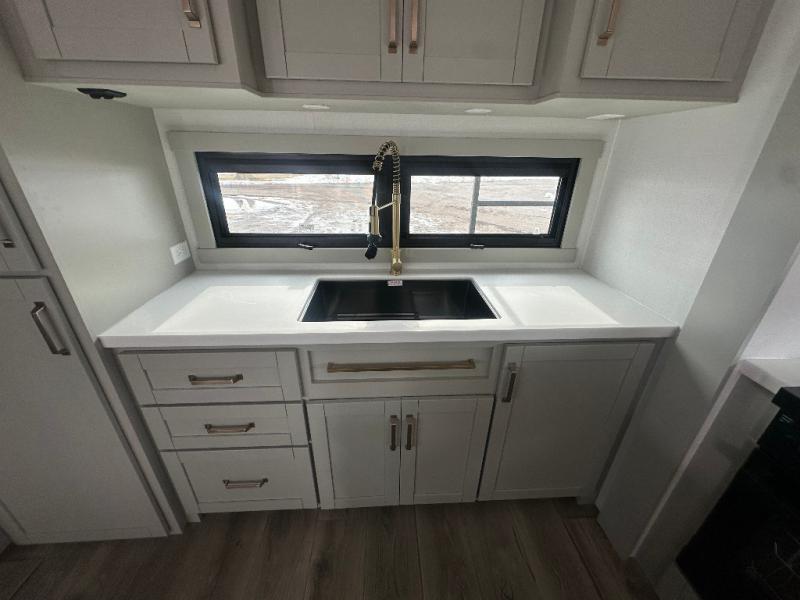 Featuring a spacious L-sofa with four recliners and a 65” articulating TV for endless entertainment, this fifth wheel is a great option to get on the road! The convertible dining table/L desk seats up to four people, making it perfect for meals, work, or play. You can cozy up by the fireplace and enjoy quality time with loved ones. Plus, ample shoe storage keeps your gear organized. The kitchen is equipped with solid surface countertops, dishwasher prep, a residential microwave, and a three-burner cooktop. Also, the large pantry with pull-out drawers provides ample storage for your favorite ingredients and cooking essentials. The one-piece fiberglass shower is a highlight of the bathroom, offering a convenient space to get ready, and additional storage is provided by the linen closet. And you will love the front main bedroom featuring a residential queen memory foam mattress with nightstands, outlets, and USB & USB-C ports for convenient charging.
