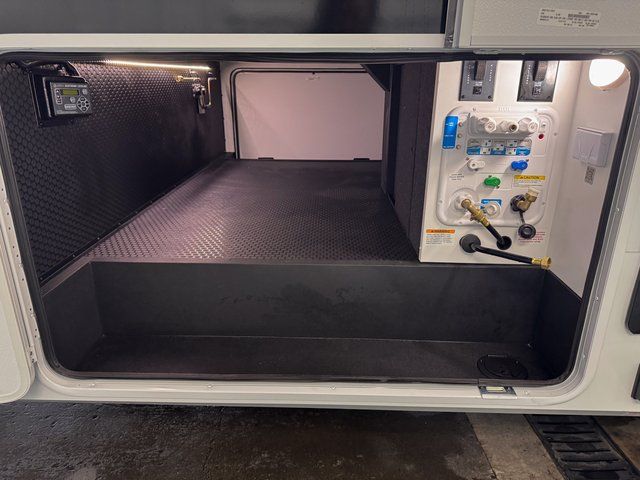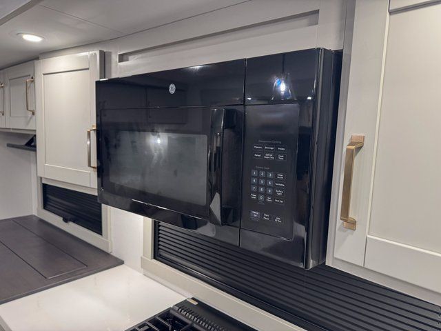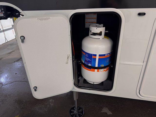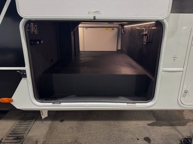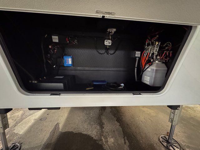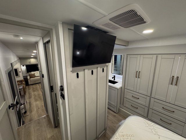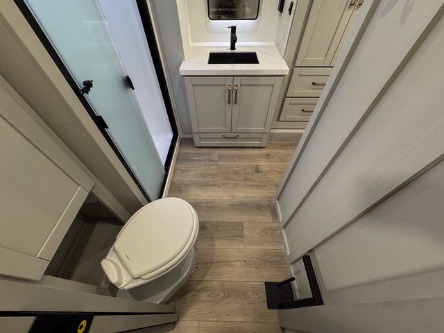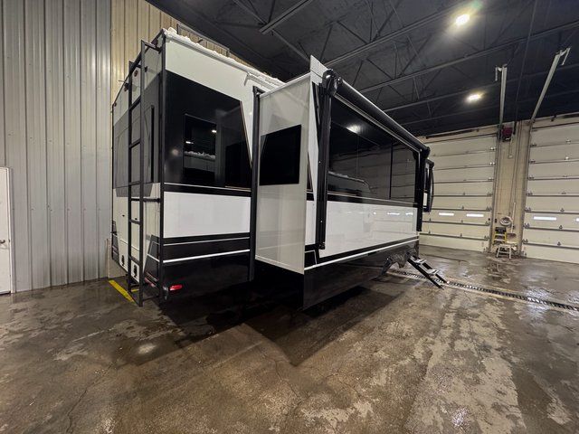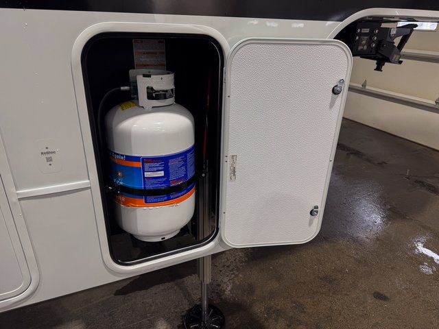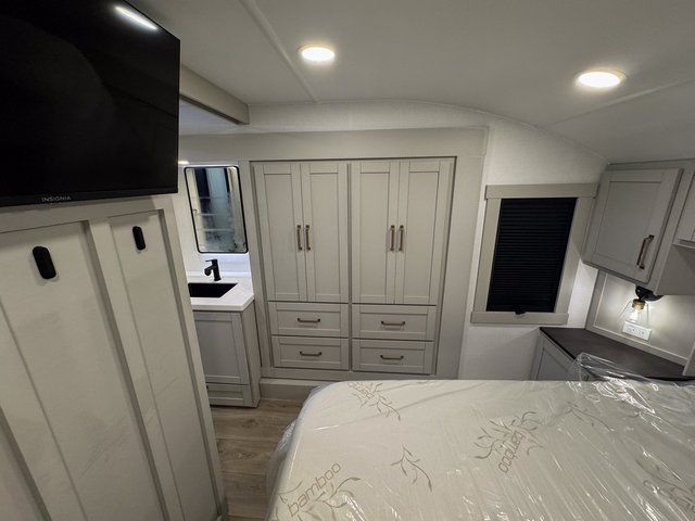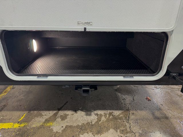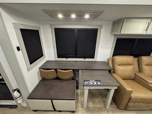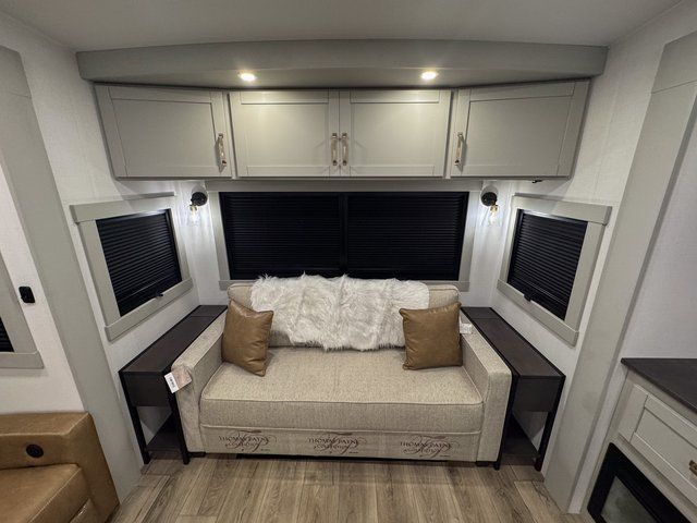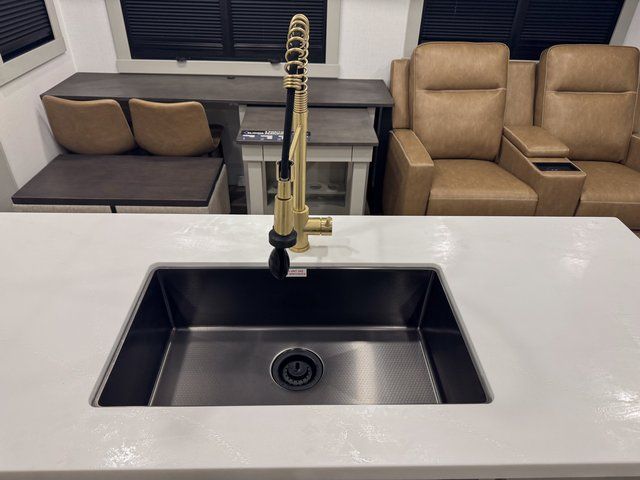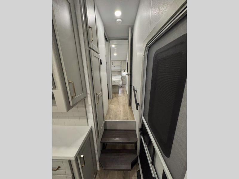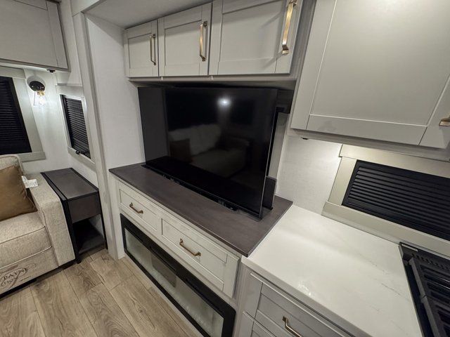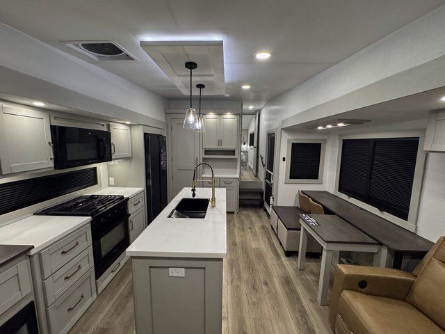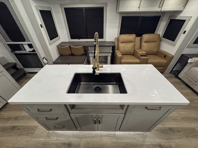 You're going to love every minute spent in this spacious fifth wheel that can sleep four. There is an inviting rear living area with a 72" tri-fold sofa and theater seating across from the televator and fireplace. The chef of your group can whip up dinner on the three burner cooktop or in the 30" residential microwave, and there is a 16 cu. ft. refrigerator that even opens when with the slide out is in. You will also enjoy the kitchen island with a farmhouse sink and roller cover, dual trash bins with a Stow N' Go paper towel holder, plus convenient dog bowls for your furry friends. You can store all your paper goods and snacks in the 84" pantry with adjustable shelving, and there is a hutch for nice dishes plus shoe storage in this model as well. Head to the front master bedroom where you'll find a queen bed with a TV, a large slide out with a wardrobe with drawers, plus a spacious bath.