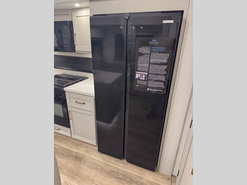 The Brinkley mid-profile Model Z fifth wheels bring you clean lines and an upscale look with plenty of style and exciting new features like the industry first brass plumbing connections. These units also feature an automotive grade front cap, plenty of exterior storage, dual exterior hot and cold showers, and wide stance leveling jacks for easy set up. Residential frameless windows provide a clean look and beautiful views, and ample electrical outlets and USB/USB-C outlets allow all of your electronics and appliances to easily be used and charged.