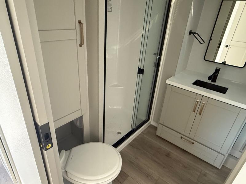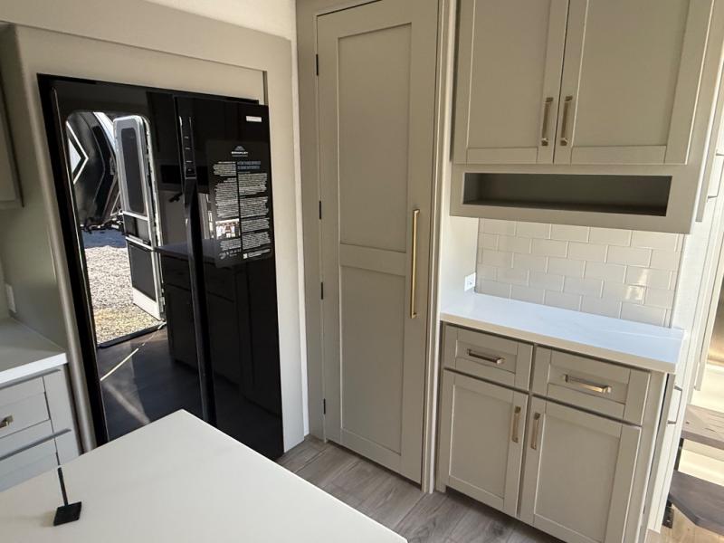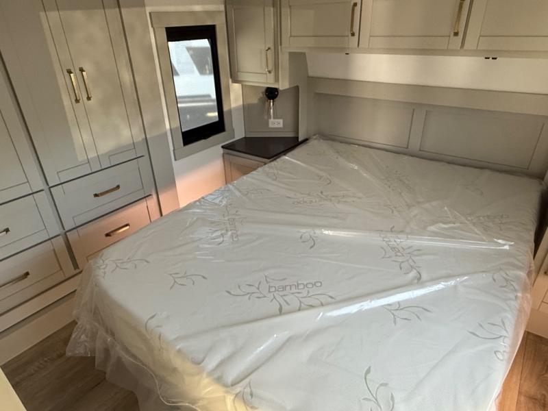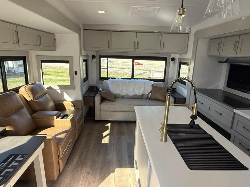 You're going to love every minute spent in this spacious fifth wheel that can sleep four. There is an inviting rear living area with a 72" tri-fold sofa and theater seating across from the televator and fireplace. The chef of your group can whip up dinner on the three burner cooktop or in the 30" residential microwave, and there is a 16 cu. ft. refrigerator that even opens when with the slide out is in. You will also enjoy the kitchen island with a farmhouse sink and roller cover, dual trash bins with a Stow N' Go paper towel holder, plus convenient dog bowls for your furry friends. You can store all your paper goods and snacks in the 84" pantry with adjustable shelving, and there is a hutch for nice dishes plus shoe storage in this model as well. Head to the front master bedroom where you'll find a queen bed with a TV, a large slide out with a wardrobe with drawers, plus a spacious bath.