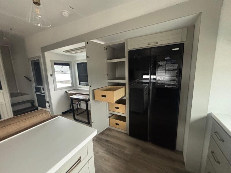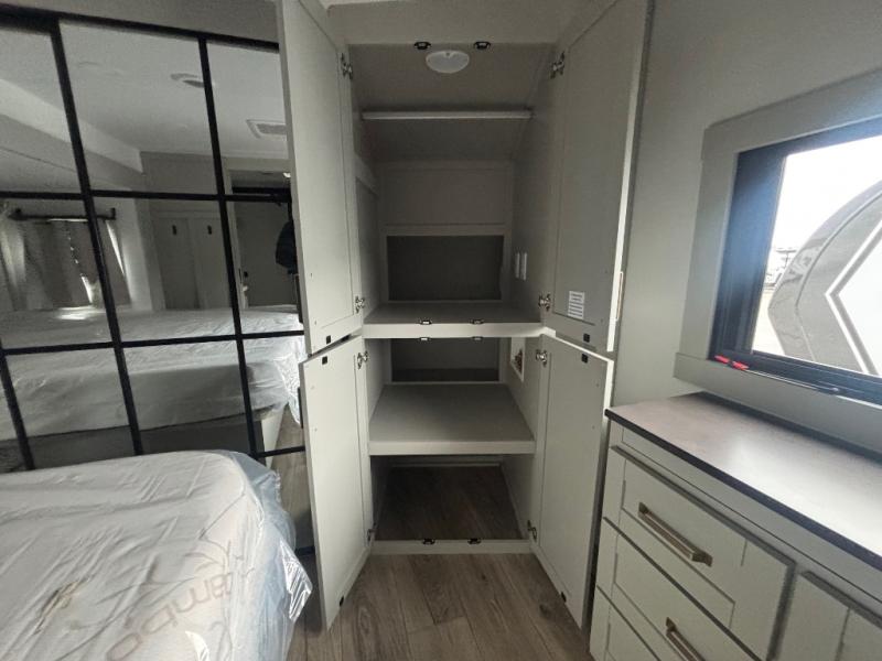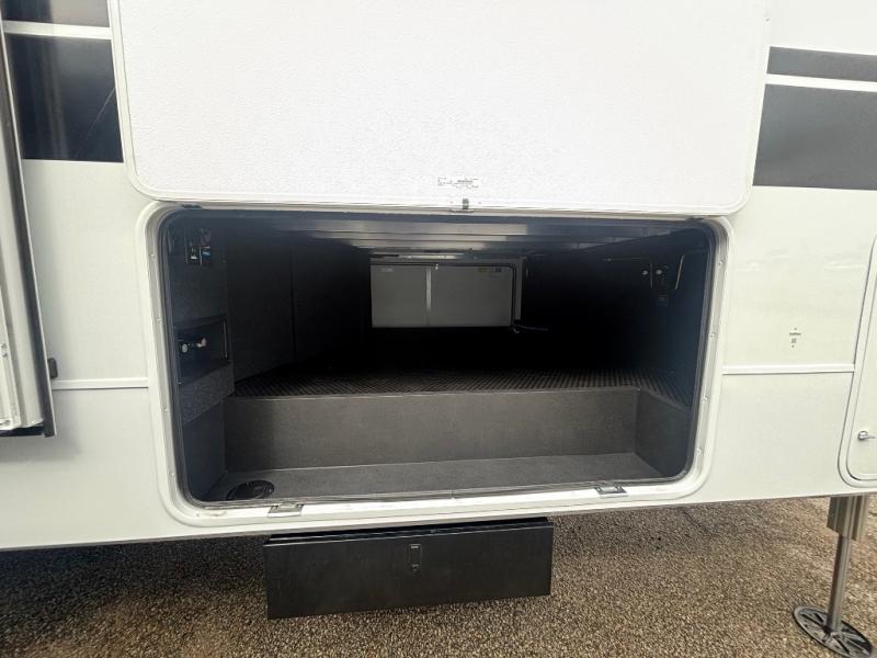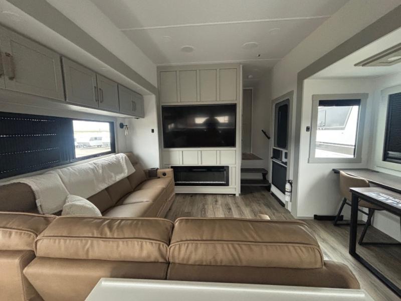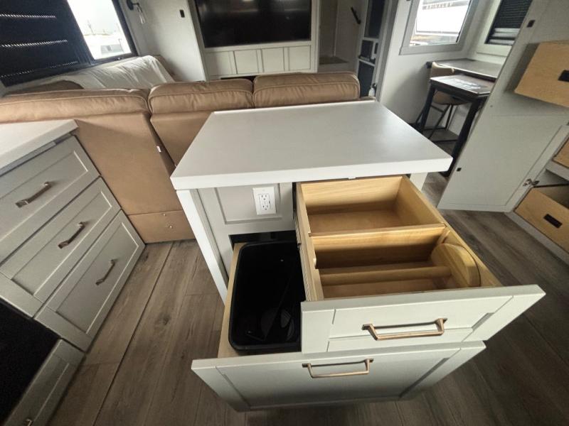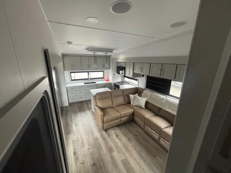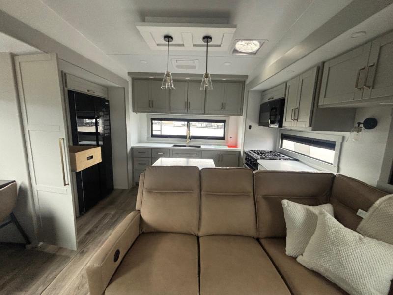 You're going to love every minute spent in this spacious fifth wheel that can sleep four. There is an inviting rear living area with a 72" tri-fold sofa and theater seating across from the televator and fireplace. The chef of your group can whip up dinner on the three burner cooktop or in the 30" residential microwave, and there is a 16 cu. ft. refrigerator that even opens when with the slide out is in. You will also enjoy the kitchen island with a farmhouse sink and roller cover, dual trash bins with a Stow N' Go paper towel holder, plus convenient dog bowls for your furry friends. You can store all your paper goods and snacks in the 84" pantry with adjustable shelving, and there is a hutch for nice dishes plus shoe storage in this model as well. Head to the front master bedroom where you'll find a queen bed with a TV, a large slide out with a wardrobe with drawers, plus a spacious bath.