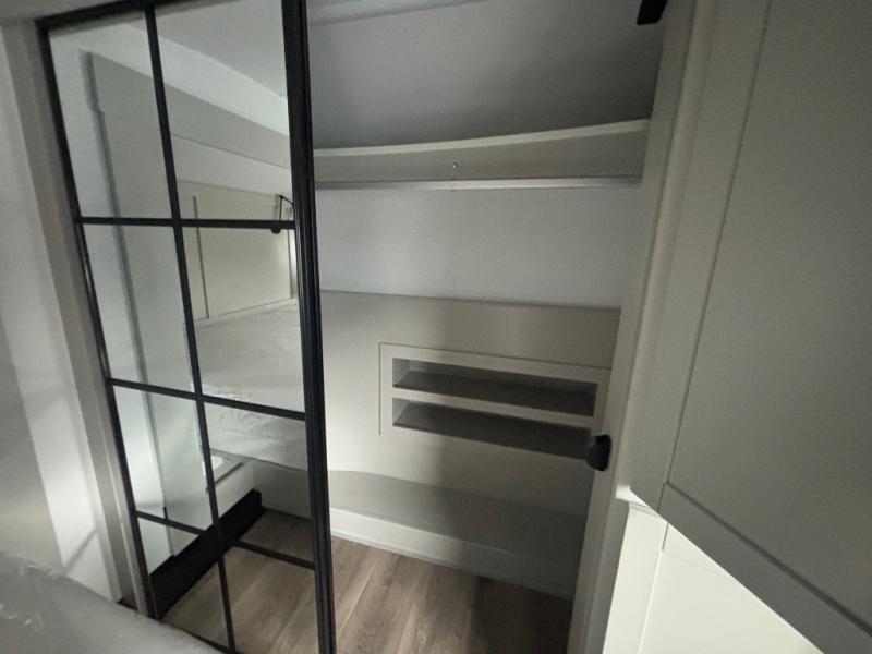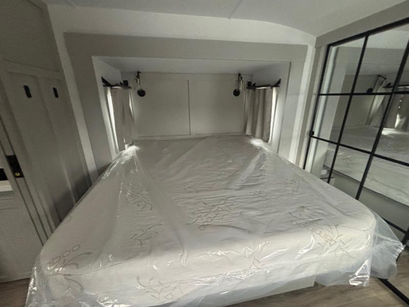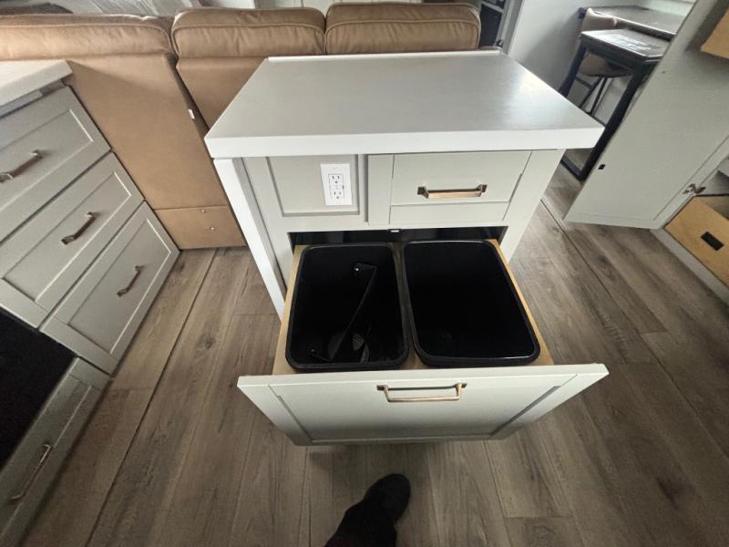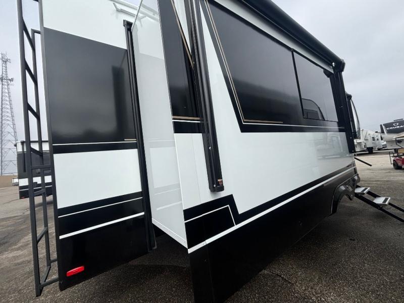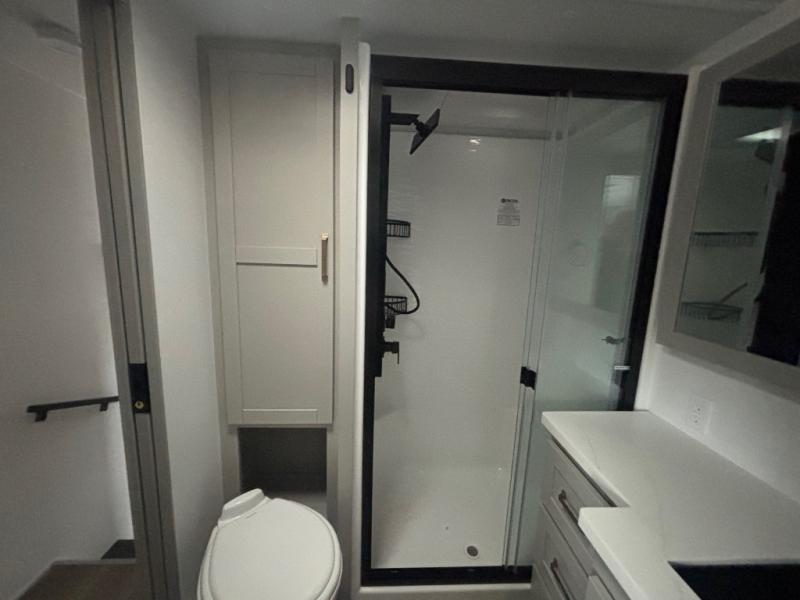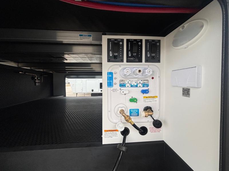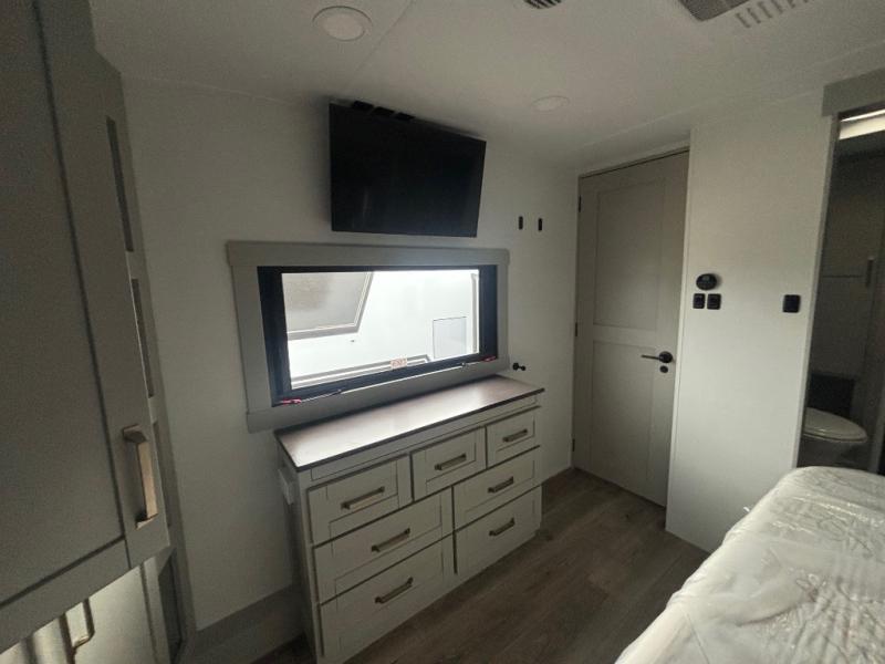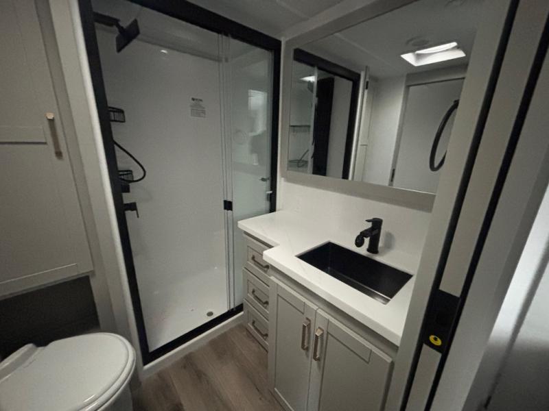 You're going to love every minute spent in this spacious fifth wheel that can sleep four. There is an inviting rear living area with a 72" tri-fold sofa and theater seating across from the televator and fireplace. The chef of your group can whip up dinner on the three burner cooktop or in the 30" residential microwave, and there is a 16 cu. ft. refrigerator that even opens when with the slide out is in. You will also enjoy the kitchen island with a farmhouse sink and roller cover, dual trash bins with a Stow N' Go paper towel holder, plus convenient dog bowls for your furry friends. You can store all your paper goods and snacks in the 84" pantry with adjustable shelving, and there is a hutch for nice dishes plus shoe storage in this model as well. Head to the front master bedroom where you'll find a queen bed with a TV, a large slide out with a wardrobe with drawers, plus a spacious bath.
