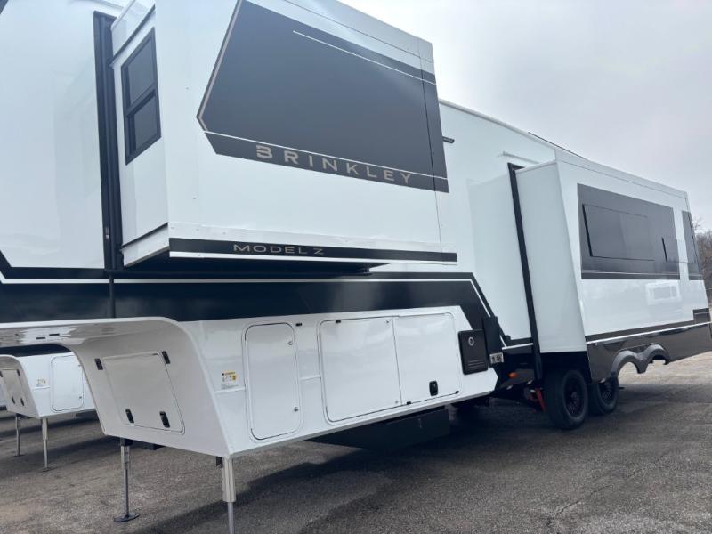 The Brinkley mid-profile Model Z fifth wheels bring you clean lines and an upscale look with plenty of style and exciting new features like the industry first brass plumbing connections. These units also feature an automotive grade front cap, plenty of exterior storage, dual exterior hot and cold showers, and wide stance leveling jacks for easy set up. Residential frameless windows provide a clean look and beautiful views, and ample electrical outlets and USB/USB-C outlets allow all of your electronics and appliances to easily be used and charged.