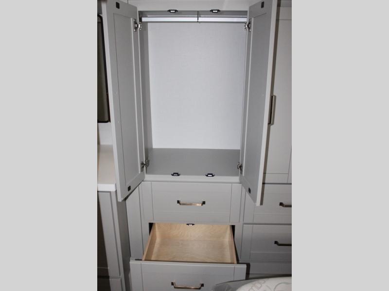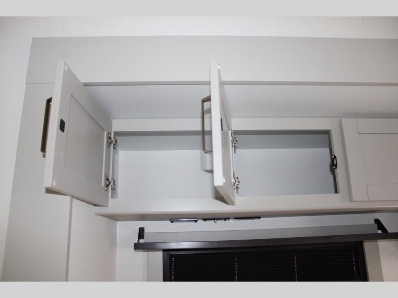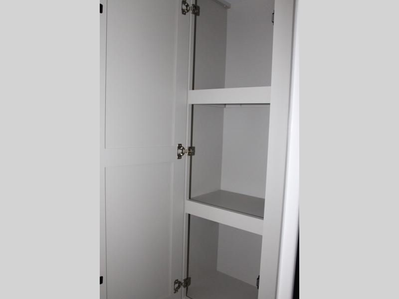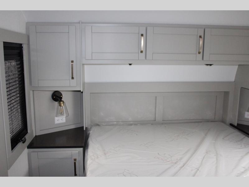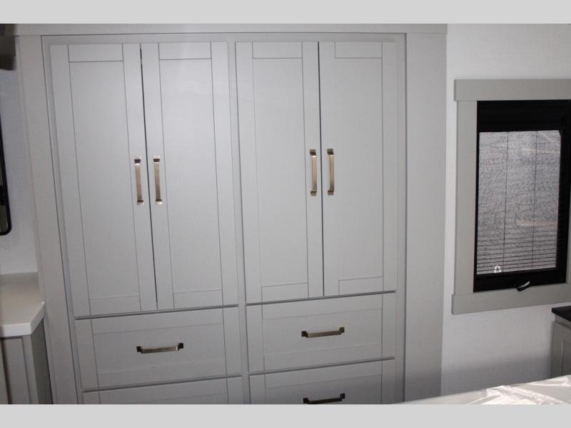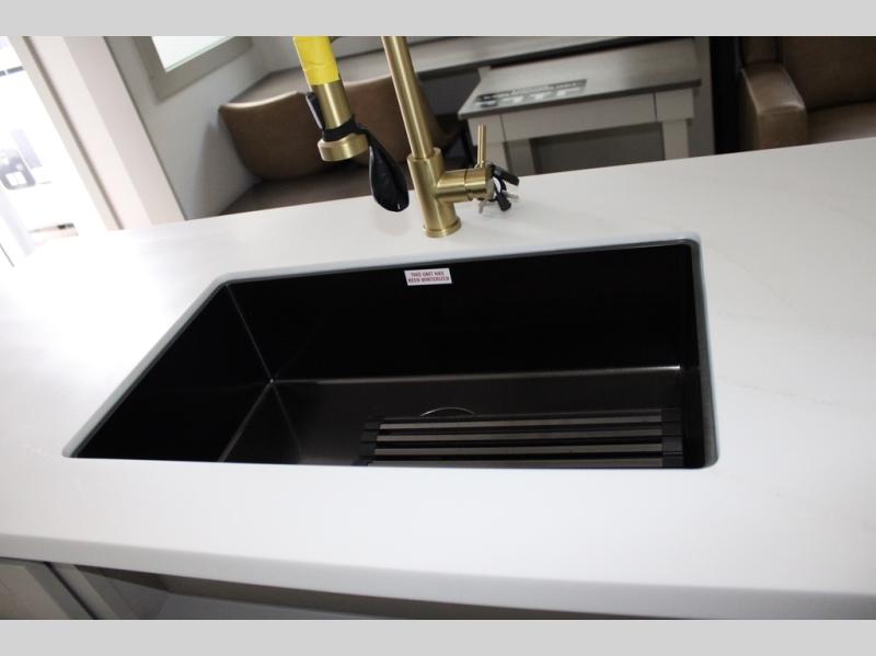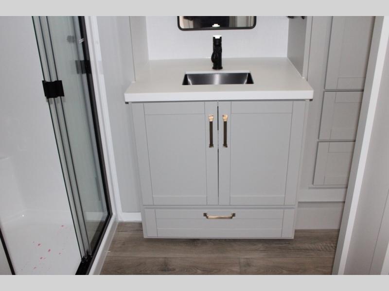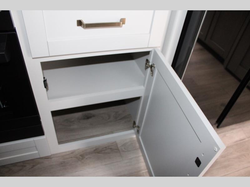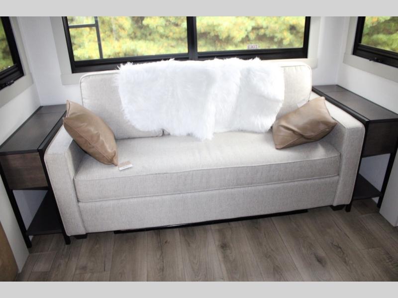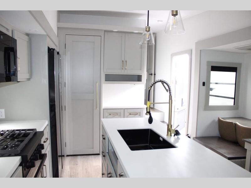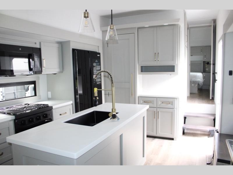 You're going to love every minute spent in this spacious fifth wheel that can sleep four. There is an inviting rear living area with a 72" tri-fold sofa and theater seating across from the televator and fireplace. The chef of your group can whip up dinner on the three burner cooktop or in the 30" residential microwave, and there is a 16 cu. ft. refrigerator that even opens when with the slide out is in. You will also enjoy the kitchen island with a farmhouse sink and roller cover, dual trash bins with a Stow N' Go paper towel holder, plus convenient dog bowls for your furry friends. You can store all your paper goods and snacks in the 84" pantry with adjustable shelving, and there is a hutch for nice dishes plus shoe storage in this model as well. Head to the front master bedroom where you'll find a queen bed with a TV, a large slide out with a wardrobe with drawers, plus a spacious bath.