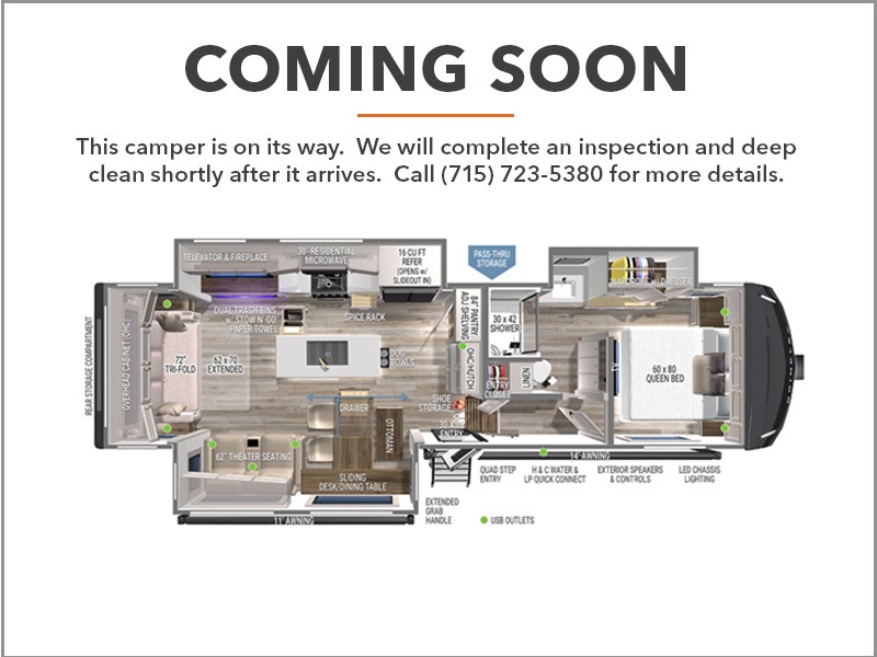 You're going to love every minute spent in this spacious fifth wheel that can sleep four. There is an inviting rear living area with a 72" tri-fold sofa and theater seating across from the televator and fireplace. The chef of your group can whip up dinner on the three burner cooktop or in the 30" residential microwave, and there is a 16 cu. ft. refrigerator that even opens when with the slide out is in. You will also enjoy the kitchen island with a farmhouse sink and roller cover, dual trash bins with a Stow N' Go paper towel holder, plus convenient dog bowls for your furry friends. You can store all your paper goods and snacks in the 84" pantry with adjustable shelving, and there is a hutch for nice dishes plus shoe storage in this model as well. Head to the front master bedroom where you'll find a queen bed with a TV, a large slide out with a wardrobe with drawers, plus a spacious bath.