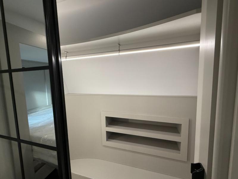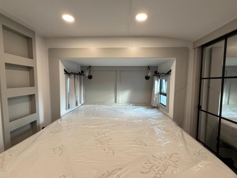 This Model Z luxury fifth wheel is bright and modern on the inside, with loads of amenities that will have you dreaming of your next trip! Enter and find a spacious combined living/kitchen space thanks to dual opposing slides. There is ample seating with a sliding desk/dining table, 62" theater seating, and a 72" tri-fold sofa along the rear wall. You can easily relax and enjoy the 50" Smart telescoping TV with a cozy fireplace below. The kitchen offers all that you need to prepare and cook meals just like home with a 16 cu. ft. refrigerator for your perishables, a 30" microwave oven, and three burner range top and oven. You will love the integrated spice rack, and the kitchen island all outfitted with dog bowls and double pull out trash bins with an integrated Stow 'N Go paper towel holder. There is also an 84" pantry with adjustable shelves for all of your canned and dry goods. Head up the steps to a private master suite with king bed slide. You can opt for the queen bed if you like. A sliding dresser top features hidden storage which is perfect for jewelry and other personal belongings. The front wardrobe features mirrored doors and the corner closet has been prepped for a stackable washer and dryer if you choose to add that option. Relax and enjoy a large bath featuring a linen cabinet, a 30" x 42" shower, and vanity with sink, plus medicine cabinet.