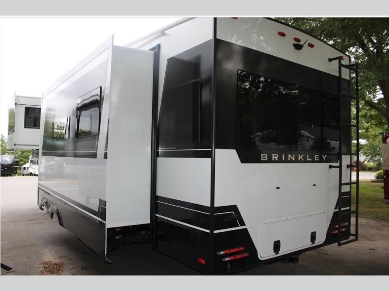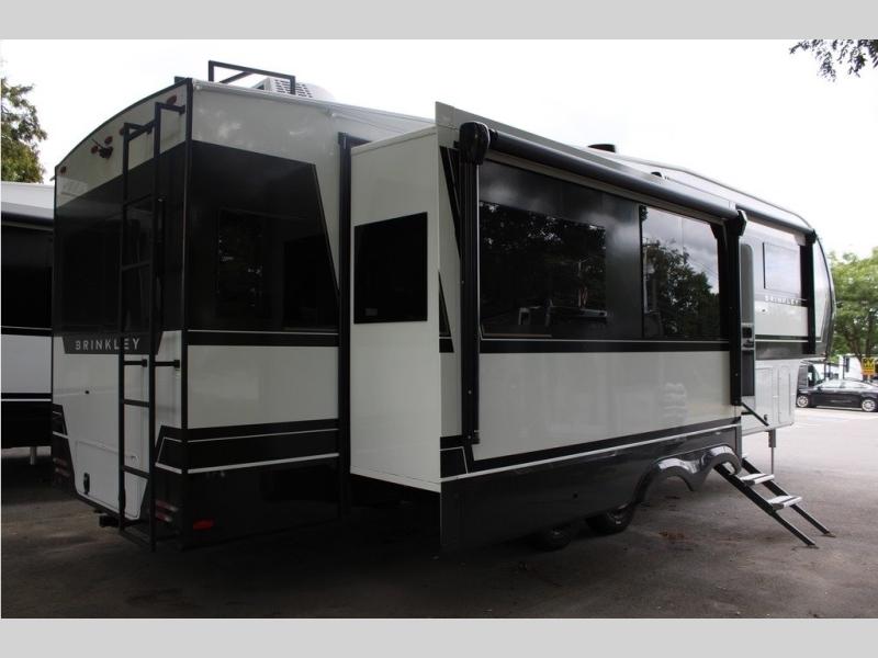 The Brinkley mid-profile Model Z fifth wheels bring you clean lines and an upscale look with plenty of style and exciting new features like the industry first brass plumbing connections. These units also feature an automotive grade front cap, plenty of exterior storage, dual exterior hot and cold showers, and wide stance leveling jacks for easy set up. Residential frameless windows provide a clean look and beautiful views, and ample electrical outlets and 6 USB/USB-C outlets allow all of your electronics and appliances to easily be used and charged.