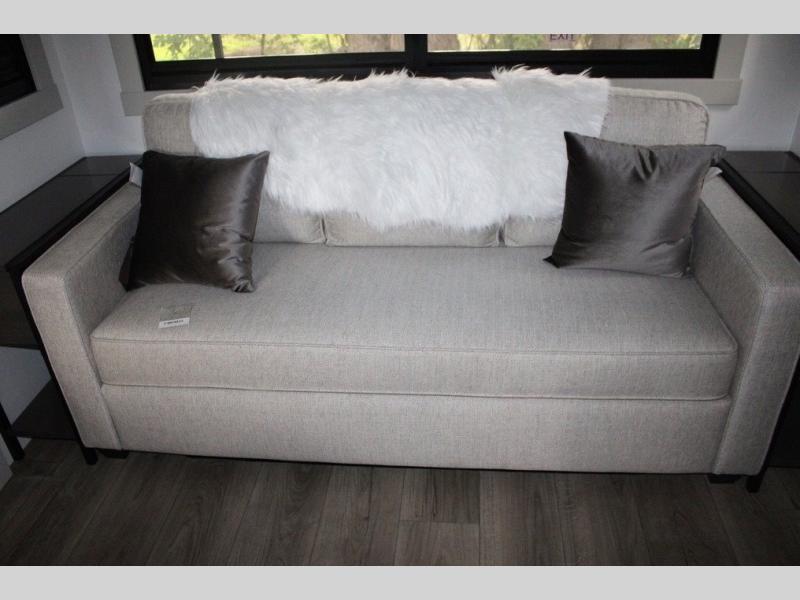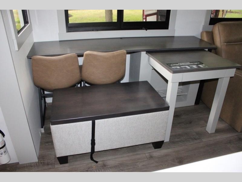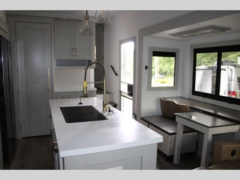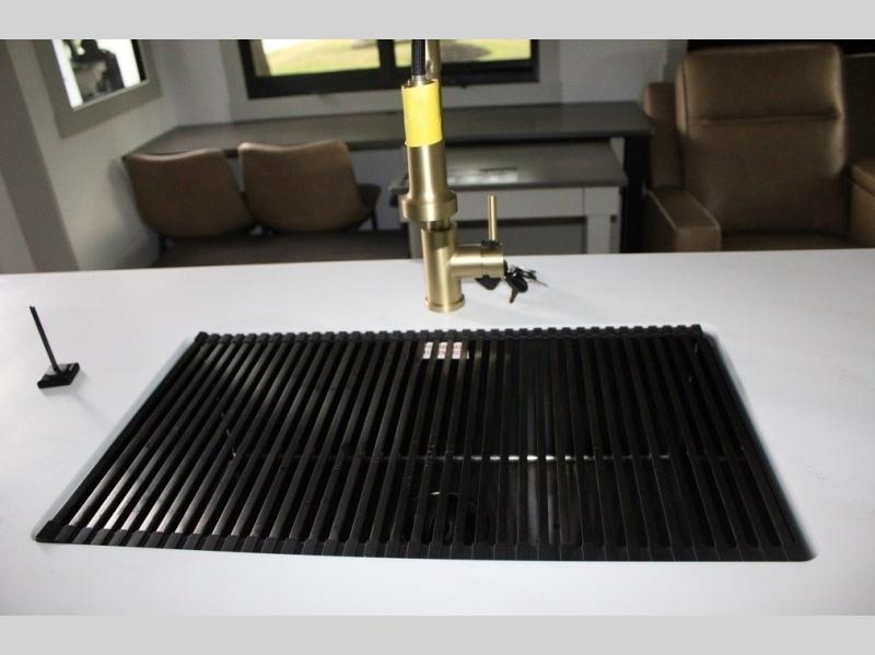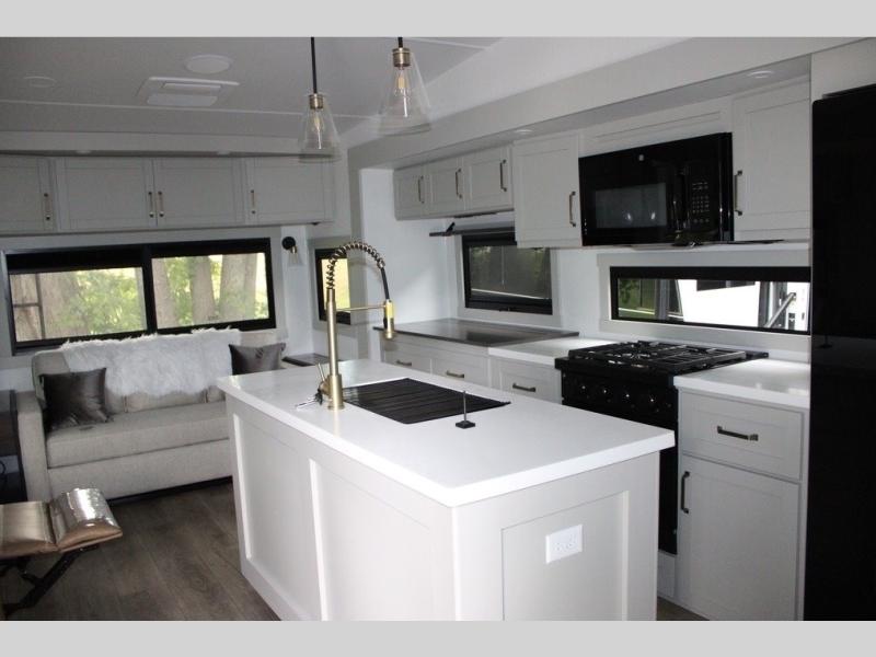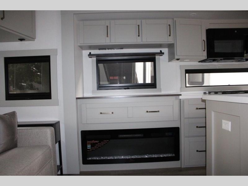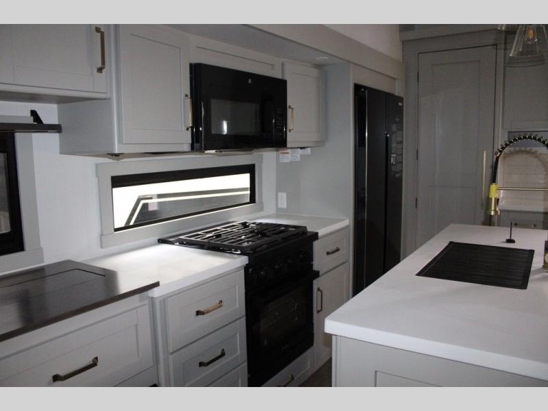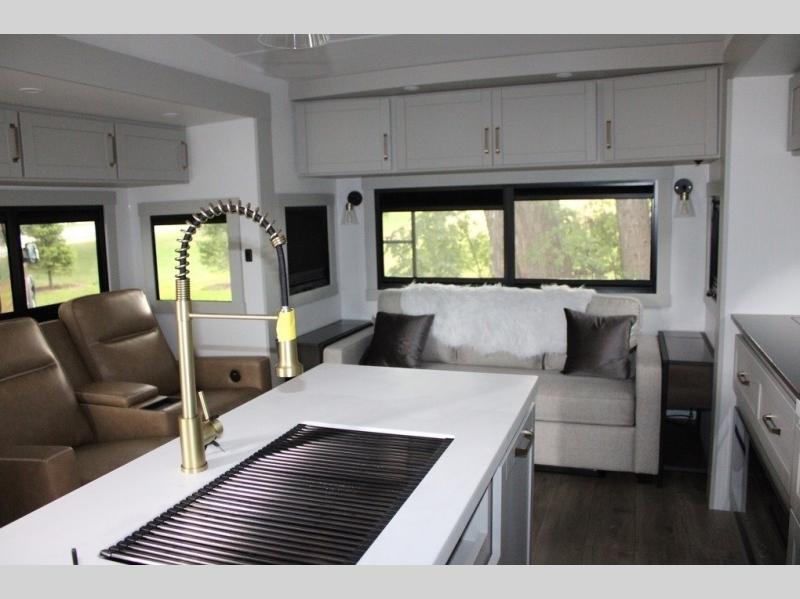 This Model Z luxury fifth wheel is bright and modern on the inside, with loads of amenities that will have you dreaming of your next trip! Enter and find a spacious combined living/kitchen space thanks to dual opposing slides. There is ample seating with a sliding desk/dining table, 62" theater seating, and a 72" tri-fold sofa along the rear wall. You can easily relax and enjoy the 50" Smart telescoping TV with a cozy fireplace below. The kitchen offers all that you need to prepare and cook meals just like home with a 16 cu. ft. refrigerator for your perishables, a 30" microwave oven, and three burner range top and oven. You will love the integrated spice rack, and the kitchen island all outfitted with dog bowls and double pull out trash bins with an integrated Stow 'N Go paper towel holder. There is also an 84" pantry with adjustable shelves for all of your canned and dry goods. Head up the steps to a private master suite with king bed slide. You can opt for the queen bed if you like. A sliding dresser top features hidden storage which is perfect for jewelry and other personal belongings. The front wardrobe features mirrored doors and the corner closet has been prepped for a stackable washer and dryer if you choose to add that option. Relax and enjoy a large bath featuring a linen cabinet, a 30" x 42" shower, and vanity with sink, plus medicine cabinet.