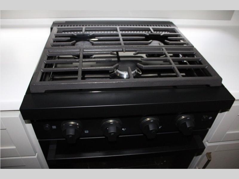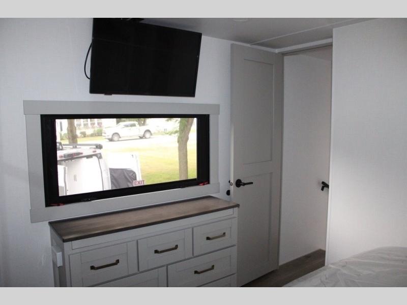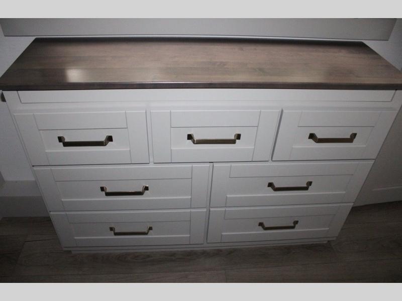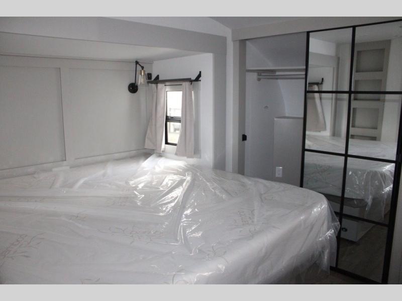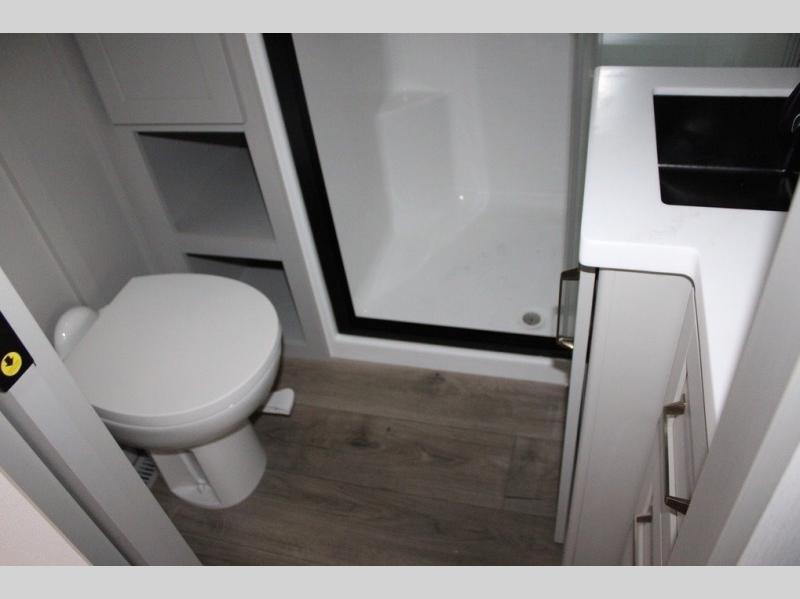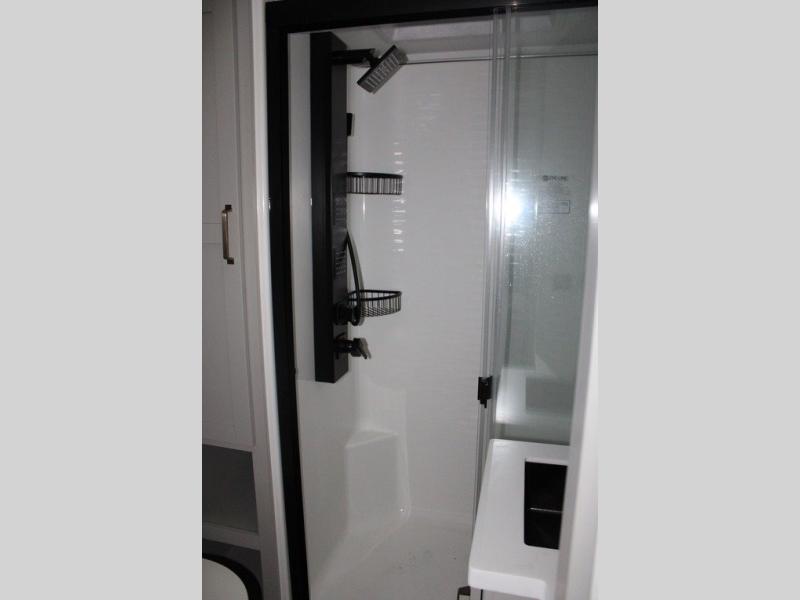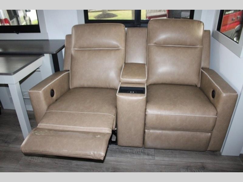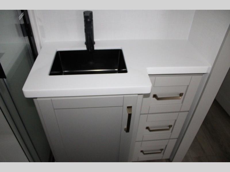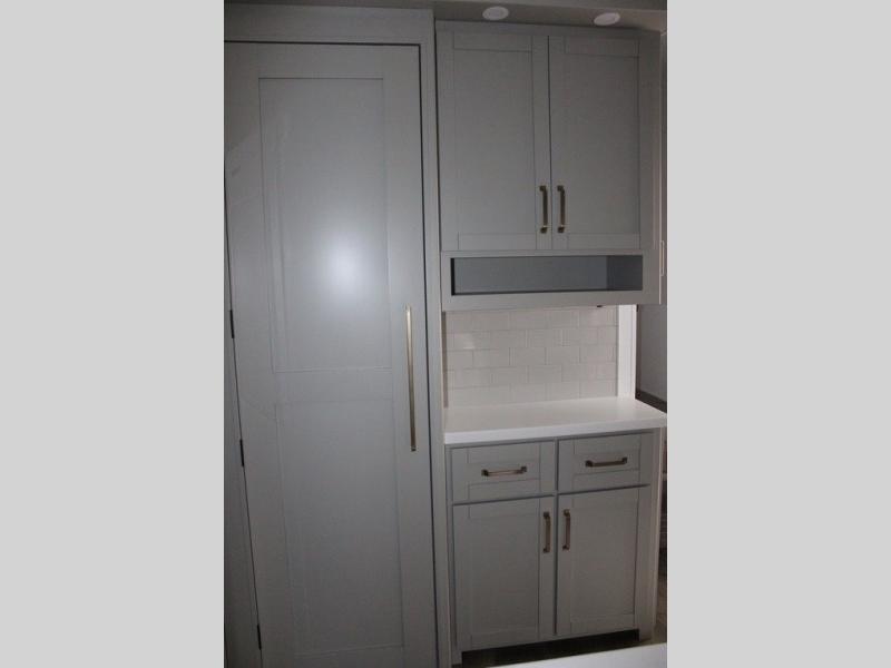 This Model Z luxury fifth wheel is bright and modern on the inside, with loads of amenities that will have you dreaming of your next trip! Enter and find a spacious combined living/kitchen space thanks to dual opposing slides. There is ample seating with a sliding desk/dining table, 62" theater seating, and a 72" tri-fold sofa along the rear wall. You can easily relax and enjoy the 50" Smart telescoping TV with a cozy fireplace below. The kitchen offers all that you need to prepare and cook meals just like home with a 16 cu. ft. refrigerator for your perishables, a 30" microwave oven, and three burner range top and oven. You will love the integrated spice rack, and the kitchen island all outfitted with dog bowls and double pull out trash bins with an integrated Stow 'N Go paper towel holder. There is also an 84" pantry with adjustable shelves for all of your canned and dry goods. Head up the steps to a private master suite with king bed slide. You can opt for the queen bed if you like. A sliding dresser top features hidden storage which is perfect for jewelry and other personal belongings. The front wardrobe features mirrored doors and the corner closet has been prepped for a stackable washer and dryer if you choose to add that option. Relax and enjoy a large bath featuring a linen cabinet, a 30" x 42" shower, and vanity with sink, plus medicine cabinet.
