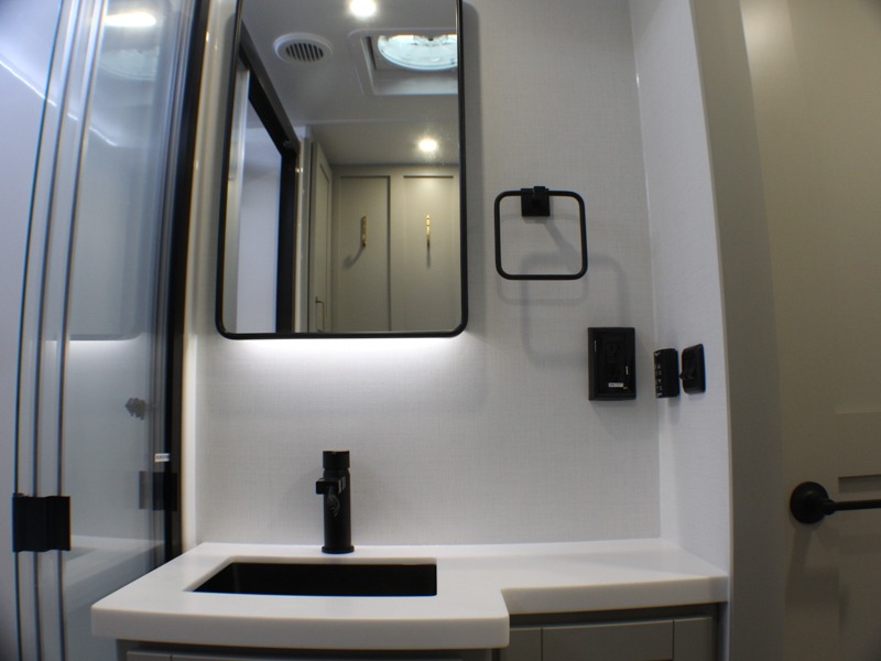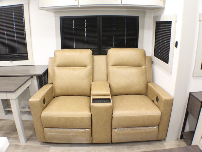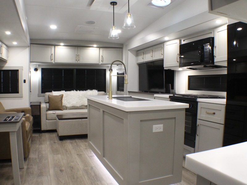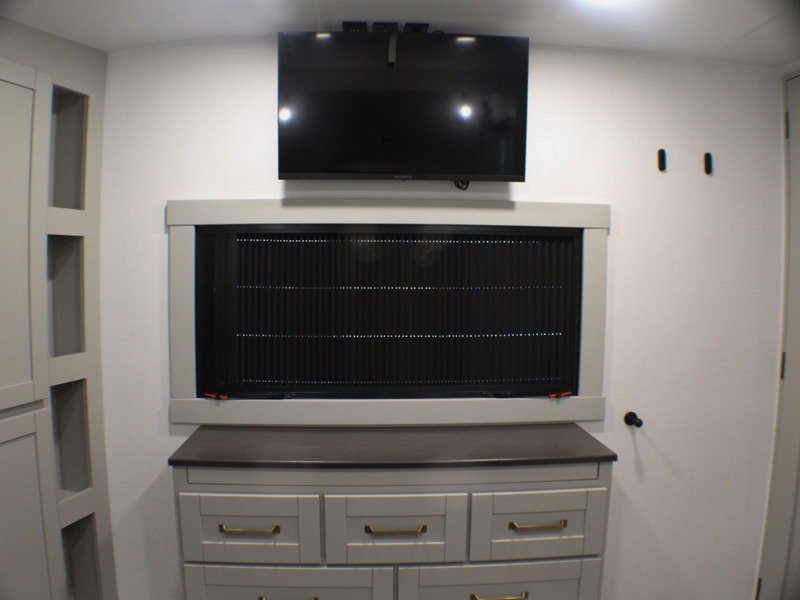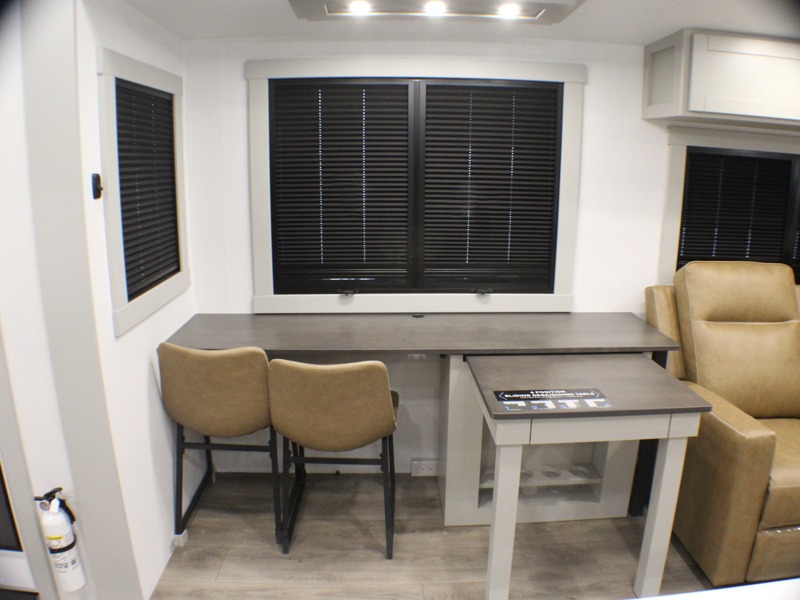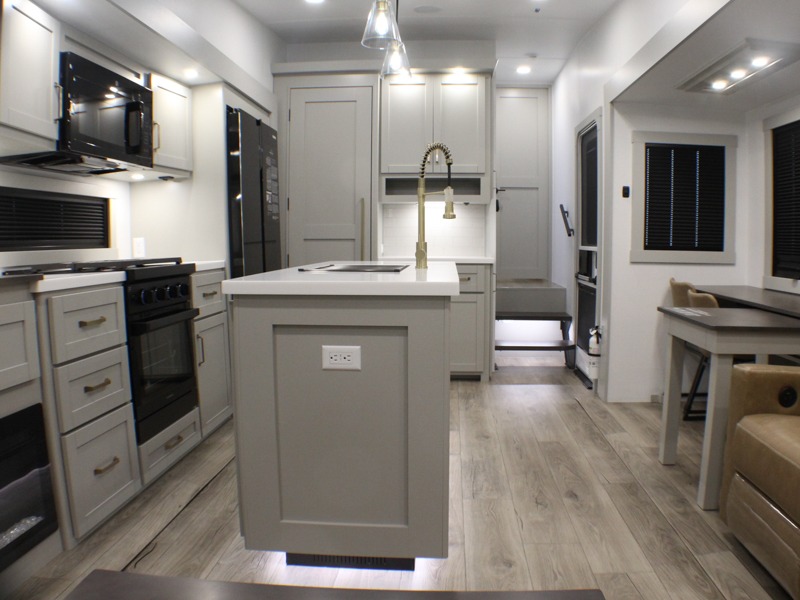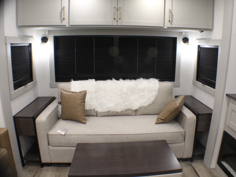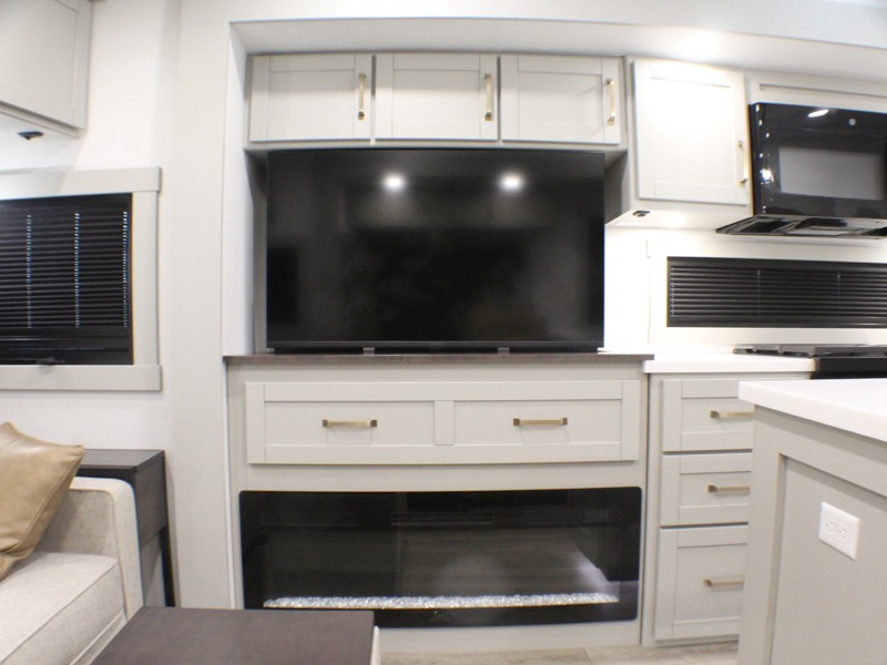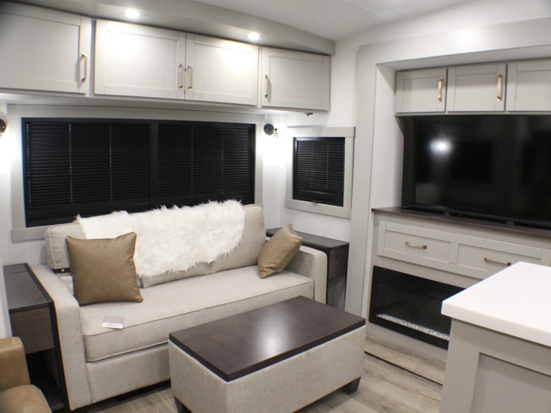 This Model Z luxury fifth wheel is bright and modern on the inside, with loads of amenities that will have you dreaming of your next trip! Enter and find a spacious combined living/kitchen space thanks to dual opposing slides. There is ample seating with a sliding desk/dining table, 62" theater seating, and a 72" tri-fold sofa along the rear wall. You can easily relax and enjoy the 50" Smart telescoping TV with a cozy fireplace below. The kitchen offers all that you need to prepare and cook meals just like home with a 16 cu. ft. refrigerator for your perishables, a 30" microwave oven, and three burner range top and oven. You will love the integrated spice rack, and the kitchen island all outfitted with dog bowls and double pull out trash bins with an integrated Stow 'N Go paper towel holder. There is also an 84" pantry with adjustable shelves for all of your canned and dry goods. Head up the steps to a private master suite with king bed slide. You can opt for the queen bed if you like. A sliding dresser top features hidden storage which is perfect for jewelry and other personal belongings. The front wardrobe features mirrored doors and the corner closet has been prepped for a stackable washer and dryer if you choose to add that option. Relax and enjoy a large bath featuring a linen cabinet, a 30" x 42" shower, and vanity with sink, plus medicine cabinet.