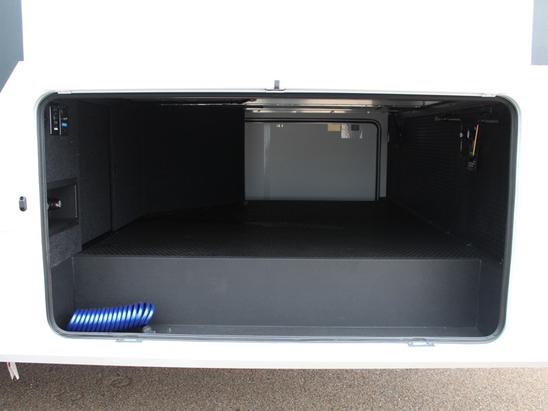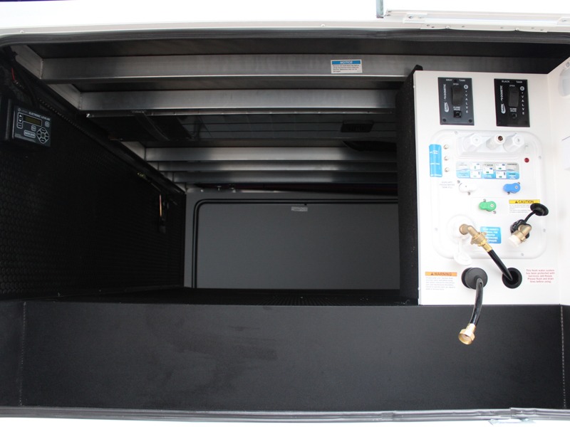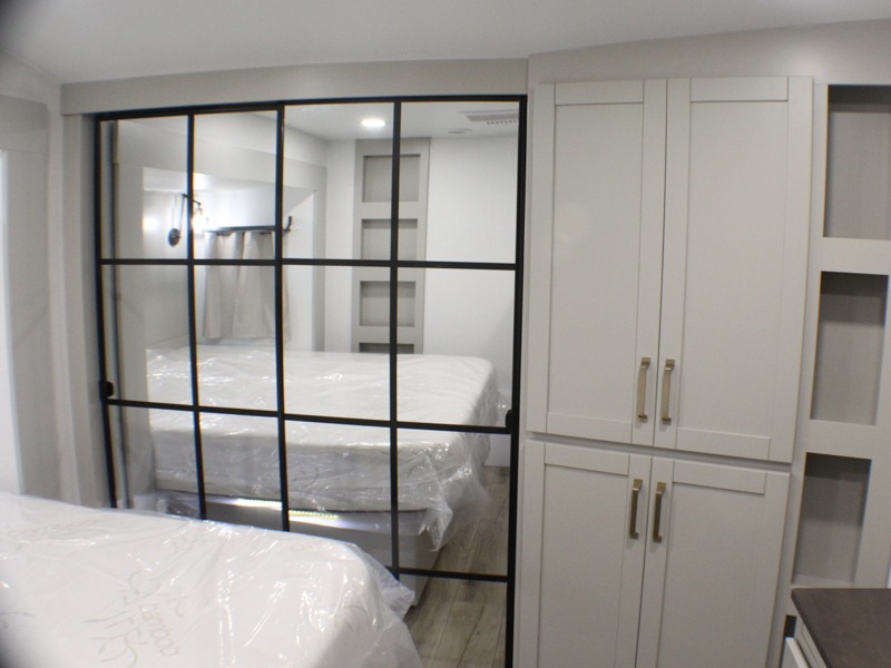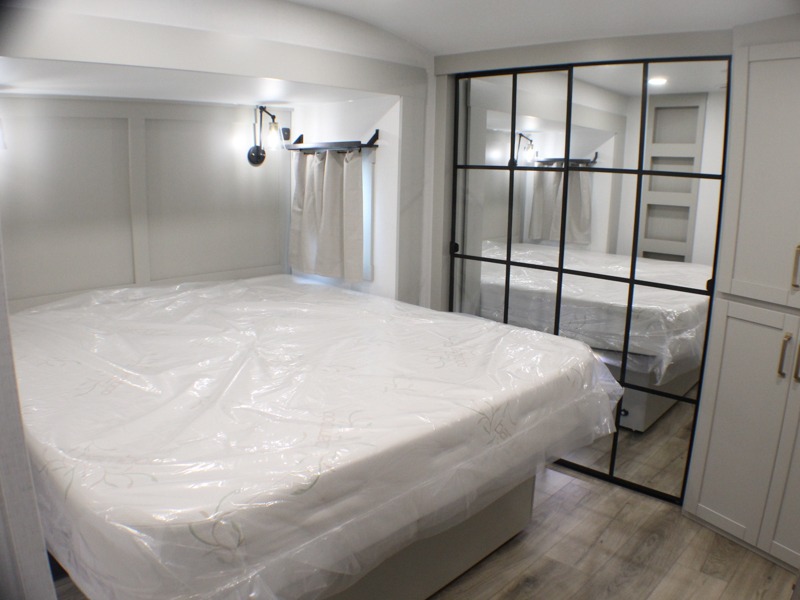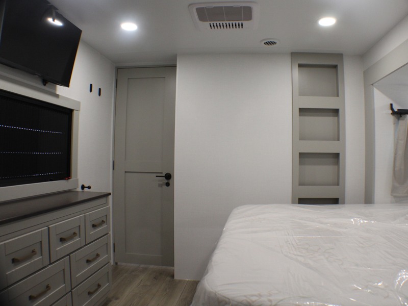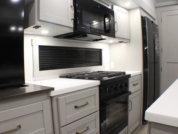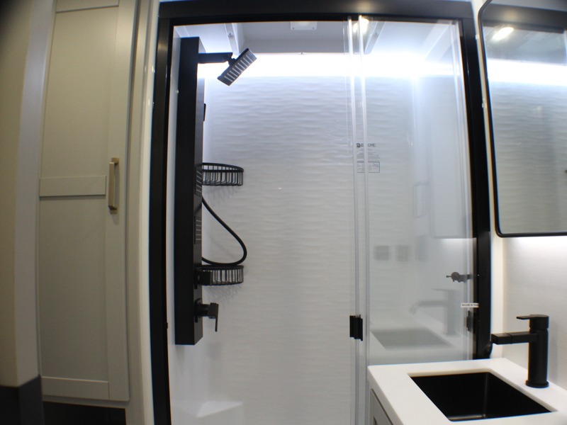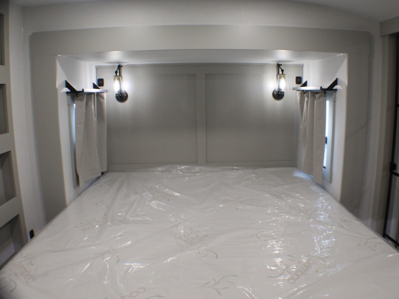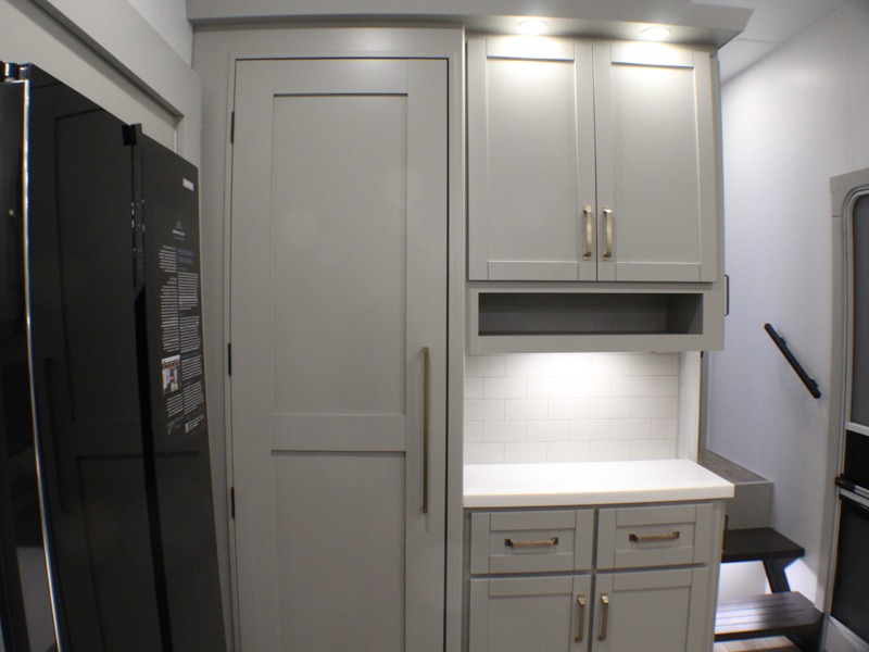 This Model Z luxury fifth wheel is bright and modern on the inside, with loads of amenities that will have you dreaming of your next trip! Enter and find a spacious combined living/kitchen space thanks to dual opposing slides. There is ample seating with a sliding desk/dining table, 62" theater seating, and a 72" tri-fold sofa along the rear wall. You can easily relax and enjoy the 50" Smart telescoping TV with a cozy fireplace below. The kitchen offers all that you need to prepare and cook meals just like home with a 16 cu. ft. refrigerator for your perishables, a 30" microwave oven, and three burner range top and oven. You will love the integrated spice rack, and the kitchen island all outfitted with dog bowls and double pull out trash bins with an integrated Stow 'N Go paper towel holder. There is also an 84" pantry with adjustable shelves for all of your canned and dry goods. Head up the steps to a private master suite with king bed slide. You can opt for the queen bed if you like. A sliding dresser top features hidden storage which is perfect for jewelry and other personal belongings. The front wardrobe features mirrored doors and the corner closet has been prepped for a stackable washer and dryer if you choose to add that option. Relax and enjoy a large bath featuring a linen cabinet, a 30" x 42" shower, and vanity with sink, plus medicine cabinet.