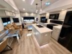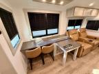 This Model Z luxury fifth wheel is bright and modern on the inside, with loads of amenities that will have you dreaming of your next trip! Enter and find a spacious combined living/kitchen space thanks to dual opposing slides. There is ample seating with a sliding desk/dining table, 62" theater seating, and a 72" tri-fold sofa along the rear wall. You can easily relax and enjoy the 50" Smart telescoping TV with a cozy fireplace below. The kitchen offers all that you need to prepare and cook meals just like home with a 16 cu. ft. refrigerator for your perishables, a 30" microwave oven, and three burner range top and oven. You will love the integrated spice rack, and the kitchen island all outfitted with dog bowls and double pull out trash bins with an integrated Stow 'N Go paper towel holder. There is also an 84" pantry with adjustable shelves for all of your canned and dry goods. Head up the steps to a private master suite with king bed slide. You can opt for the queen bed if you like. A sliding dresser top features hidden storage which is perfect for jewelry and other personal belongings. The front wardrobe features mirrored doors and the corner closet has been prepped for a stackable washer and dryer if you choose to add that option. Relax and enjoy a large bath featuring a linen cabinet, a 30" x 42" shower, and vanity with sink, plus medicine cabinet.