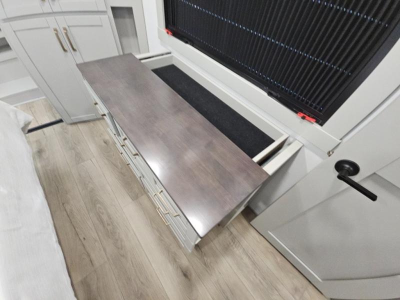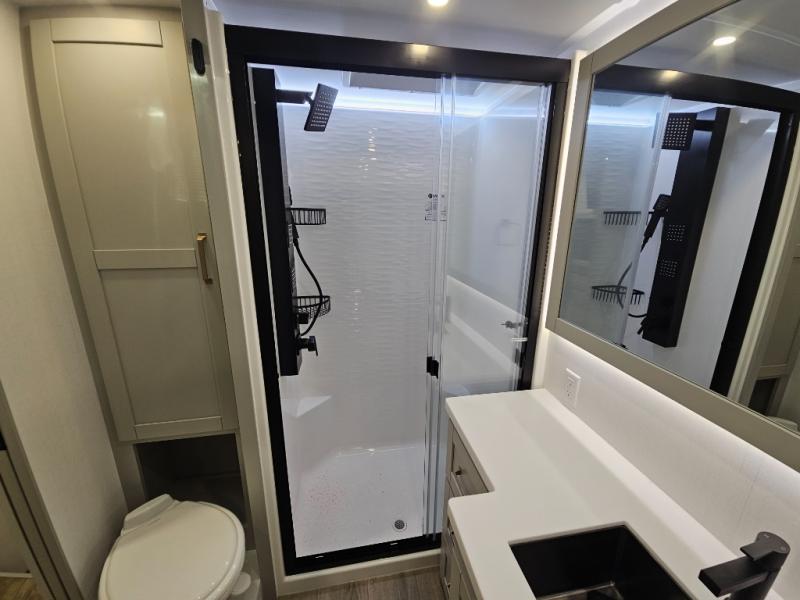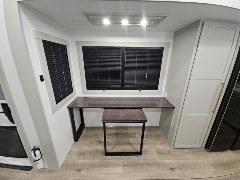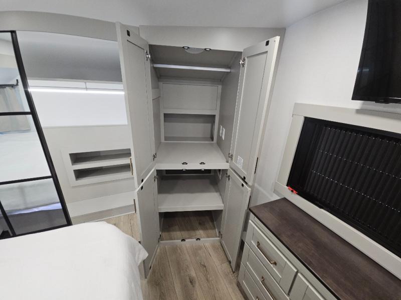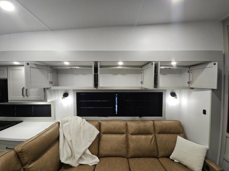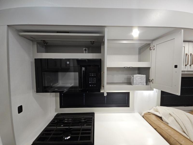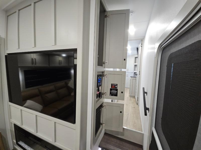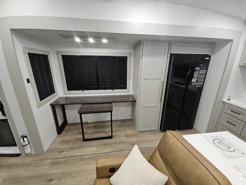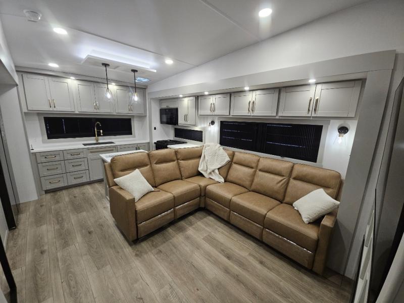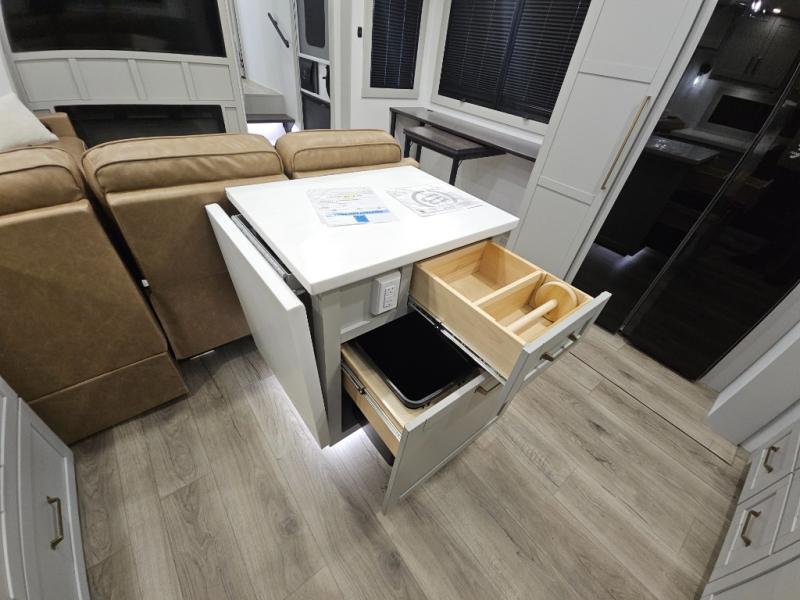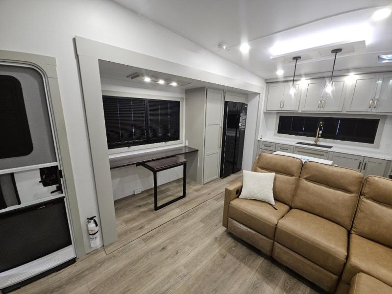 Escape to a world of comfort and luxury with this incredible fifth wheel! The living area features a plush L-sofa, five recliners, and a warm fireplace. The versatile dining table/L desk seats up to four people, making it perfect for meals, work, or play. Ample shoe storage and a convenient spot for pet bowls enhance comfort and practicality. The kitchen offers stunning solid surface countertops, dishwasher prep, a residential microwave, and a three-burner cooktop. The expansive pantry with pull-out drawers provides ample storage for your favorite ingredients and cooking essentials. The full bathroom is a serene oasis, featuring a linen closet for added storage and convenience. The front bedroom is a peaceful sanctuary, featuring a spacious king bed, shelves, and a sliding dresser top with hidden storage. The generous wardrobe and shoe rack provide ample storage for your clothes and shoes.