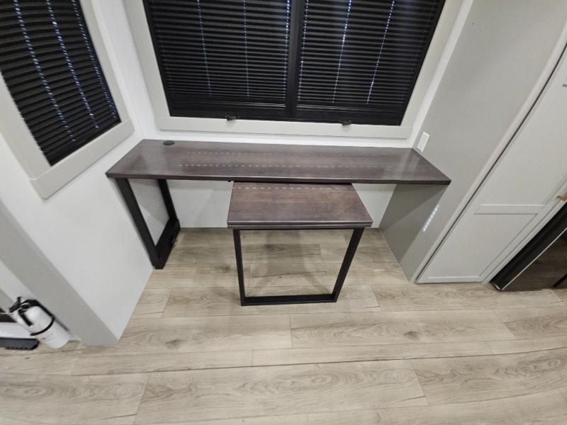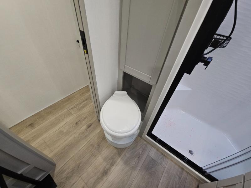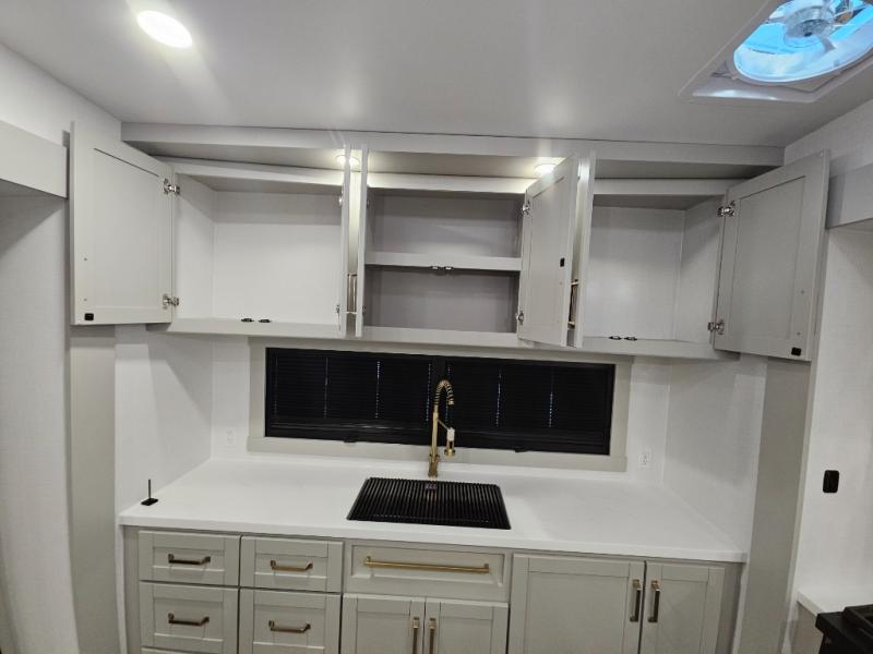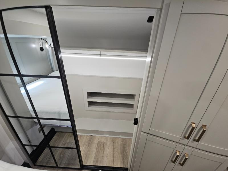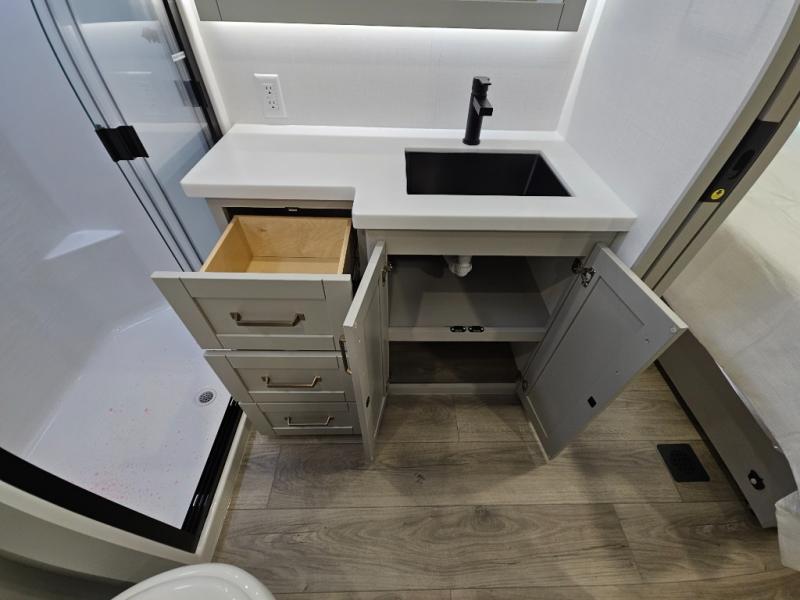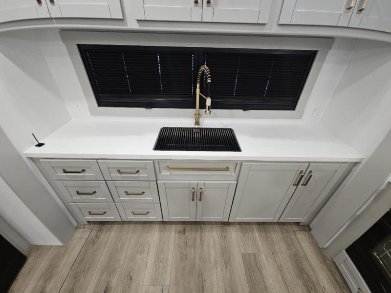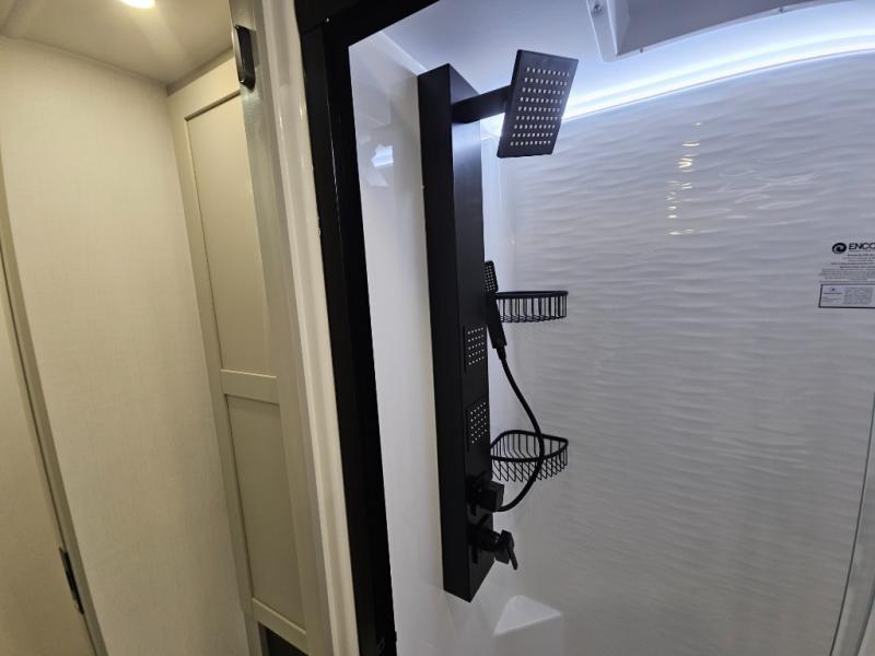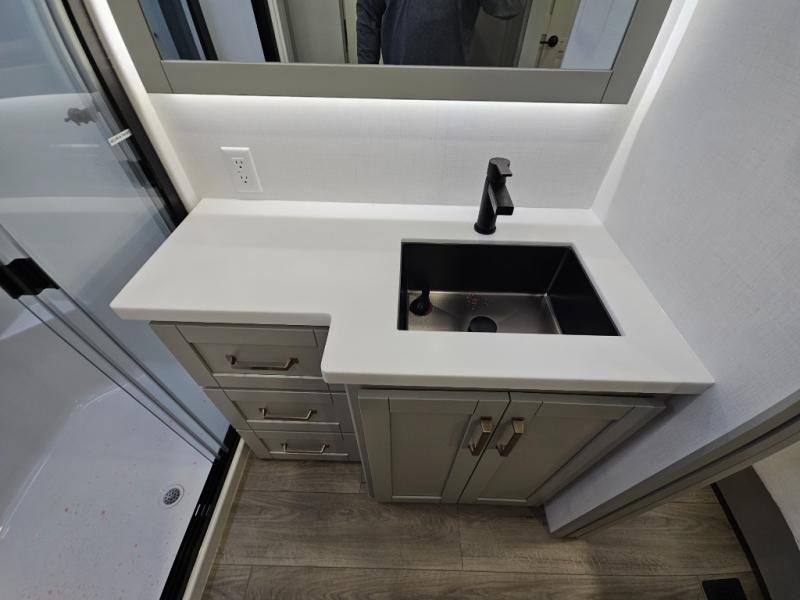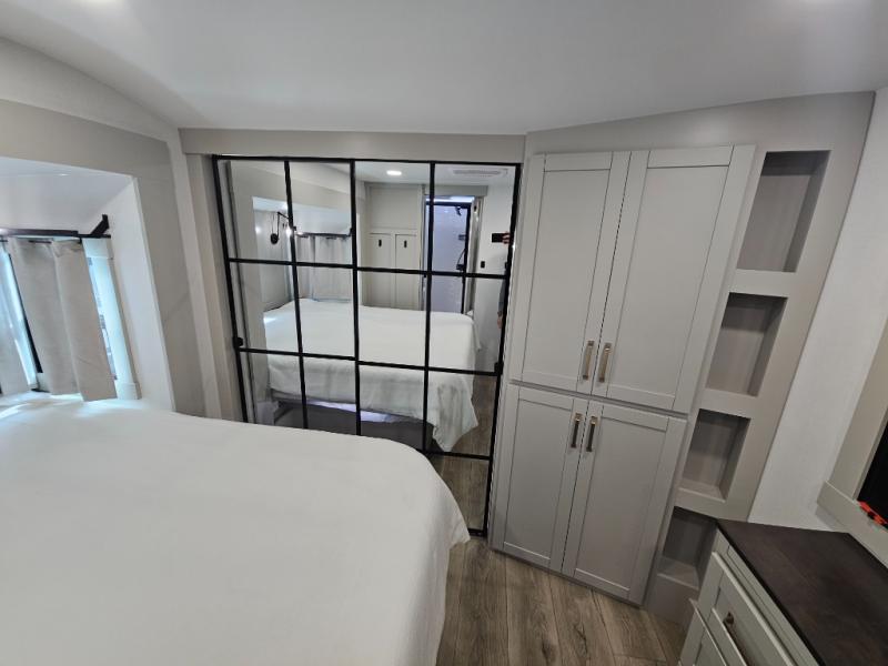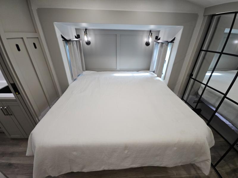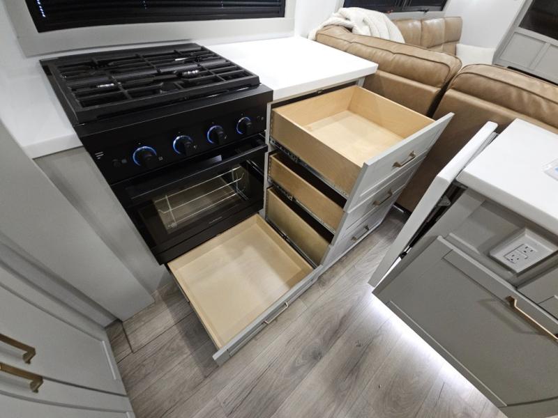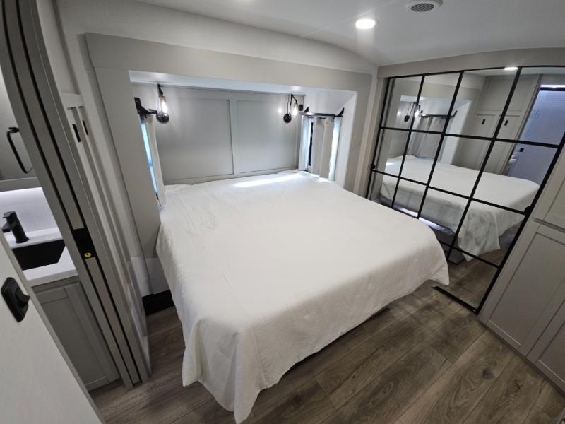 Escape to a world of comfort and luxury with this incredible fifth wheel! The living area features a plush L-sofa, five recliners, and a warm fireplace. The versatile dining table/L desk seats up to four people, making it perfect for meals, work, or play. Ample shoe storage and a convenient spot for pet bowls enhance comfort and practicality. The kitchen offers stunning solid surface countertops, dishwasher prep, a residential microwave, and a three-burner cooktop. The expansive pantry with pull-out drawers provides ample storage for your favorite ingredients and cooking essentials. The full bathroom is a serene oasis, featuring a linen closet for added storage and convenience. The front bedroom is a peaceful sanctuary, featuring a spacious king bed, shelves, and a sliding dresser top with hidden storage. The generous wardrobe and shoe rack provide ample storage for your clothes and shoes.