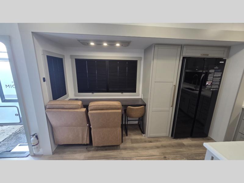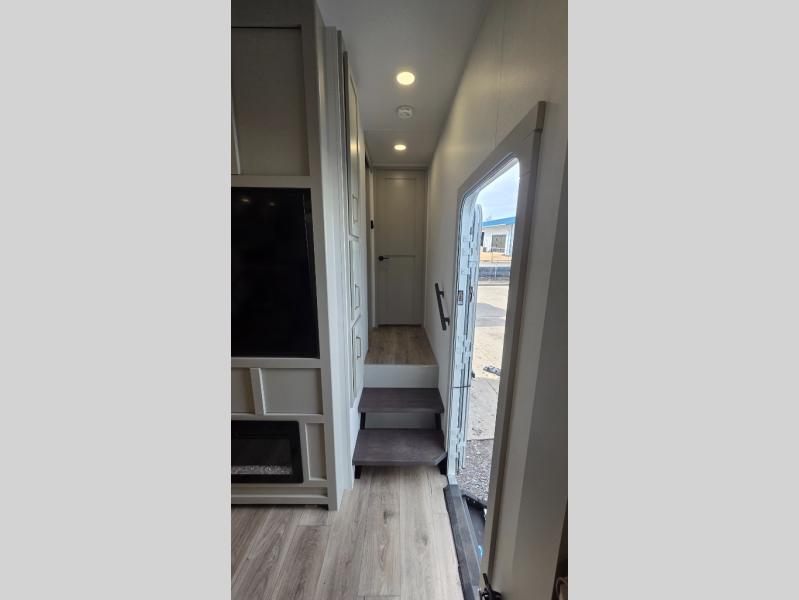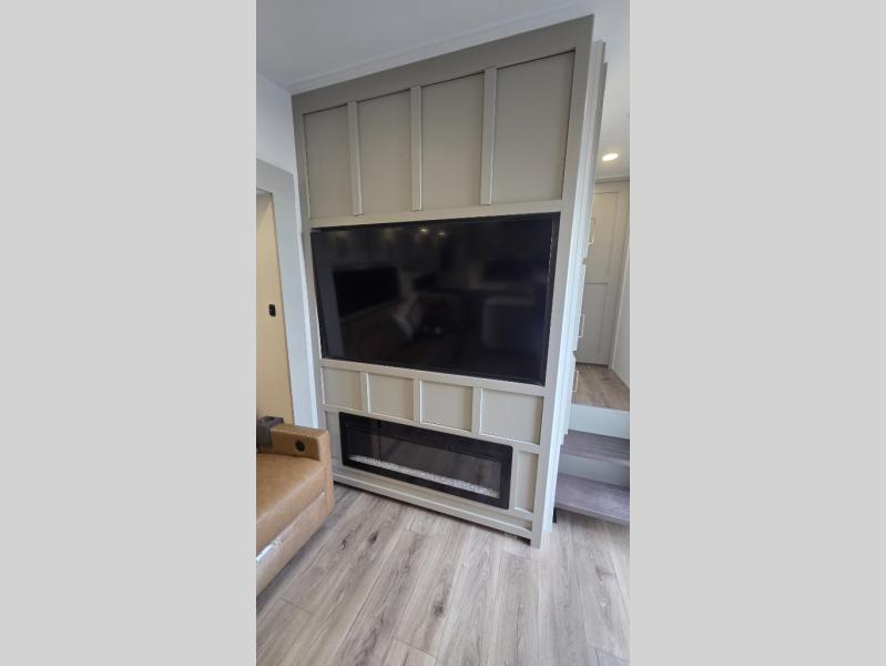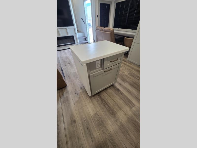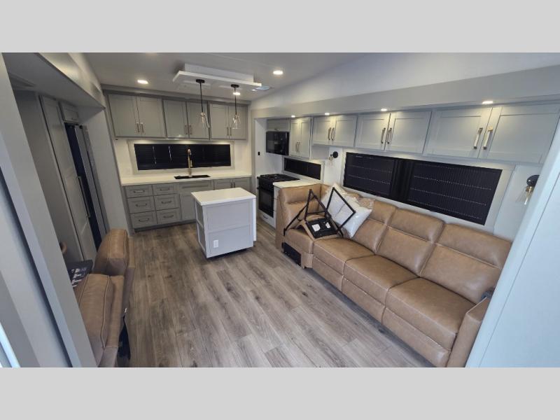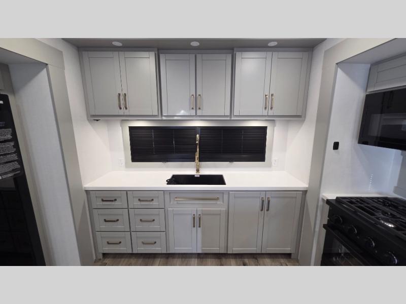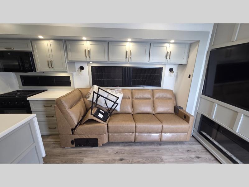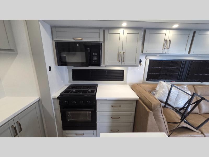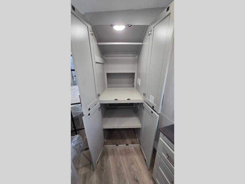 This unit is perfect for weekends at the campground or extended stays! There is ample seating with a sliding desk/dining table, 62" theater seating, and a 72" tri-fold sofa along the rear wall. You can easily relax and enjoy the telescoping TV with a cozy fireplace below. The kitchen offers all that you need to prepare and cook meals just like home with a 16-cu. ft. refrigerator for your perishables, a 30" residential microwave oven, and three burner range top and oven. You will love the kitchen island all outfitted with pull-out pet bowls and double pull-out trash bins with an integrated Stow & Go paper towel holder. There is also an 84" pantry with adjustable shelves for all of your canned and dry goods. Head up the steps to a find a full bath and a private bedroom with a king bed slide all the way up front. A sliding dresser top features hidden storage which is perfect for jewelry and other personal belongings. The front wardrobe features mirrored doors, and the corner closet has been prepped for a stackable washer and dryer if you choose to add that option.