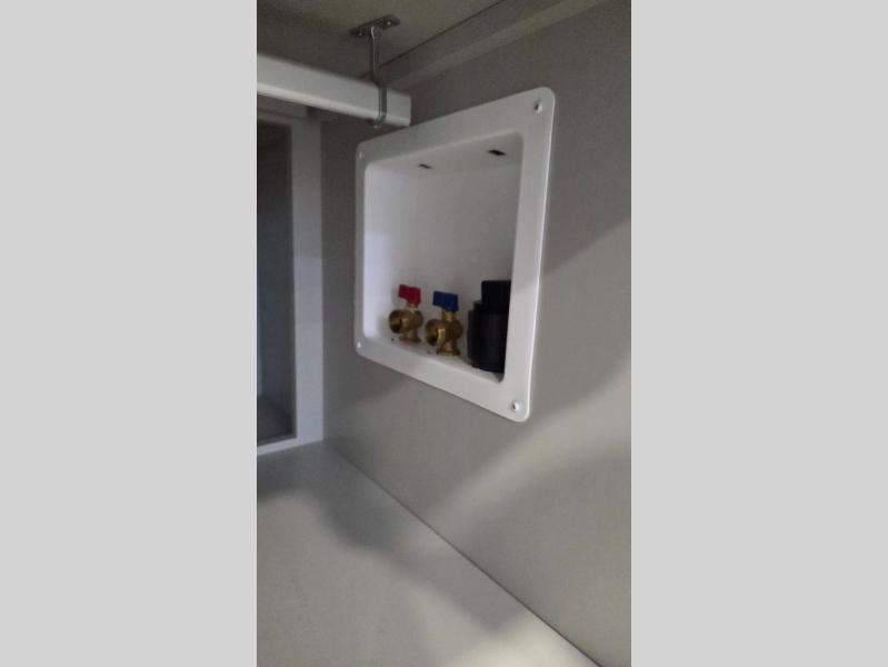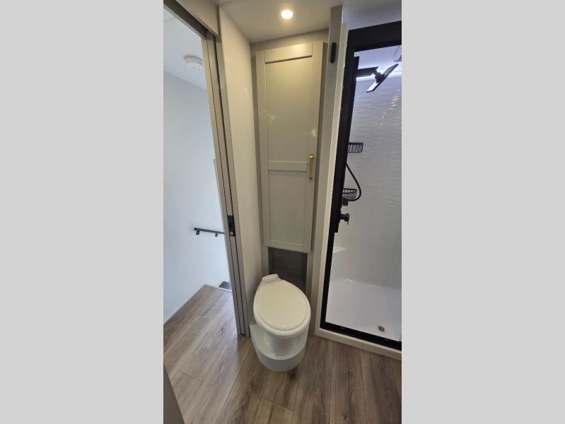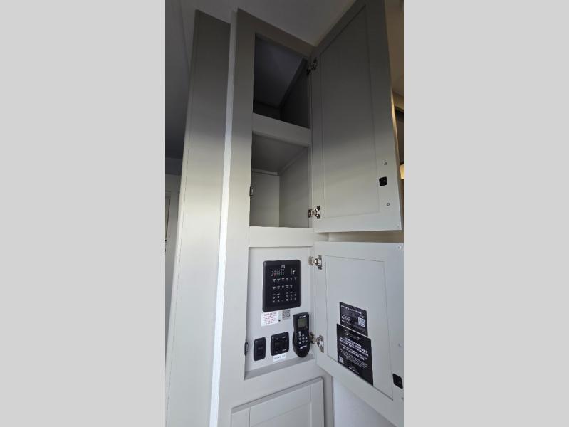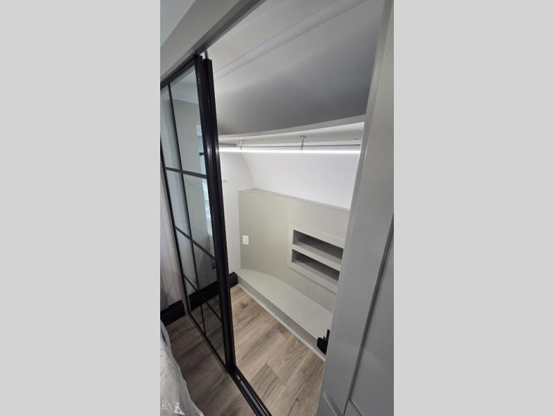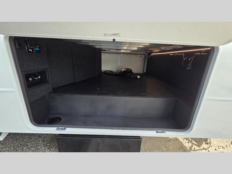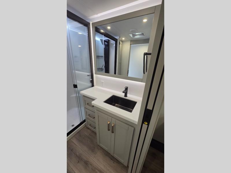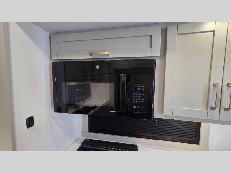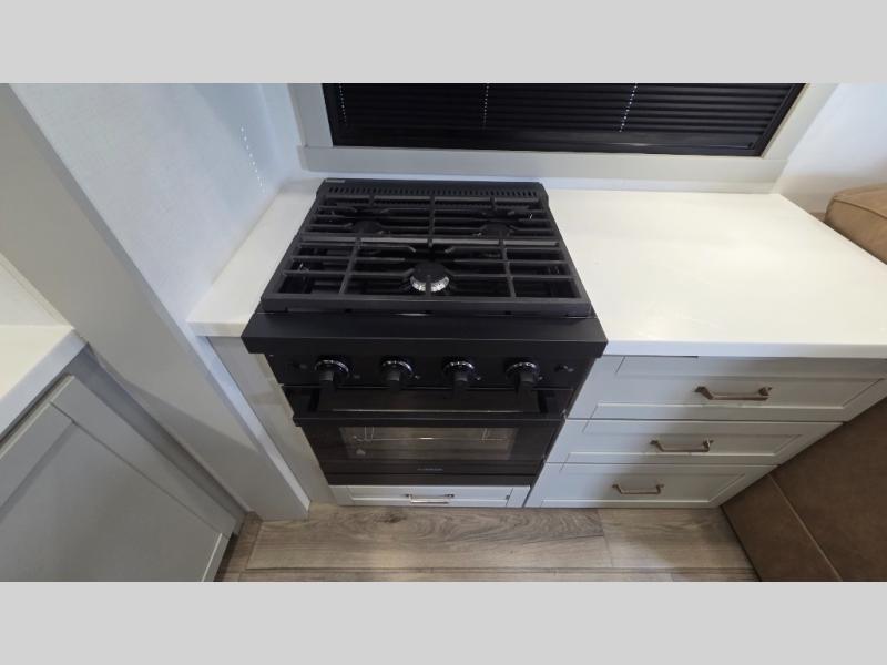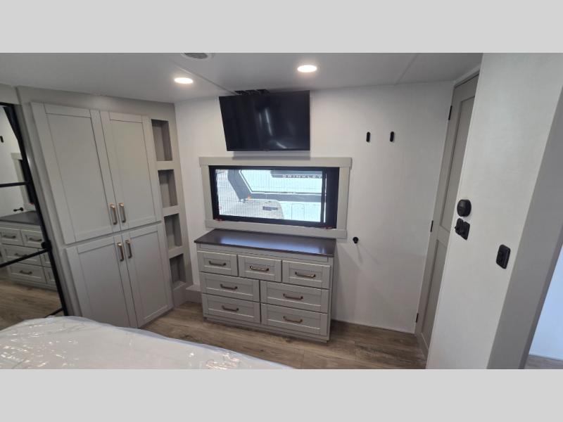 This unit is perfect for weekends at the campground or extended stays! There is ample seating with a sliding desk/dining table, 62" theater seating, and a 72" tri-fold sofa along the rear wall. You can easily relax and enjoy the telescoping TV with a cozy fireplace below. The kitchen offers all that you need to prepare and cook meals just like home with a 16-cu. ft. refrigerator for your perishables, a 30" residential microwave oven, and three burner range top and oven. You will love the kitchen island all outfitted with pull-out pet bowls and double pull-out trash bins with an integrated Stow & Go paper towel holder. There is also an 84" pantry with adjustable shelves for all of your canned and dry goods. Head up the steps to a find a full bath and a private bedroom with a king bed slide all the way up front. A sliding dresser top features hidden storage which is perfect for jewelry and other personal belongings. The front wardrobe features mirrored doors, and the corner closet has been prepped for a stackable washer and dryer if you choose to add that option.