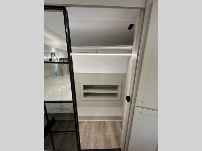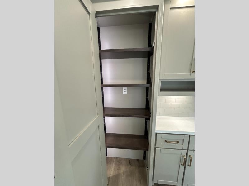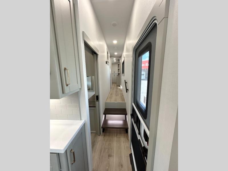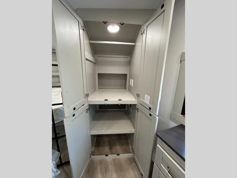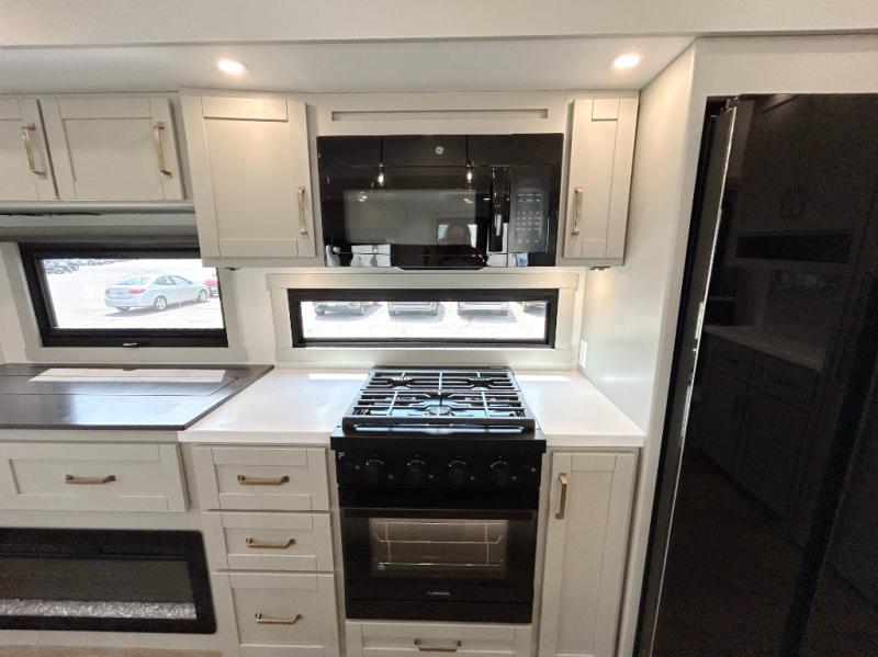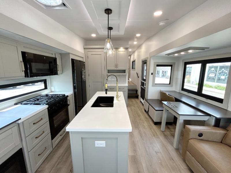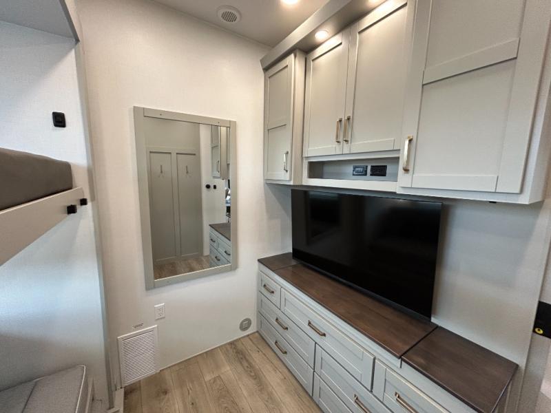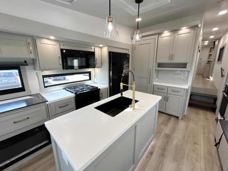 This unit is perfect for your family that needs sleeping space for eight! There is ample seating with a sliding desk/dining table, 62" theater seating, and a 72" tri-fold sofa along the rear wall. You can easily relax and enjoy the telescoping TV with a cozy fireplace below. The kitchen offers all that you need to prepare and cook meals just like home with a 16 cu. ft. refrigerator for your perishables, a 30" residential microwave oven, and three burner range top and oven. You will love the kitchen island all outfitted with pull-out pet bowls and double pull out trash bins with an integrated Stow & Go paper towel holder. There is also an 84" pantry with adjustable shelves for all of your canned and dry goods. Mid-coach, just ahead through the main entry, is a bonus room that can be used as a bedroom featuring a sofa bed with flip-up overhead bunk and trundle below, or an office with pull-out desk so that you can work easily while you travel, or it could also be used as a gaming room since there is also a 50" Smart TV. Head up the steps to a bathroom on your left and a private master suite with king bed slide all the way up front. A sliding dresser top features hidden storage which is perfect for jewelry and other personal belongings. The front wardrobe features mirrored doors and the corner closet has been prepped for a stackable washer and dryer if you choose to add that option.