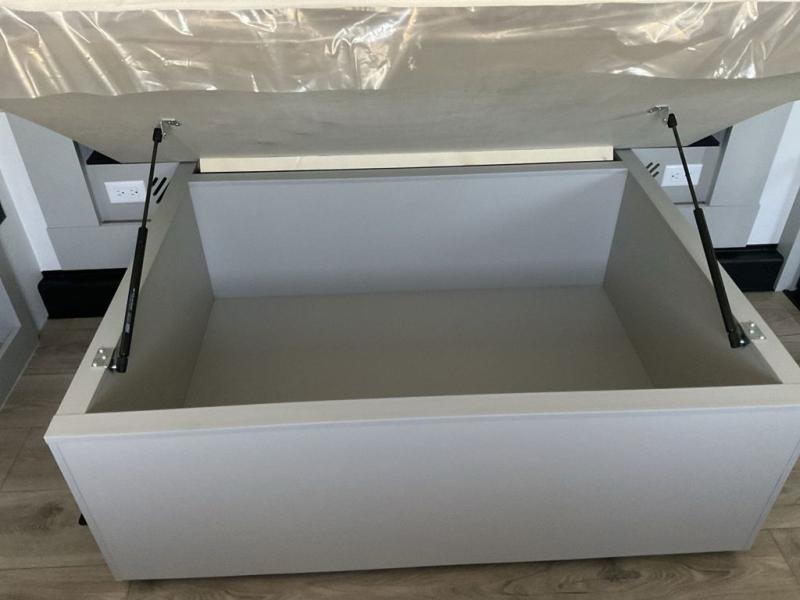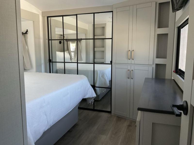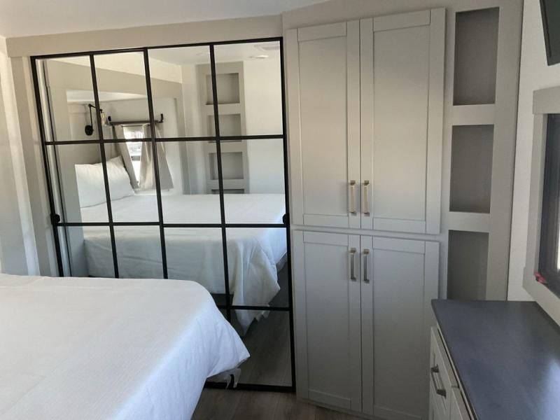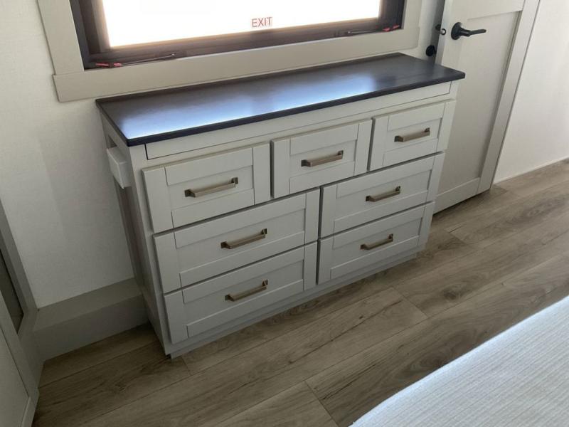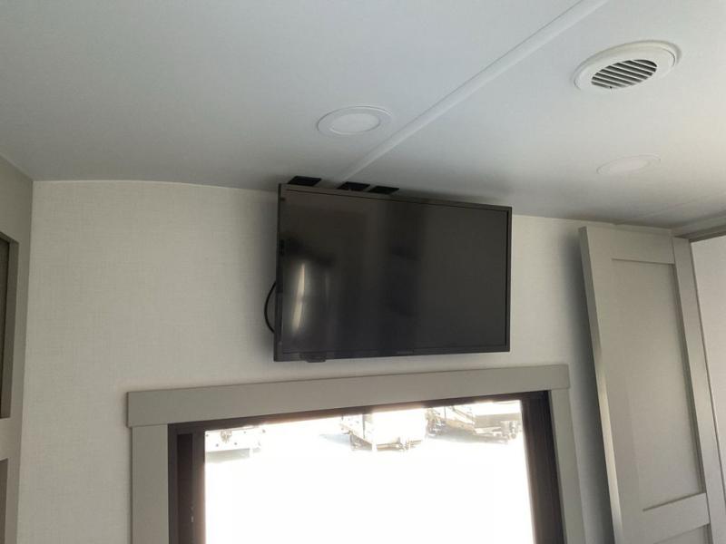 This unit is perfect for your family that needs sleeping space for eight! There is ample seating with a sliding desk/dining table, 62" theater seating, and a 72" tri-fold sofa along the rear wall. You can easily relax and enjoy the telescoping TV with a cozy fireplace below. The kitchen offers all that you need to prepare and cook meals just like home with a 16 cu. ft. refrigerator for your perishables, a 30" residential microwave oven, and three burner range top and oven. You will love the kitchen island all outfitted with pull-out pet bowls and double pull out trash bins with an integrated Stow & Go paper towel holder. There is also an 84" pantry with adjustable shelves for all of your canned and dry goods. Mid-coach, just ahead through the main entry, is a bonus room that can be used as a bedroom featuring a sofa bed with flip-up overhead bunk and trundle below, or an office with pull-out desk so that you can work easily while you travel, or it could also be used as a gaming room since there is also a 50" Smart TV. Head up the steps to a bathroom on your left and a private master suite with king bed slide all the way up front. A sliding dresser top features hidden storage which is perfect for jewelry and other personal belongings. The front wardrobe features mirrored doors and the corner closet has been prepped for a stackable washer and dryer if you choose to add that option.