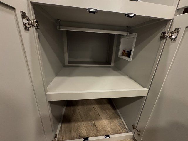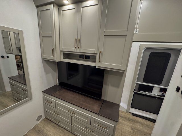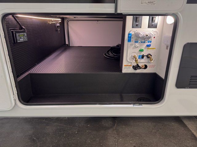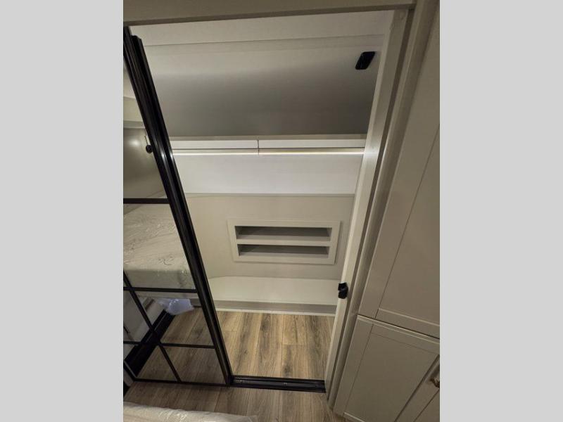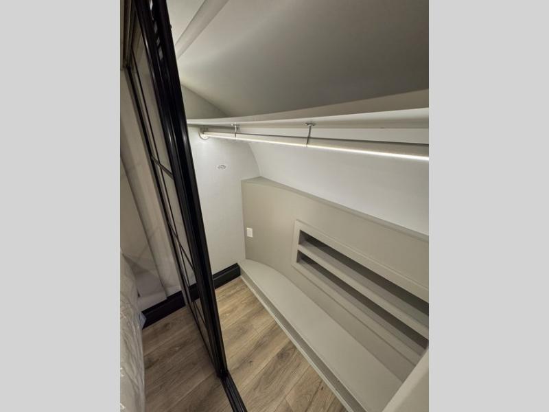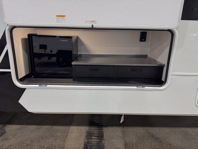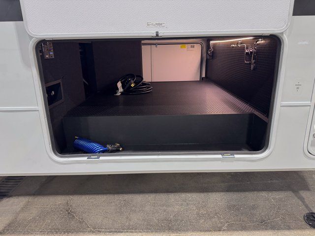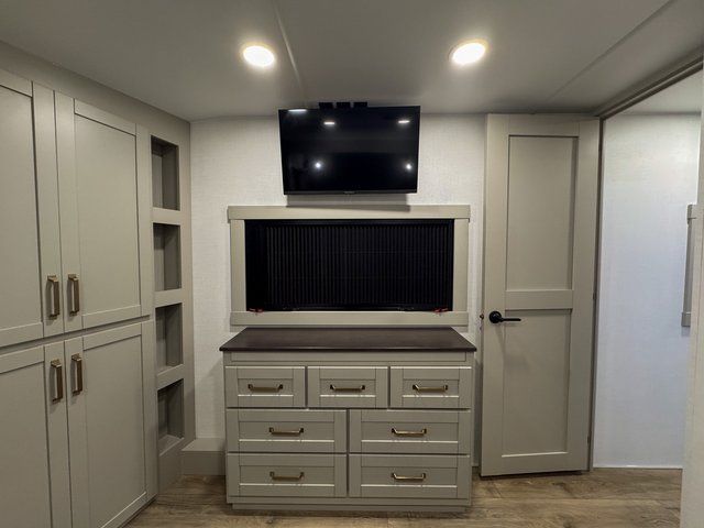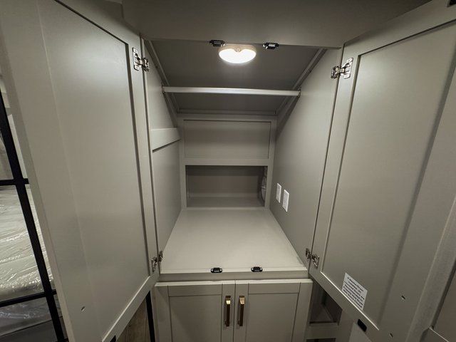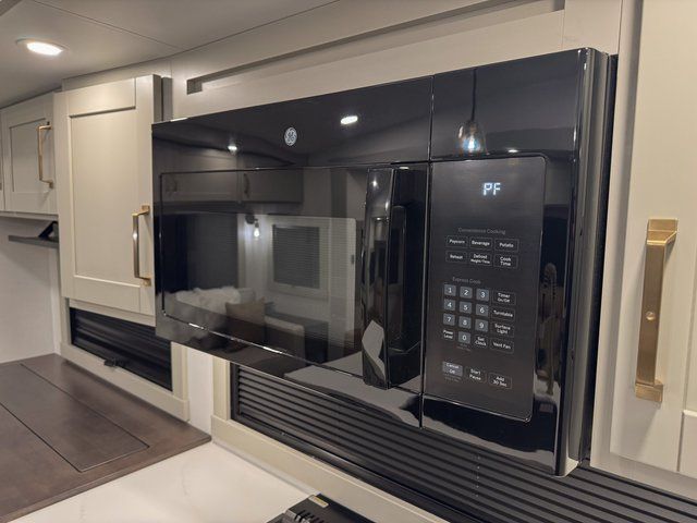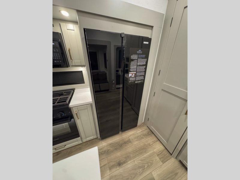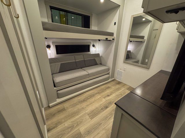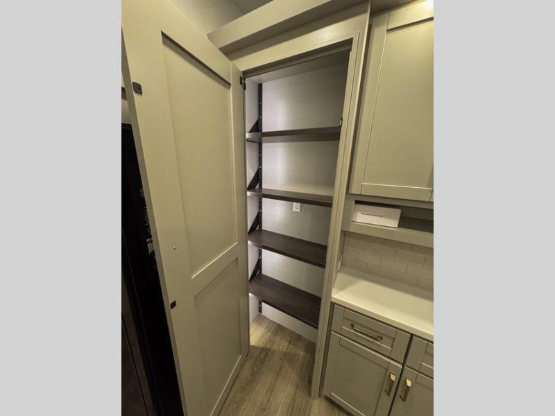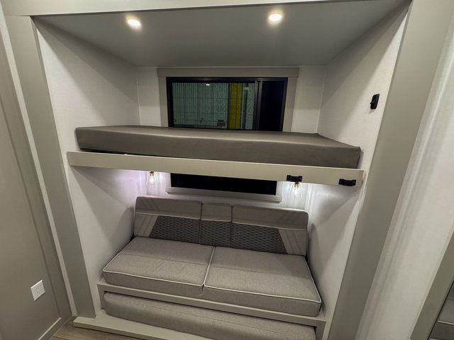 This unit is perfect for your family that needs sleeping space for eight! There is ample seating with a sliding desk/dining table, 62" theater seating, and a 72" tri-fold sofa along the rear wall. You can easily relax and enjoy the telescoping TV with a cozy fireplace below. The kitchen offers all that you need to prepare and cook meals just like home with a 16 cu. ft. refrigerator for your perishables, a 30" residential microwave oven, and three burner range top and oven. You will love the kitchen island all outfitted with pull-out pet bowls and double pull out trash bins with an integrated Stow & Go paper towel holder. There is also an 84" pantry with adjustable shelves for all of your canned and dry goods. Mid-coach, just ahead through the main entry, is a bonus room that can be used as a bedroom featuring a sofa bed with flip-up overhead bunk and trundle below, or an office with pull-out desk so that you can work easily while you travel, or it could also be used as a gaming room since there is also a 50" Smart TV. Head up the steps to a bathroom on your left and a private master suite with king bed slide all the way up front. A sliding dresser top features hidden storage which is perfect for jewelry and other personal belongings. The front wardrobe features mirrored doors and the corner closet has been prepped for a stackable washer and dryer if you choose to add that option.