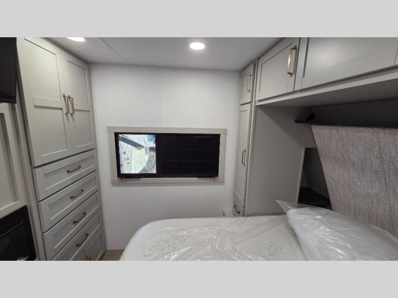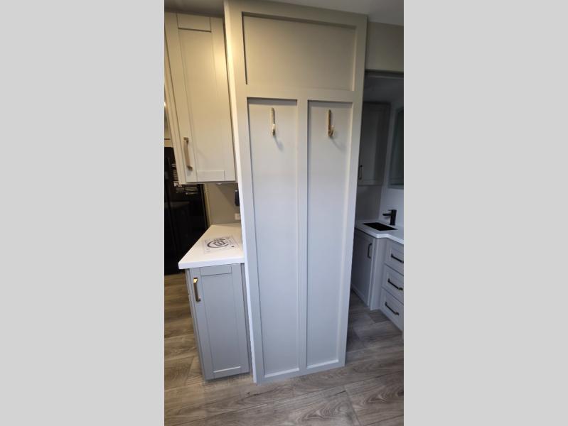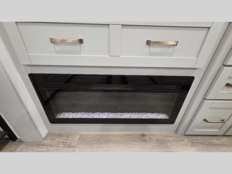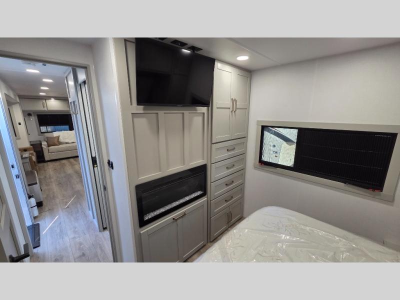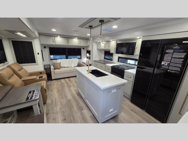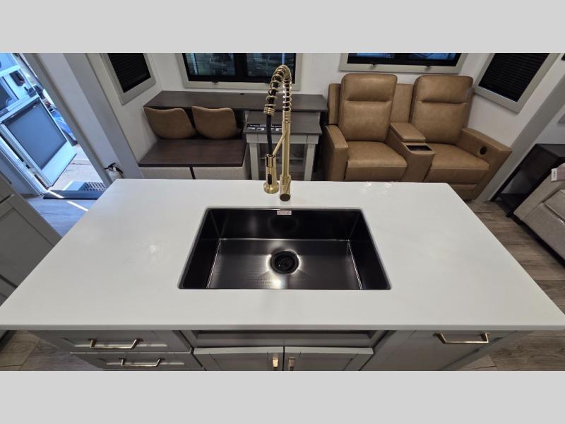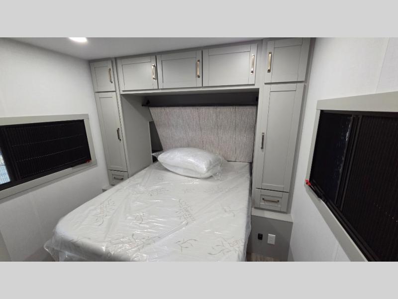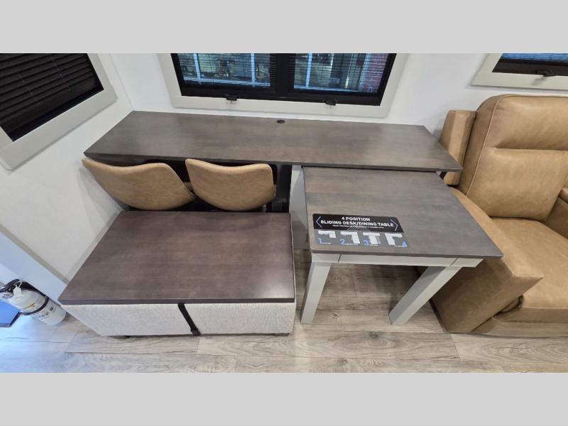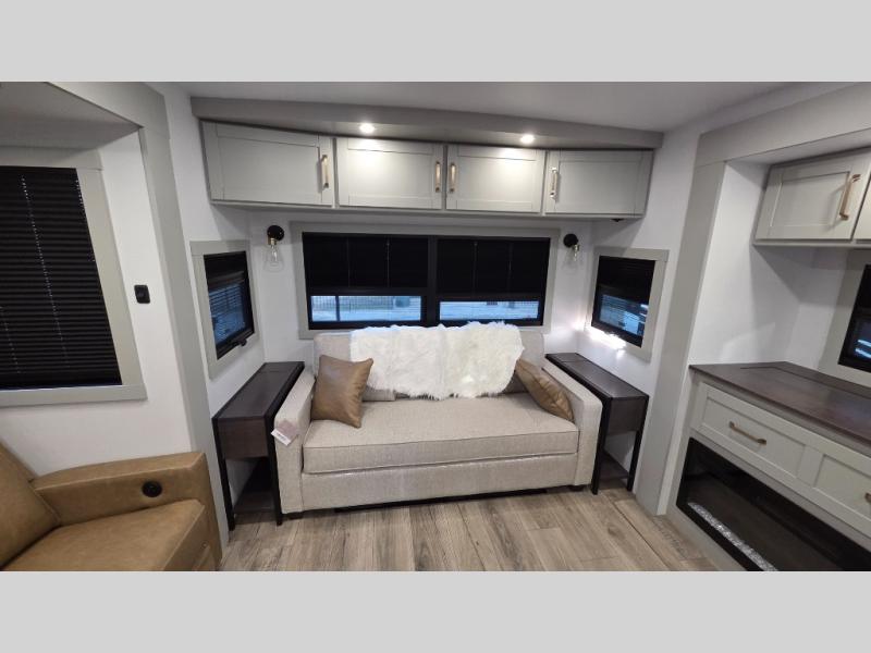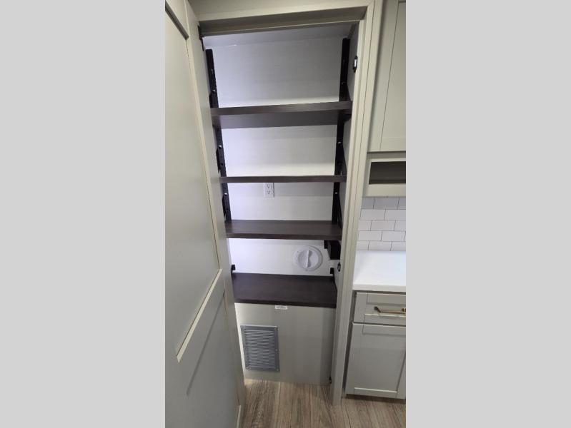 This travel trailer is spacious thanks to the dual opposing slides in the combined kitchen and living area. There is a rear 72" tri-fold sofa here, theater seating, and a sliding desk/dining table. The televator and fireplace will let you relax each evening with a movie or good book, and the full kitchen lets you make meals wherever you go. The chef of your group will also appreciate the pantry with adjustable shelving for all their ingredients, a hutch, 30" residential microwave, and even a pull-out trash bin for easy clean-up. When you're ready to call it a night, the front private bedroom will be waiting for you. This room includes a queen bed with four underbed drawers, a closet with pass-thru access to the bathroom closet, plus washer and dryer prep if you want the option to go full-time!