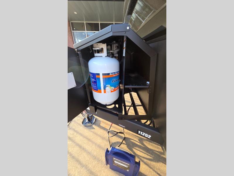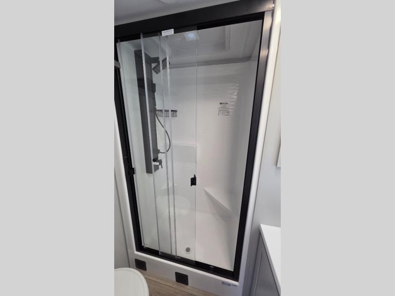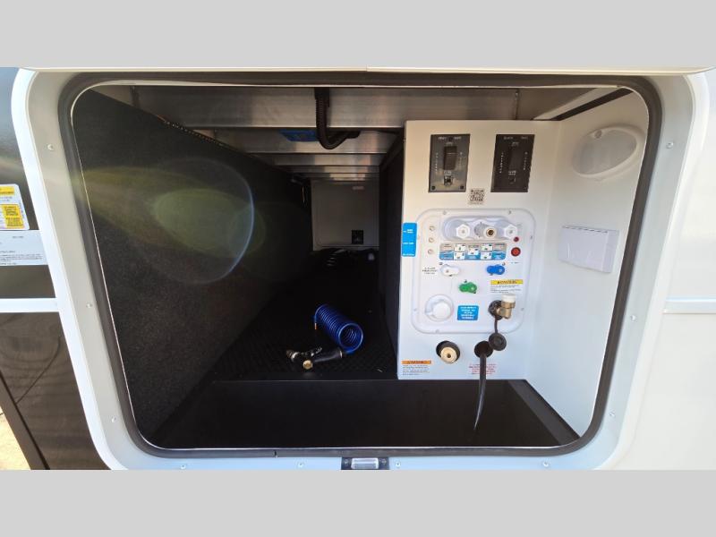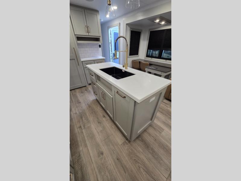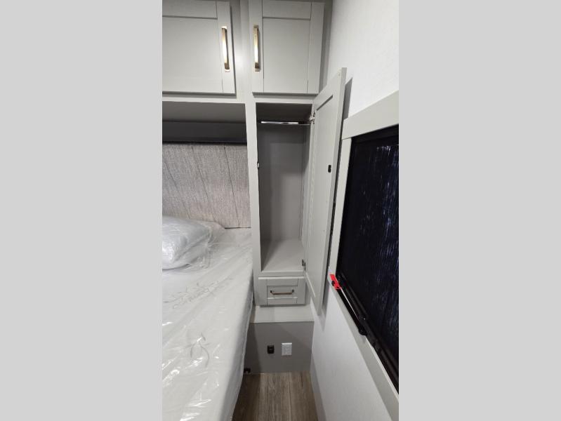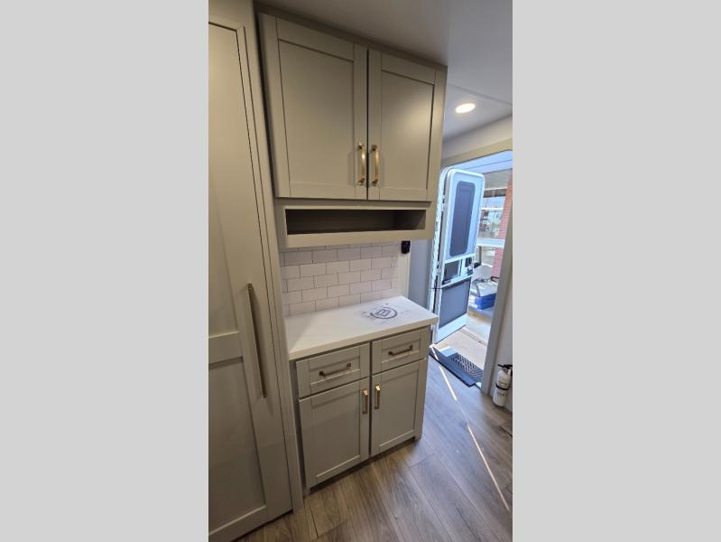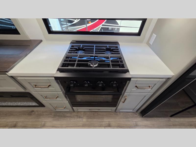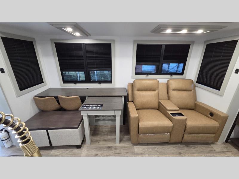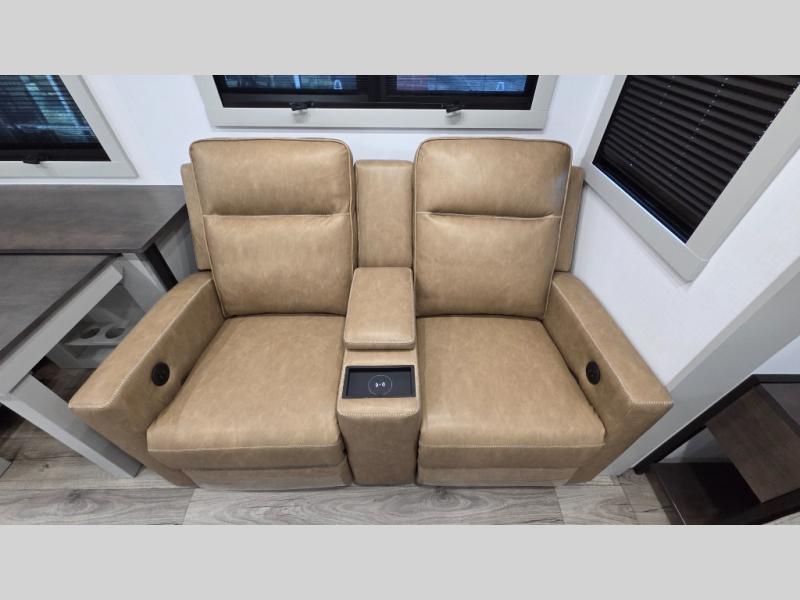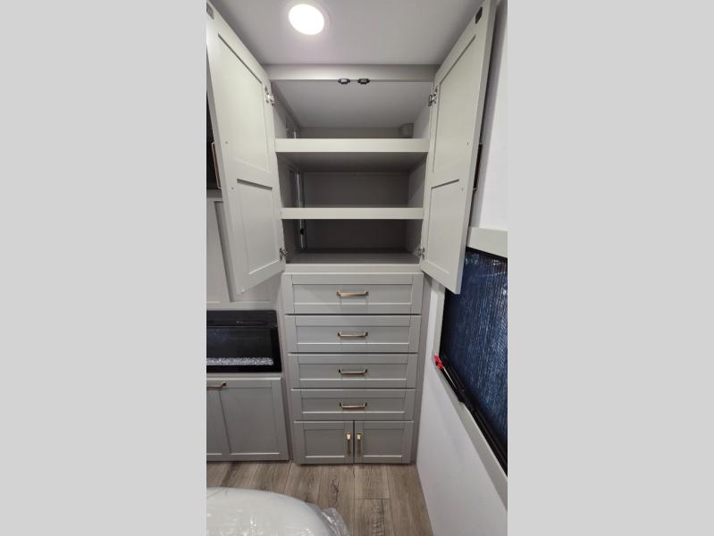 This travel trailer is spacious thanks to the dual opposing slides in the combined kitchen and living area. There is a rear 72" tri-fold sofa here, theater seating, and a sliding desk/dining table. The televator and fireplace will let you relax each evening with a movie or good book, and the full kitchen lets you make meals wherever you go. The chef of your group will also appreciate the pantry with adjustable shelving for all their ingredients, a hutch, 30" residential microwave, and even a pull-out trash bin for easy clean-up. When you're ready to call it a night, the front private bedroom will be waiting for you. This room includes a queen bed with four underbed drawers, a closet with pass-thru access to the bathroom closet, plus washer and dryer prep if you want the option to go full-time!