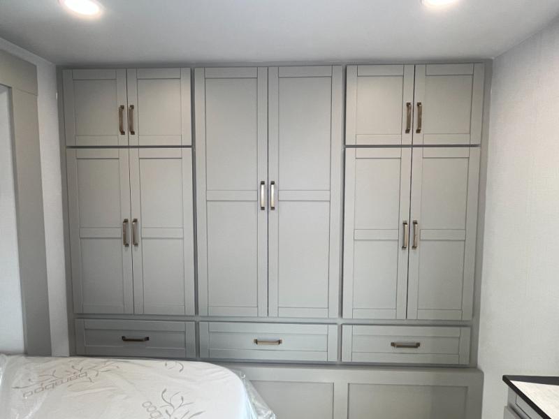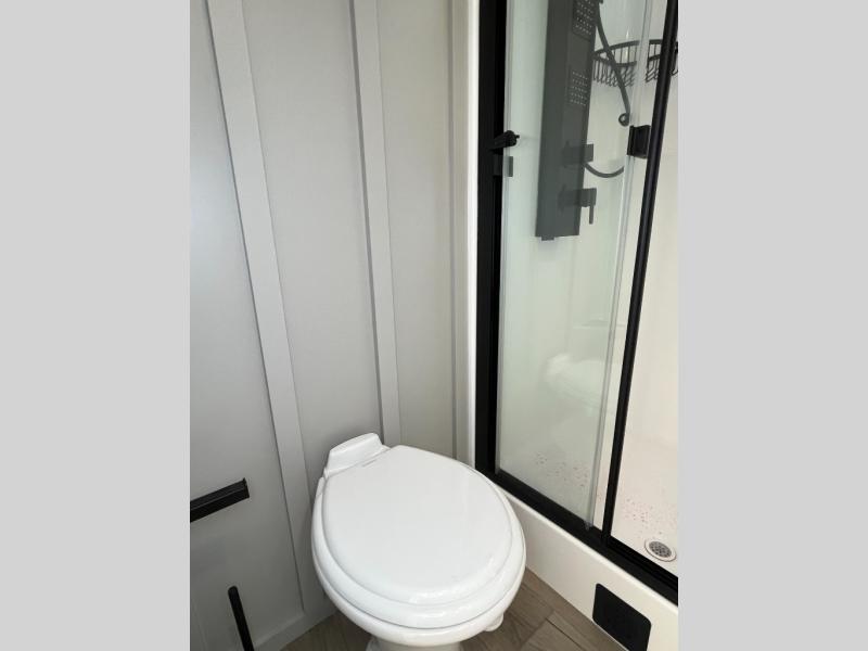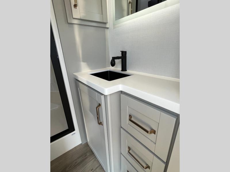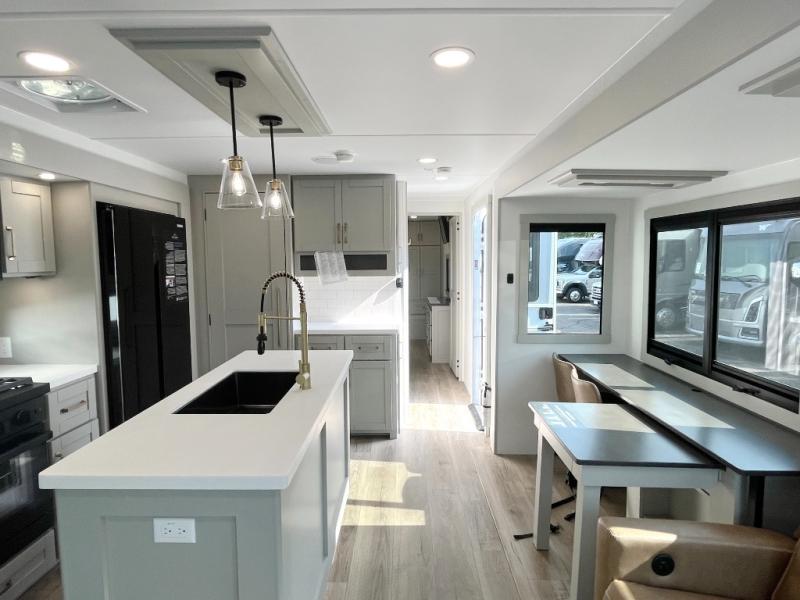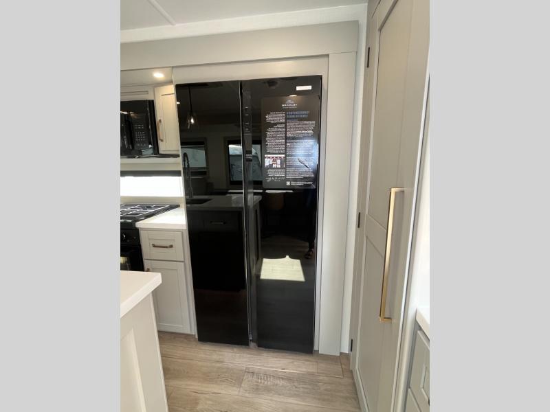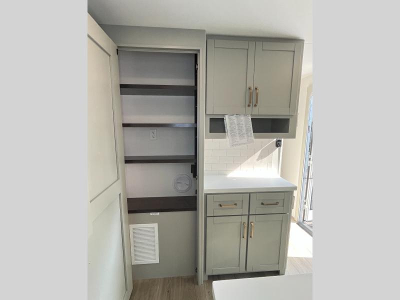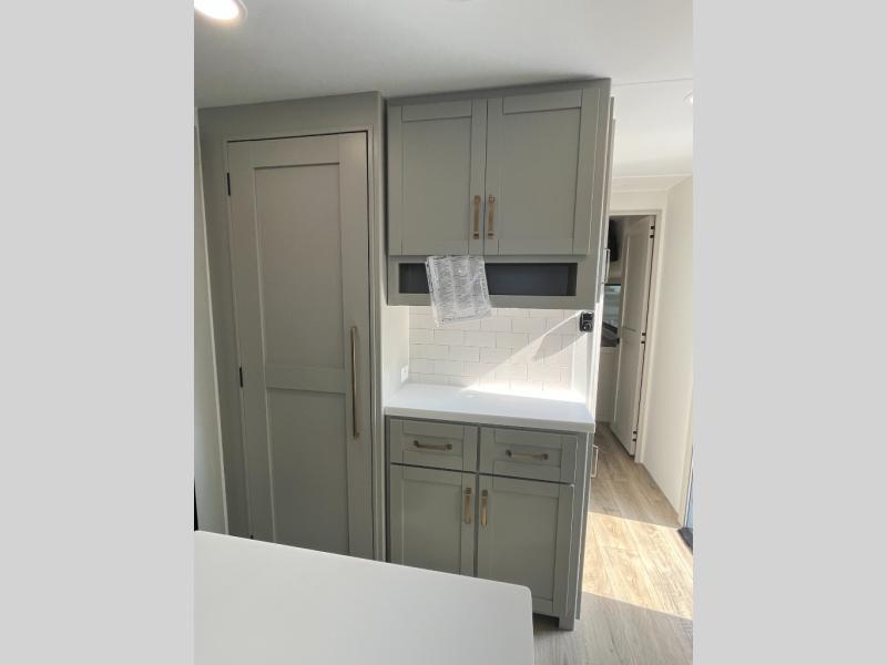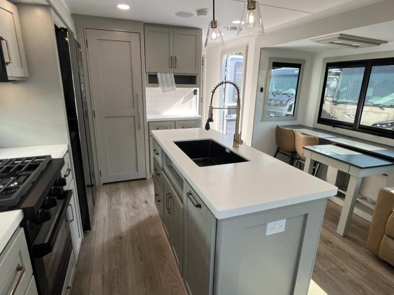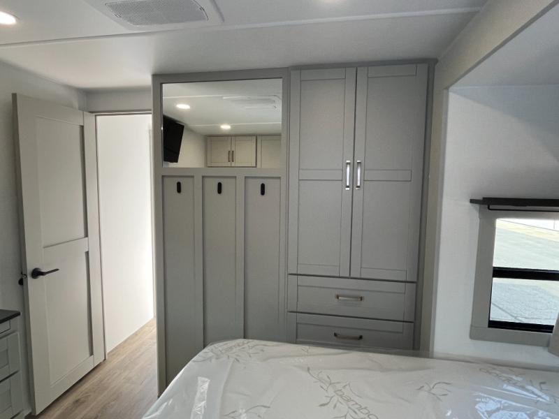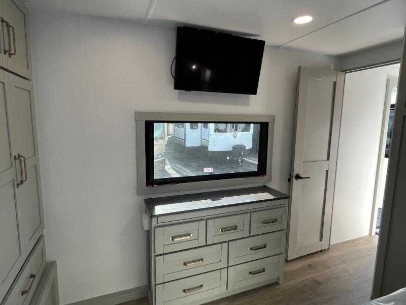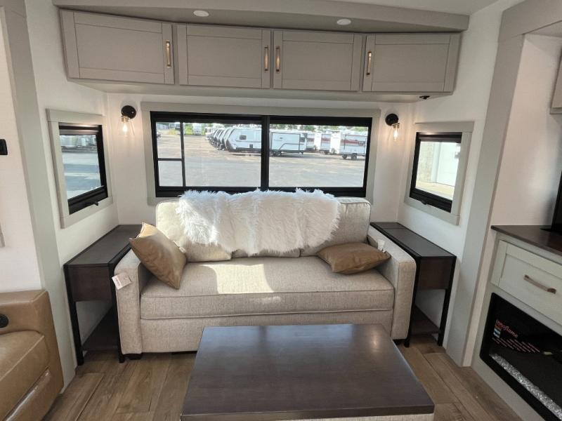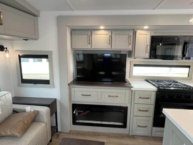 You will love all the space and features in this travel trailer! A luxurious rear living room offers plenty of room to spread out, with a 72" tri-fold sofa plus theater seats, all arranged with a perfect view of the 50" TV over the fireplace. A central kitchen area includes an island with hidden pet bowls. Find even more storage with the hutch plus pantry with adjustable shelves. The front bedroom comes with a queen bed, but if you'd like you can upgrade to a king for even more room. No matter which you choose, you will enjoy watching the 32" bedroom TV. The full-width wardrobe has room for all of your clothes and also includes prep for an optional washer and dryer. And the full bath includes a 30" x 42" one-piece fiberglass shower. Outside you'll enjoy two awnings, pass-through storage, and LED chassis lighting.
