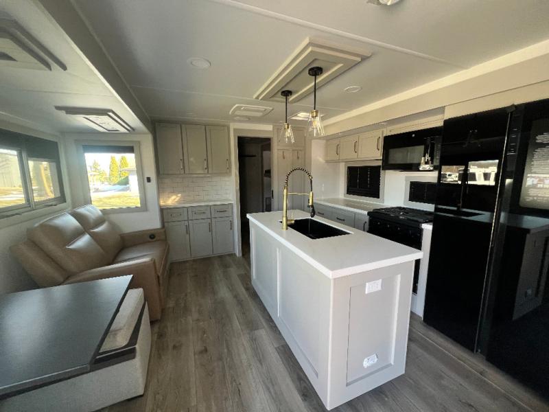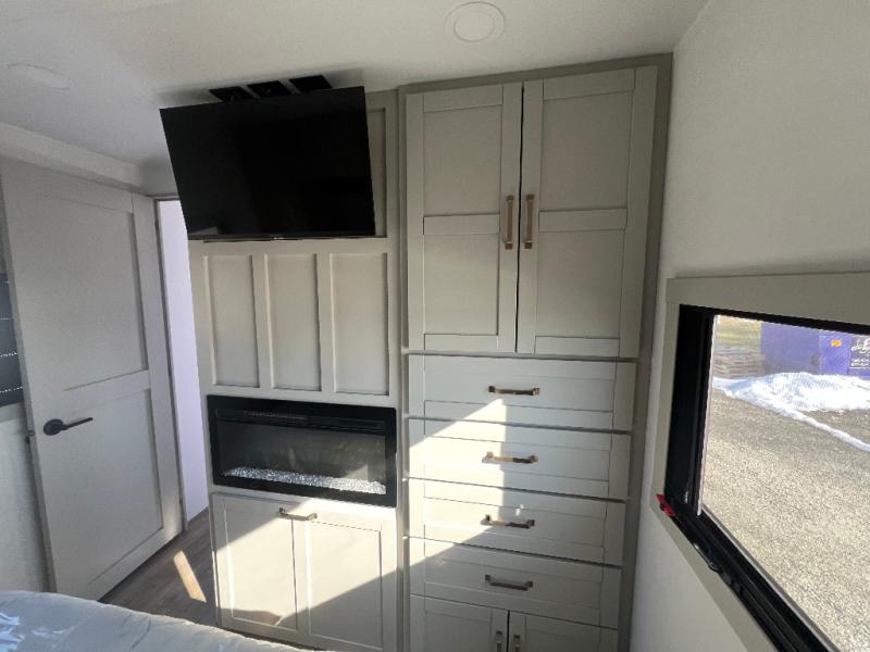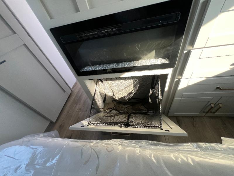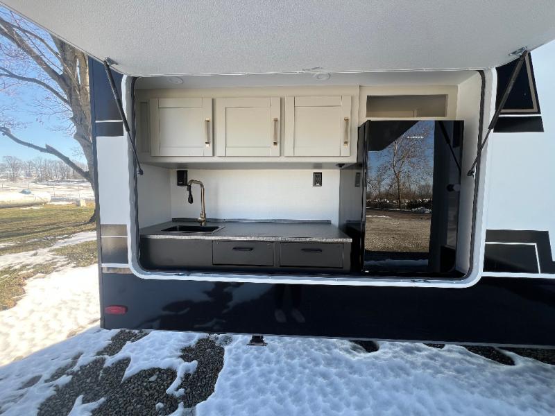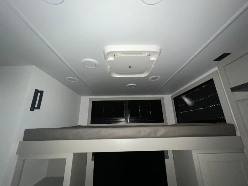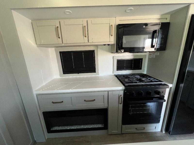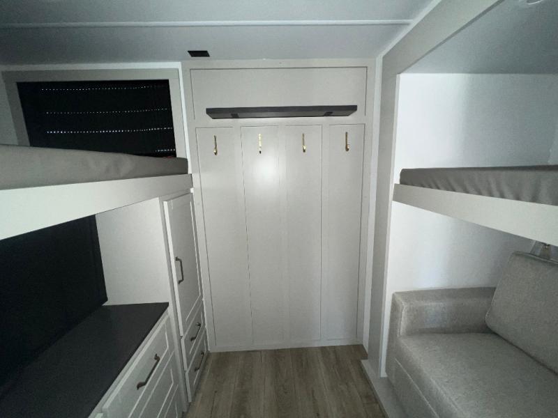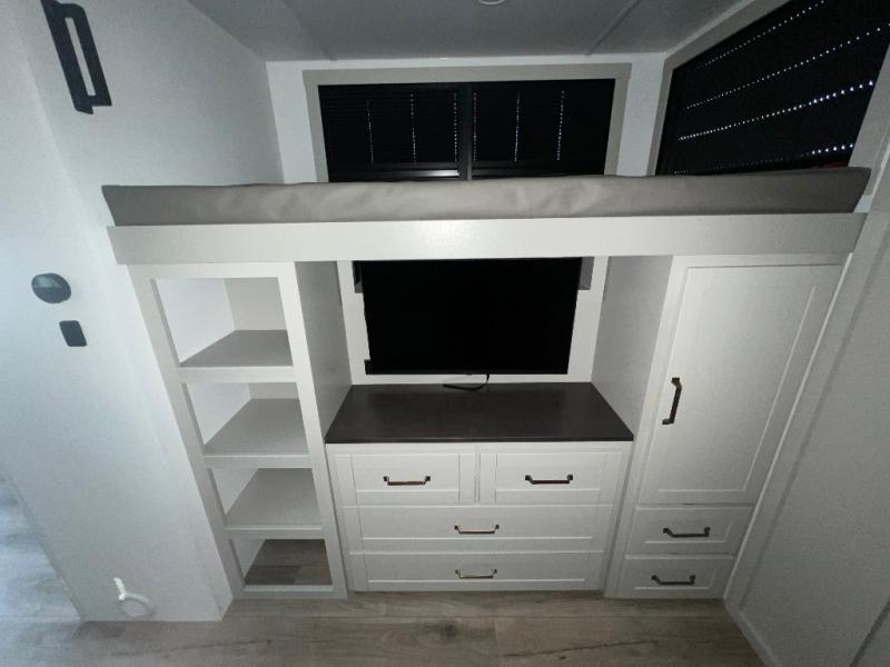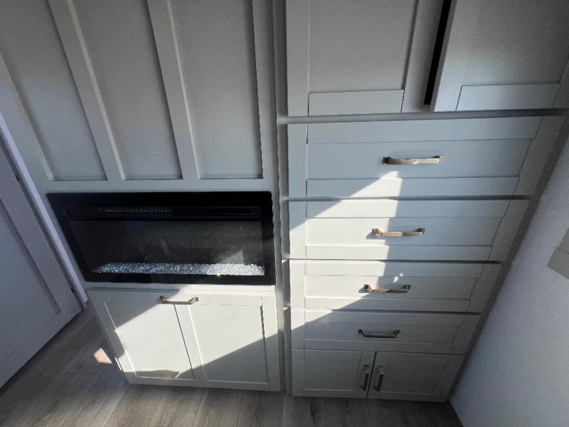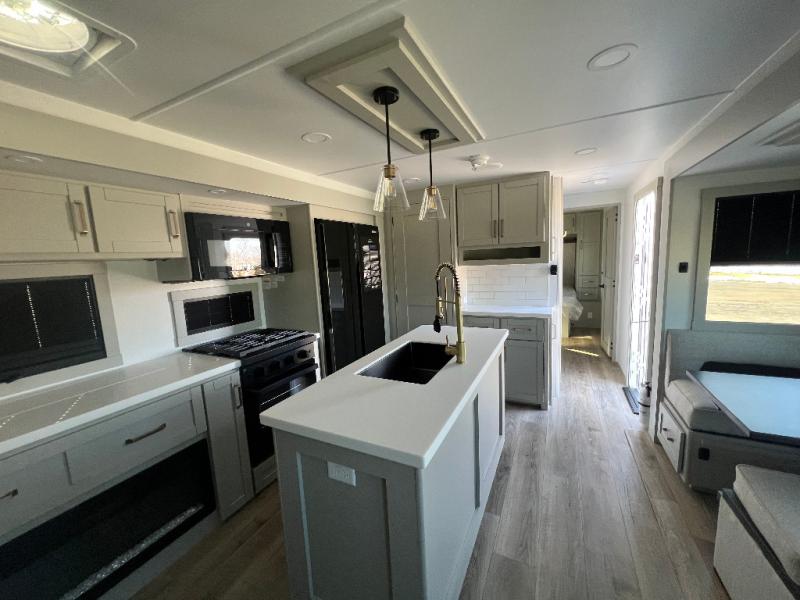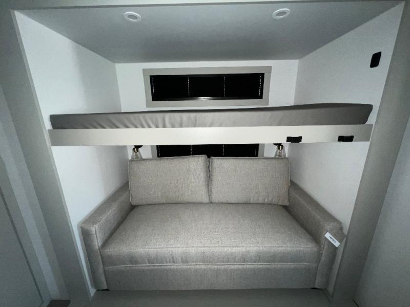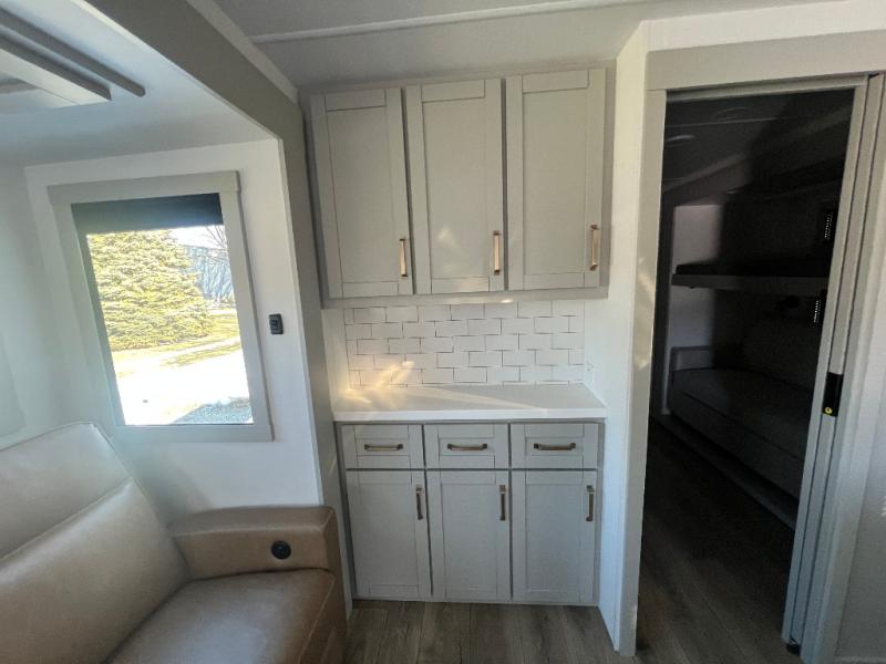 The whole gang will love camping in this spacious travel trailer for six to seven! Your guests or little ones will have the rear bunkhouse all to themselves, which includes a tri-fold sofa with a reclining back, a flip-up bunk, plus a second bunk bed across the room for even more sleeping space. There is even a bunkroom 42" Smart TV with a wardrobe for entertainment and storage! The front private bedroom includes a walk-around queen bed with four under-bed drawers for clothes, extra blankets and more. Head to the combined kitchen and living room to prep dinner on the kitchen island, relax on the theater seating, and dine at the sleeper dinette. There is also a pantry with adjustable shelves here, along with a hutch, 16 cu. ft. refrigerator that opens with the slide out, plus a televator and fireplace to make your space feel more like home! Outside, you'll find two power awnings, LED ground lighting, drop-frame pass-thru storage, and an outdoor kitchen with a refrigerator, sink, and storage!