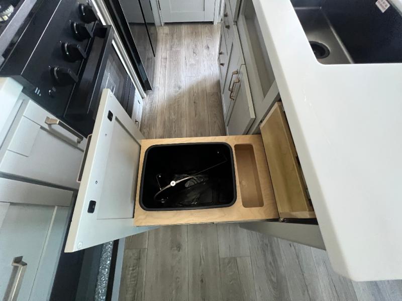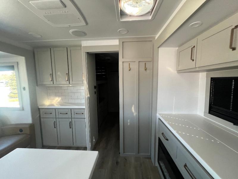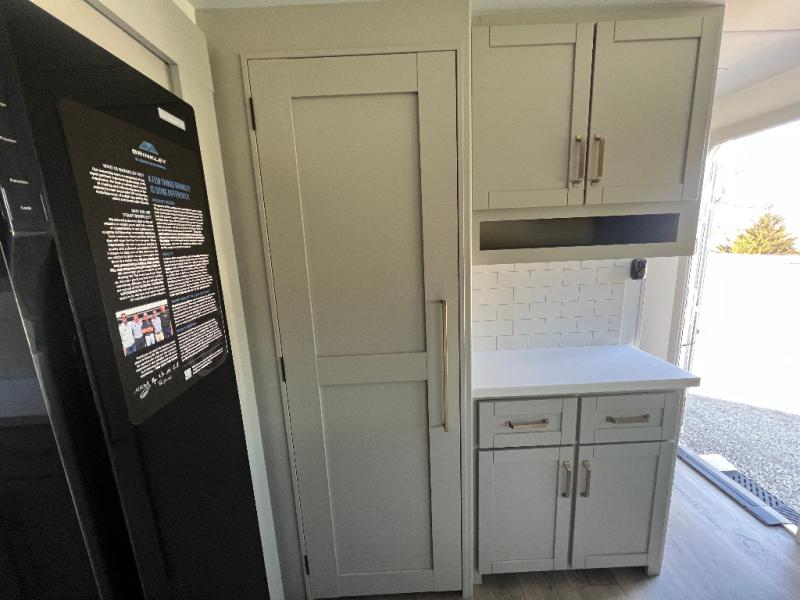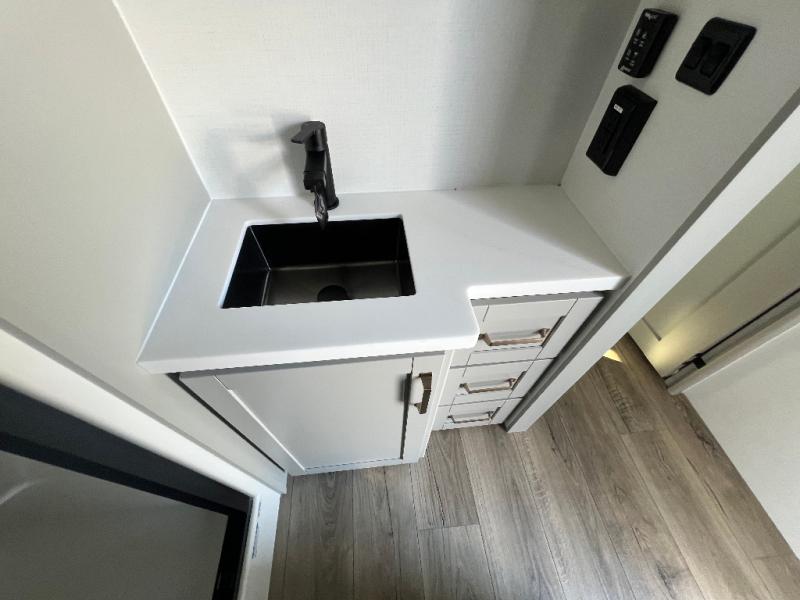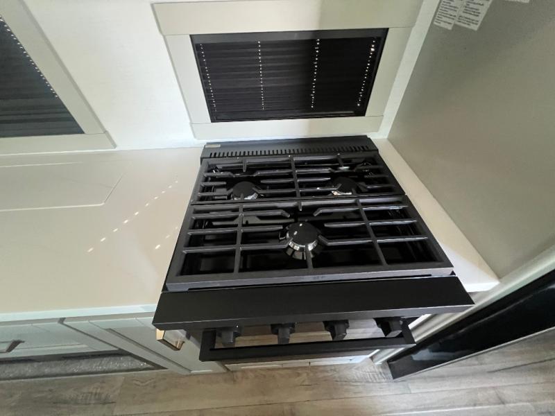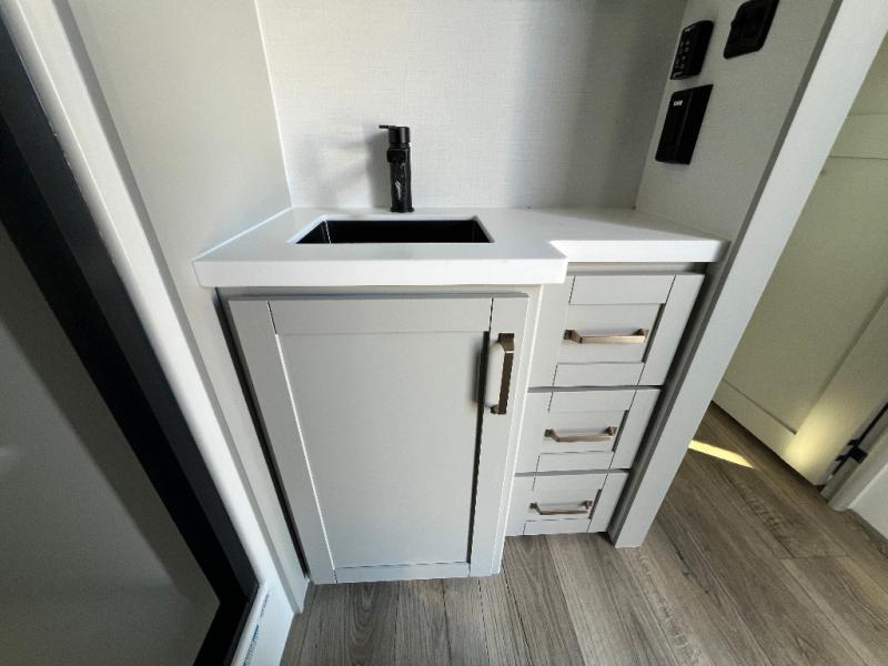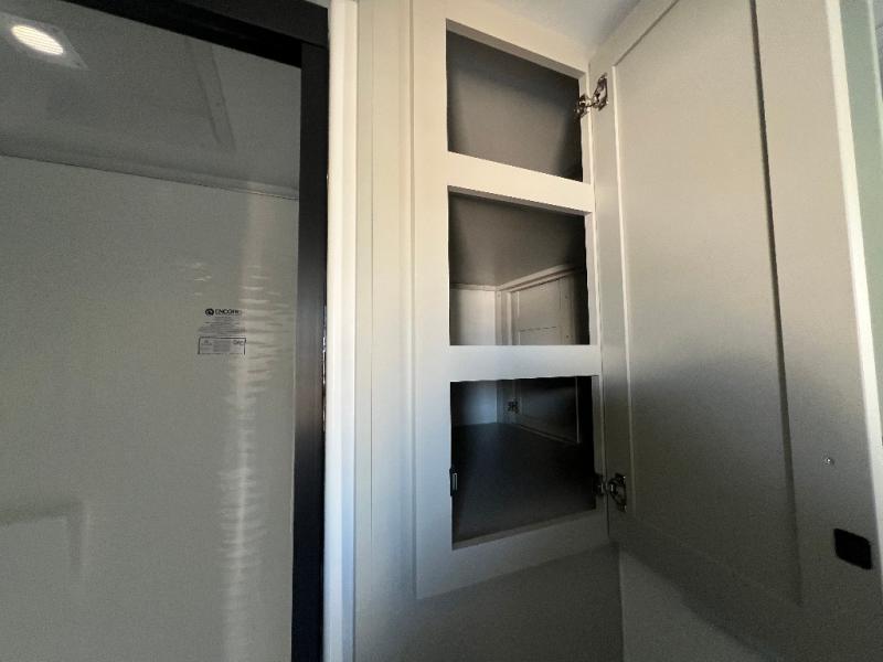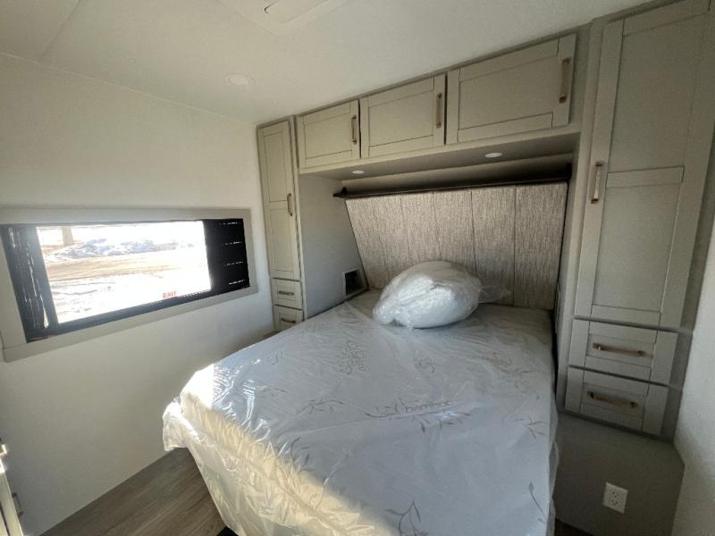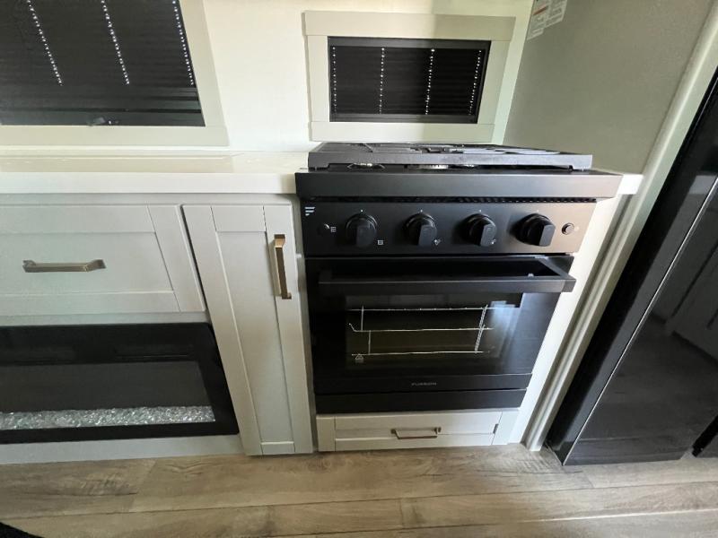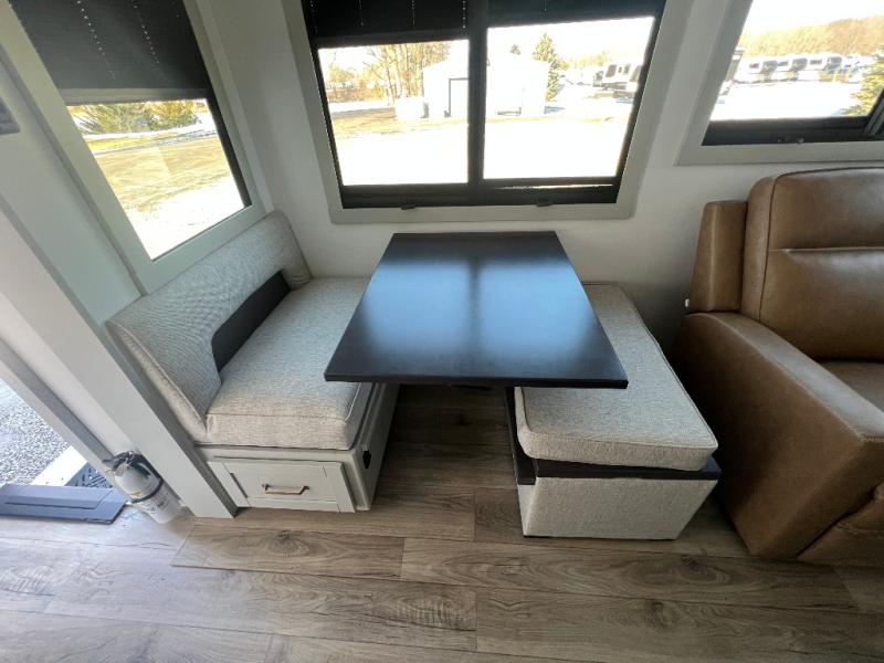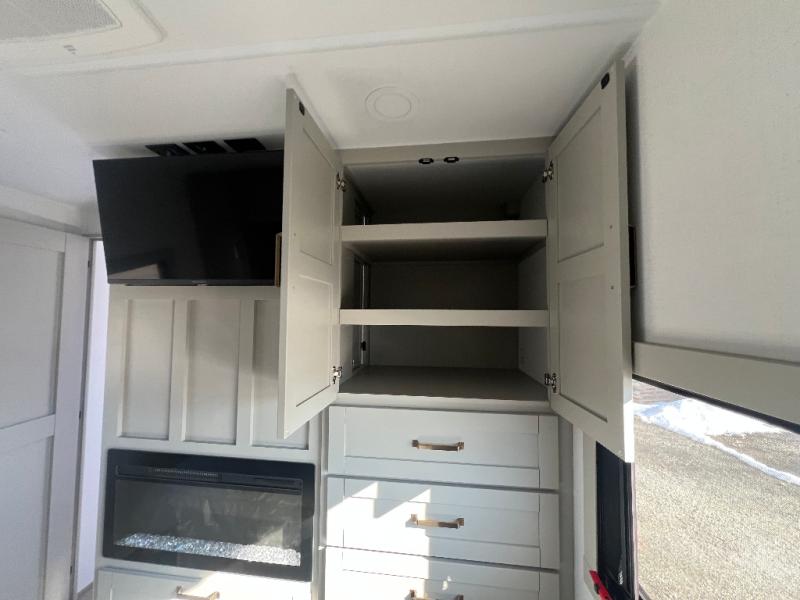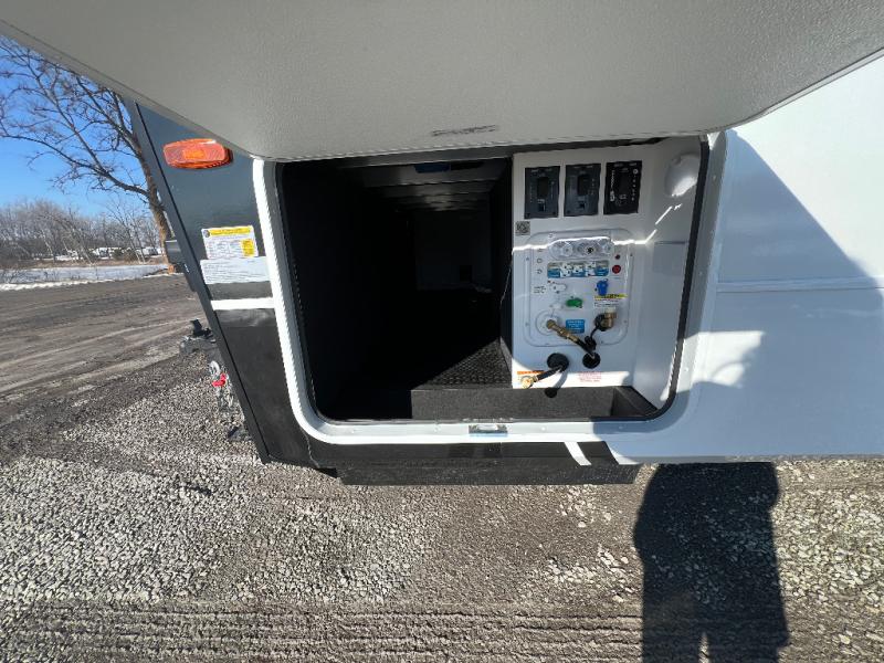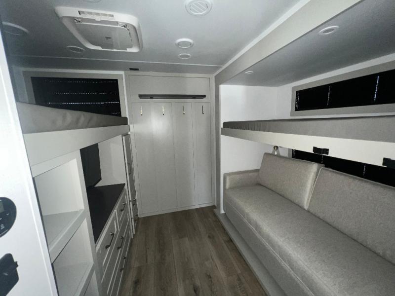 The whole gang will love camping in this spacious travel trailer for six to seven! Your guests or little ones will have the rear bunkhouse all to themselves, which includes a tri-fold sofa with a reclining back, a flip-up bunk, plus a second bunk bed across the room for even more sleeping space. There is even a bunkroom 42" Smart TV with a wardrobe for entertainment and storage! The front private bedroom includes a walk-around queen bed with four under-bed drawers for clothes, extra blankets and more. Head to the combined kitchen and living room to prep dinner on the kitchen island, relax on the theater seating, and dine at the sleeper dinette. There is also a pantry with adjustable shelves here, along with a hutch, 16 cu. ft. refrigerator that opens with the slide out, plus a televator and fireplace to make your space feel more like home! Outside, you'll find two power awnings, LED ground lighting, drop-frame pass-thru storage, and an outdoor kitchen with a refrigerator, sink, and storage!