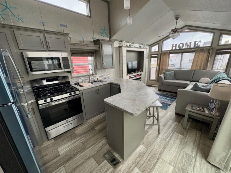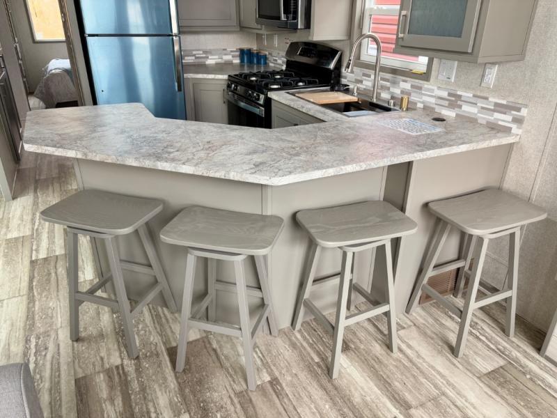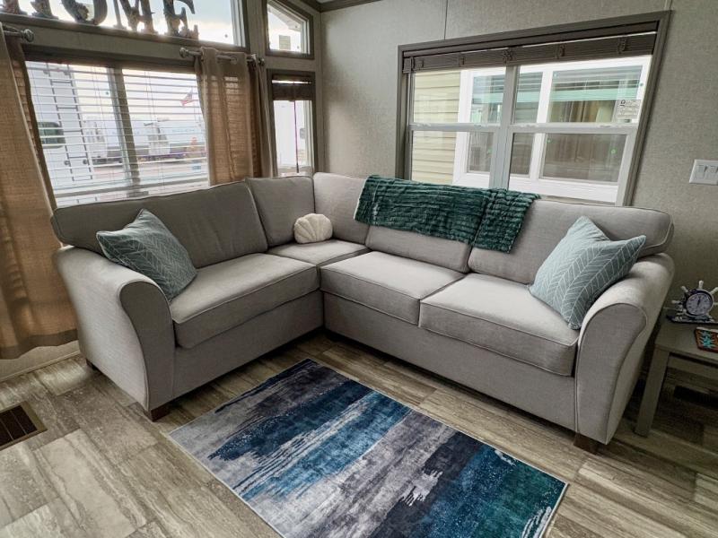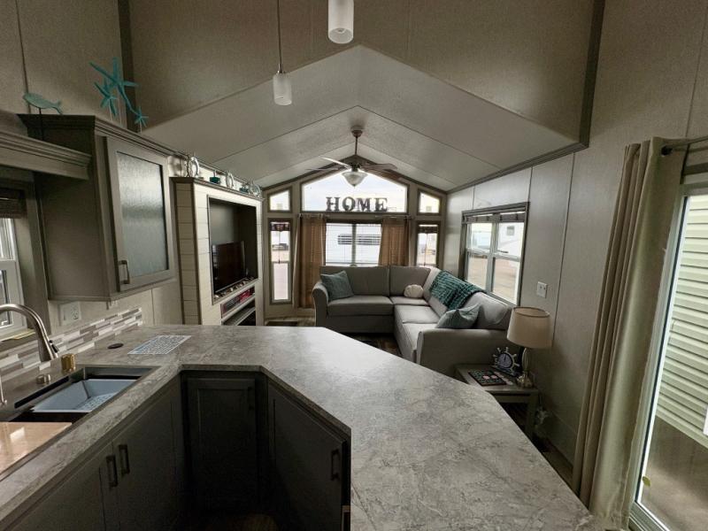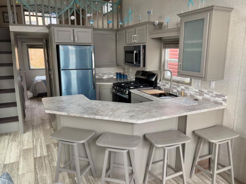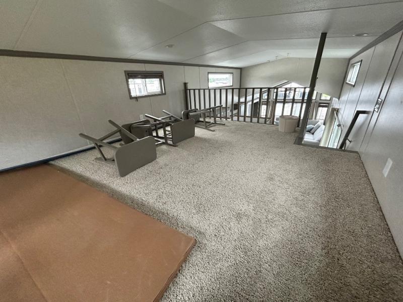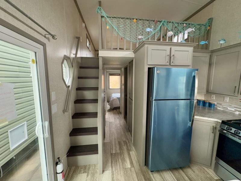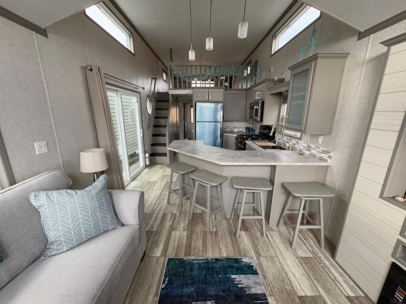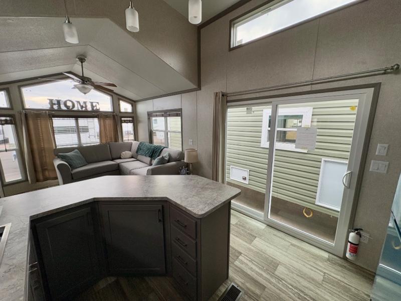 Ready or not the comforts of your own bedding, furniture, kitchen and bath amenities will be waiting for you in this park model at your ranch, lake spot or farm. As you enter the patio doors after a long work week, you can drop off all the food on the raised counter and head back to the rear bedroom to place your clothes and things in the closets with drawers, the chest, and on the nightstands. You might want to take a nap on the Eurotop residential queen bed, yet you will need to put up the cold food in the 17.5 cu. ft. frost free refrigerator first. You will surely love all the kitchen counter space including the raised area to dine at. You might like to replace the hide-a-bed sofa with an L-shaped sofa option in the front living area. And don't worry about the kids, they are probably up stairs in the divided loft placing their sleeping bag and pillow in their spot.